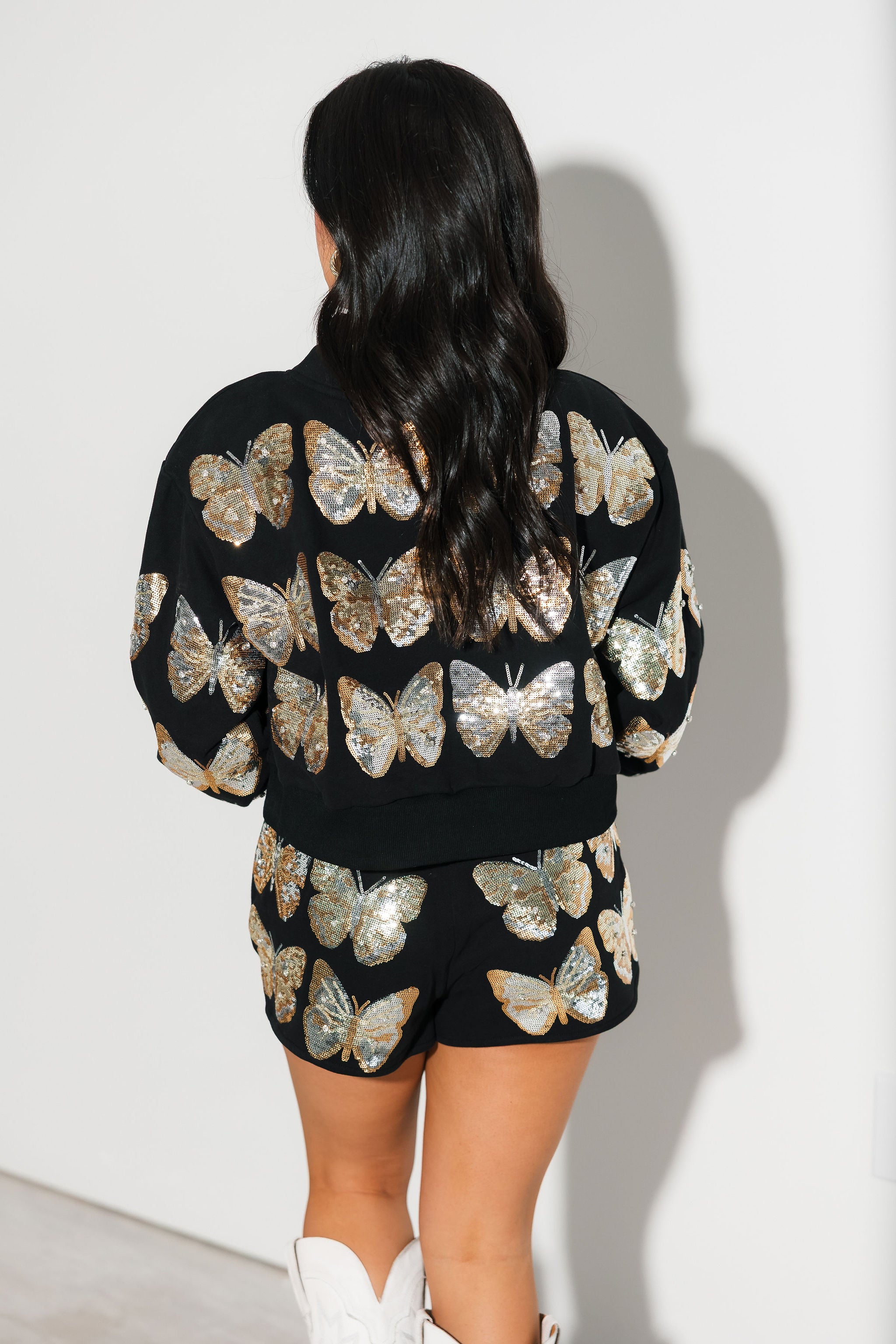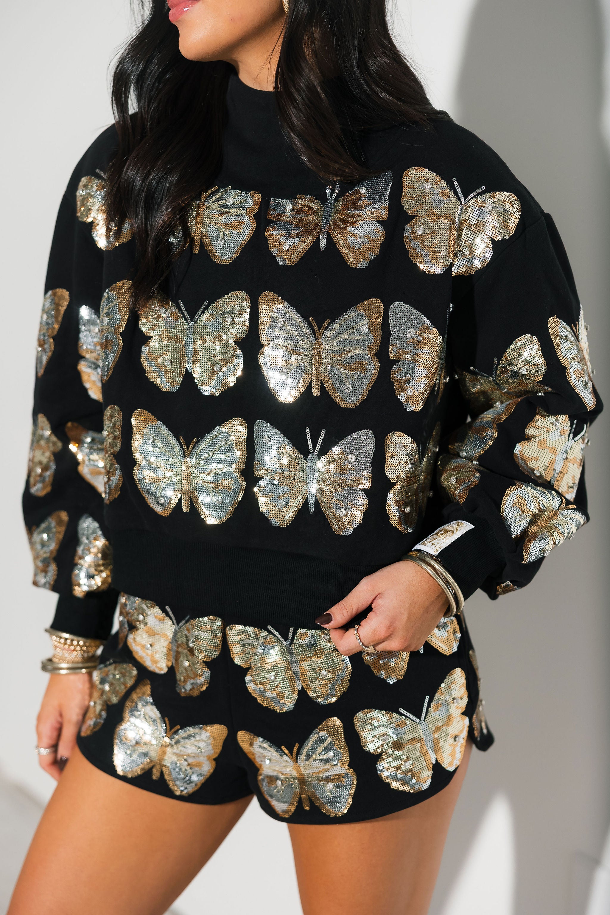 The Queen Of Sparkles Black & Gold Sequin Butterfly Mockneck Sweatshirt is where casual meets chic. With its relaxed fit, cozy mock neckline, and dazzling sequin butterfly embellishments, this sweatshirt is perfect for elevating your everyday look. Pair it with jeans, leggings, or the coordinating sequin butterfly shorts for a complete outfit that shines. Sage is wearing an S.