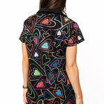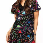 The Queen Of Sparkles Black Groovy Heart Collared Short Sleeve Dress features a relaxed, flowy fit with a V-neck collar, short sleeves, and mini length. Perfect for styling with sneakers or boots for an effortless, standout look.