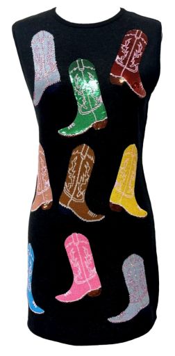The Queen Of Sparkles Black Knit Multi Cowboy Boot Tank Dress features a fitted, stretchy silhouette with a classic crewneck and sleeveless design. Comfortable and flattering, it’s perfect for layering or wearing on its own for a standout, easygoing look.