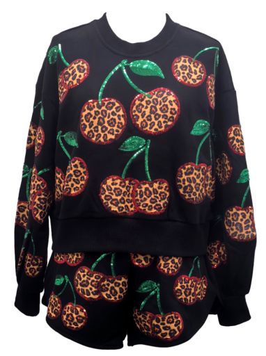 The Queen Of Sparkles Black Leopard Cherry Sweatshirt features a cozy crewneck and long sleeves for a comfortable, easygoing fit. Perfect for layering or wearing on its own, this whimsical piece pairs beautifully with the matching shorts or your favorite casual bottoms.