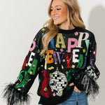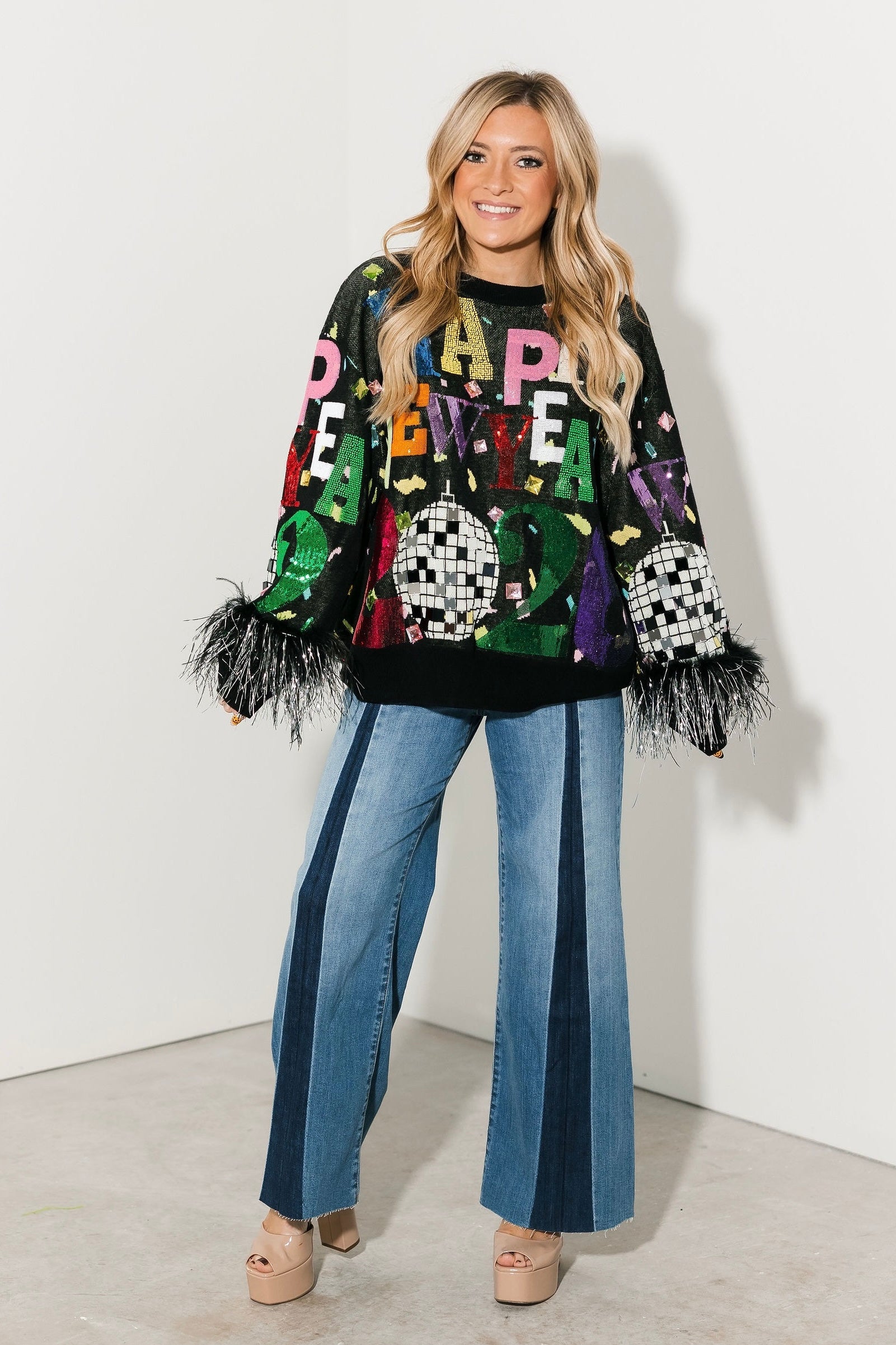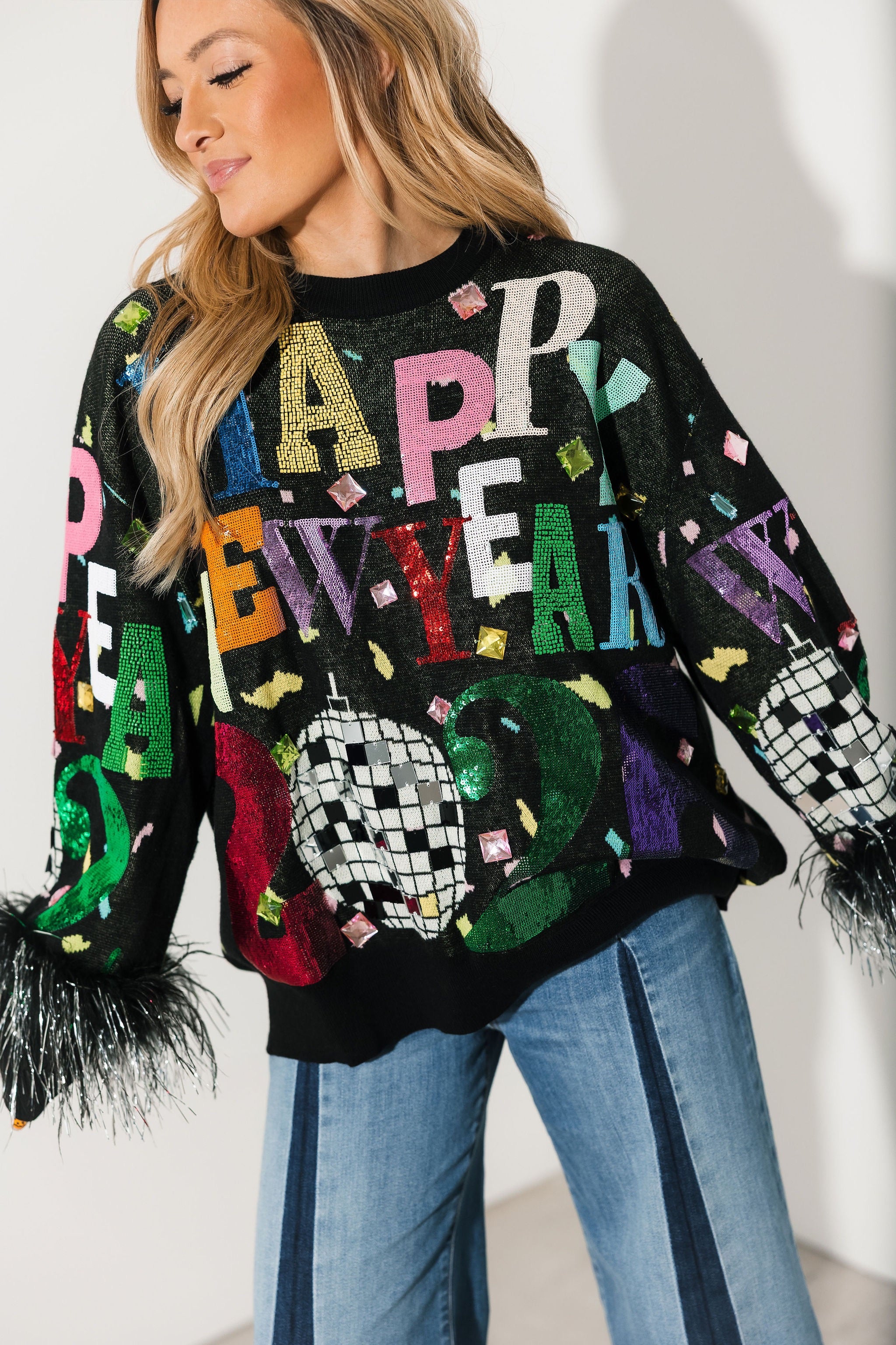 Celebrate in chic, statement-making style with the Queen Of Sparkles Black Multi 'Happy New Year 2026' Feather Sleeve Sweater. Designed with a relaxed fit and classic crew neckline, this festive knit is brought to life with sparkling “Happy New Year” lettering, dazzling disco ball graphics, and dramatic feather-trimmed sleeves. Whether you’re toasting at midnight, hosting friends, or just want to bring a little extra glam to the season, this sweater is the perfect mix of cozy and party-ready. Pair it with leather pants, metallic minis, or sequined skirts for a standout NYE look. Lexi Jade is wearing an XS.
