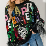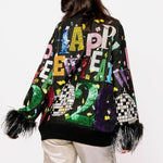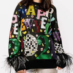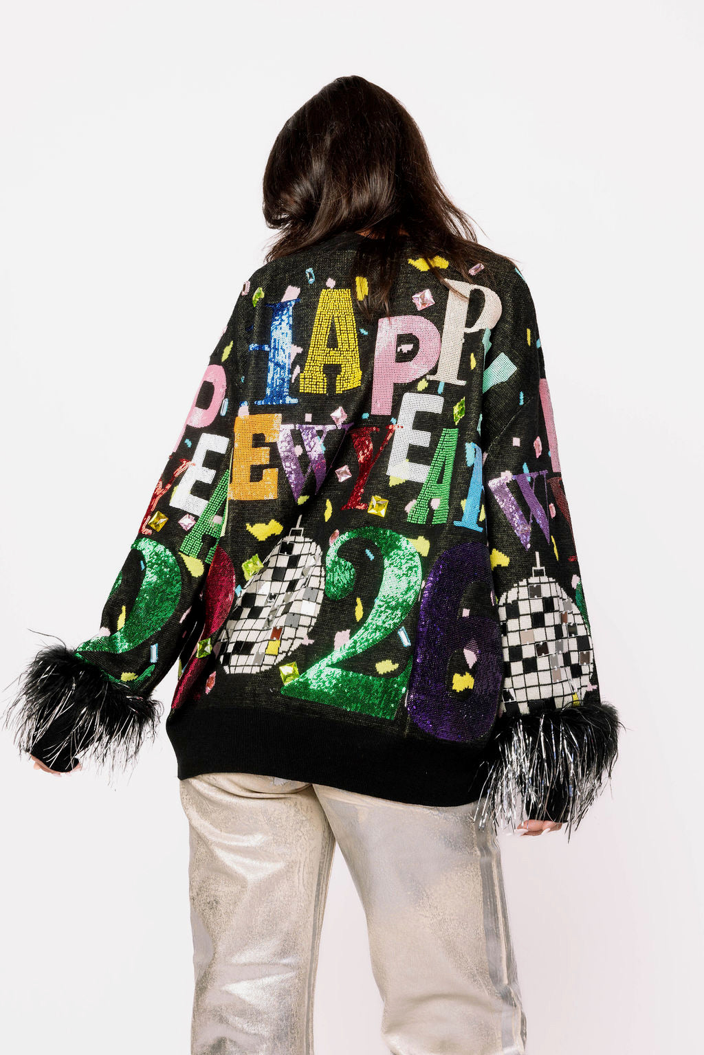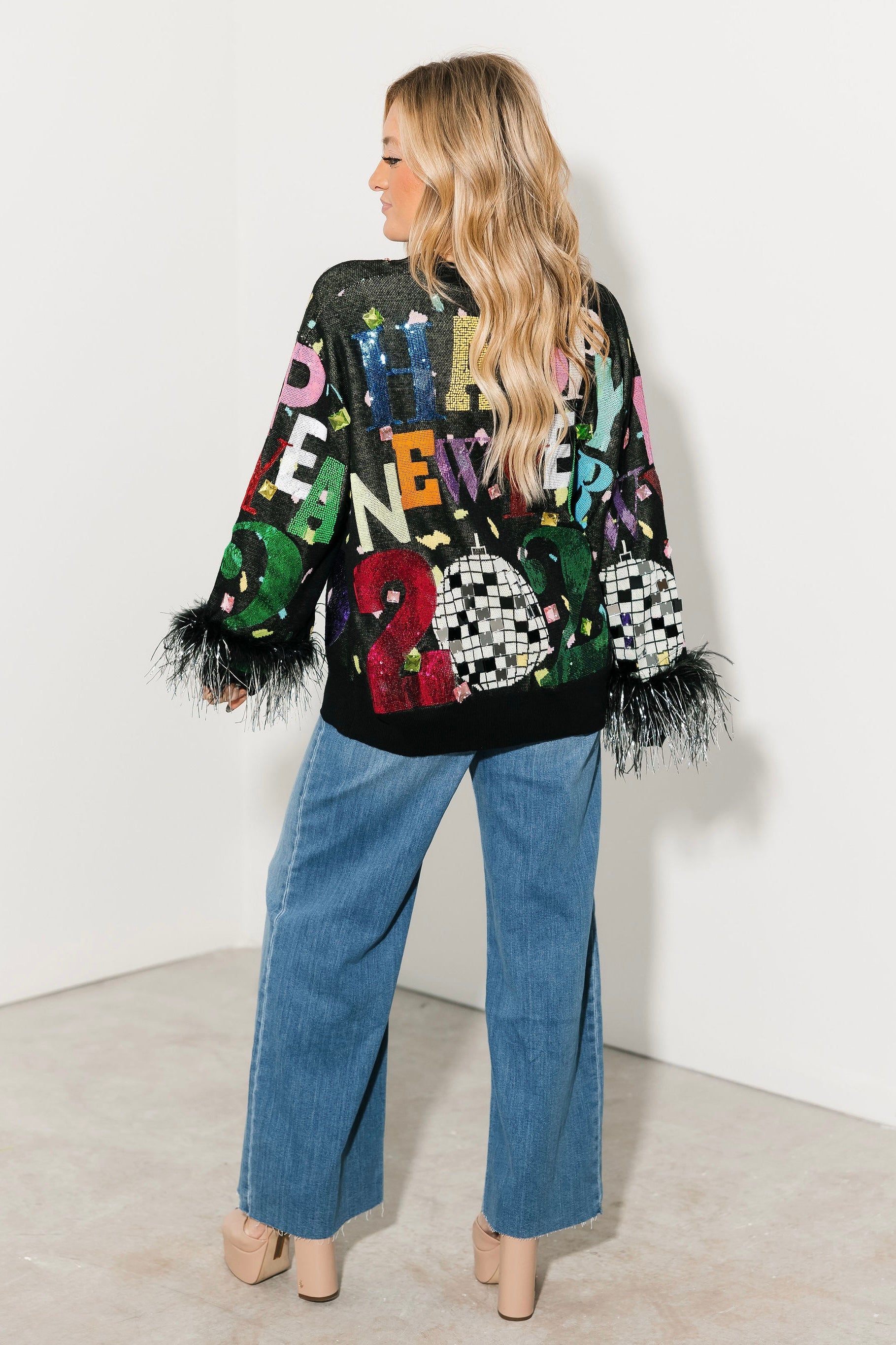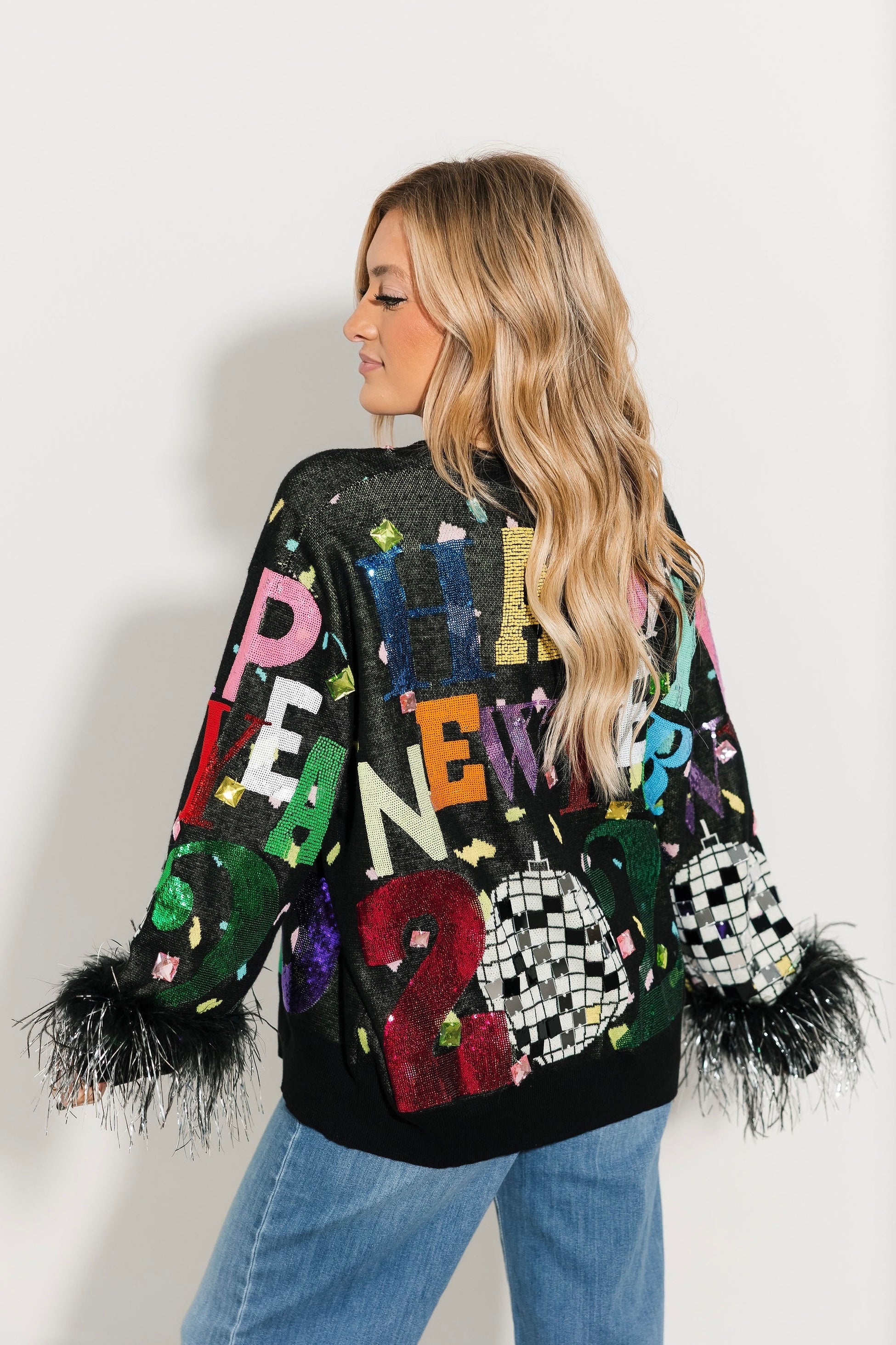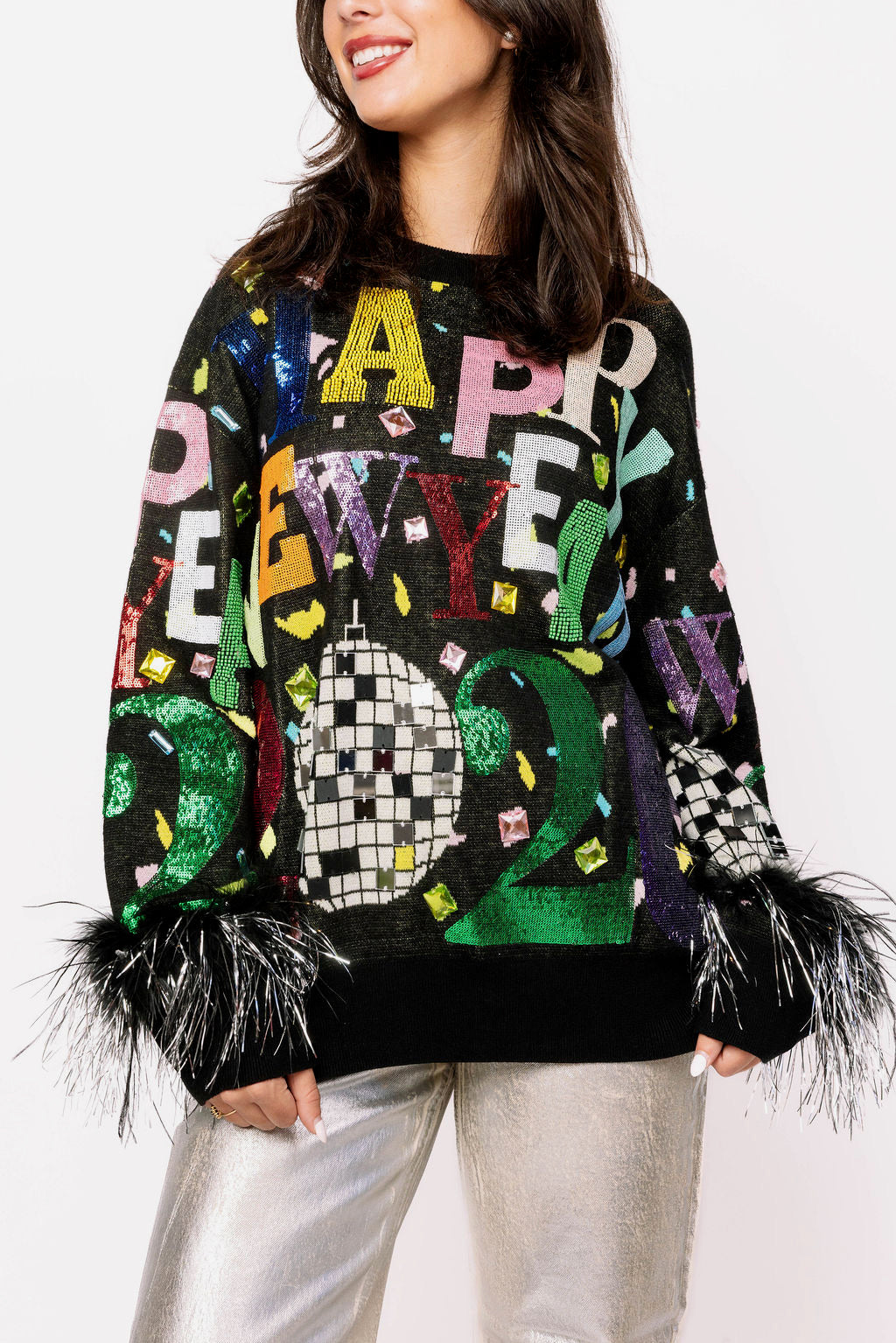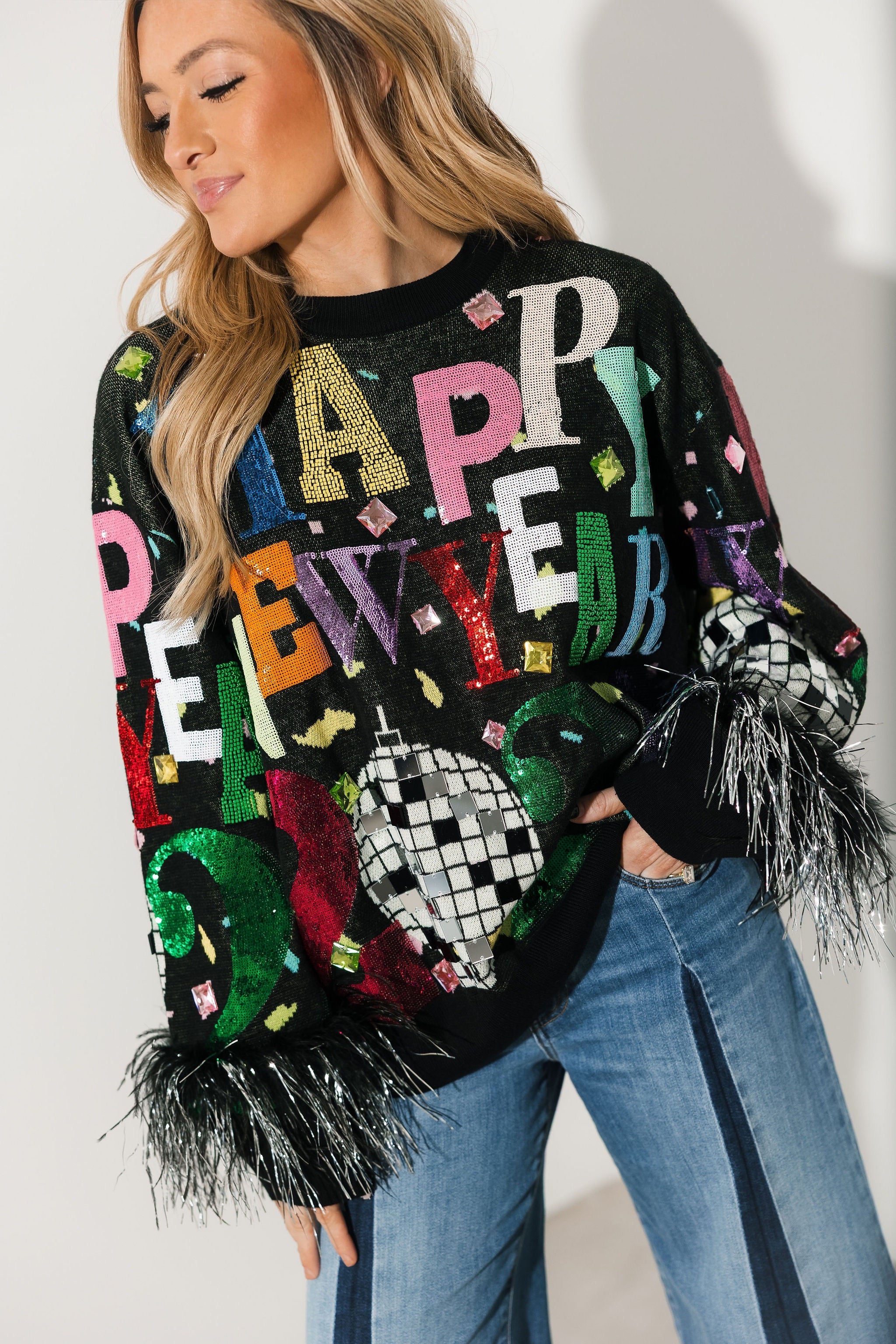 Black Multi 'Happy New Year 2026' Feather Sleeve Sweater | Queen Of Sparkles