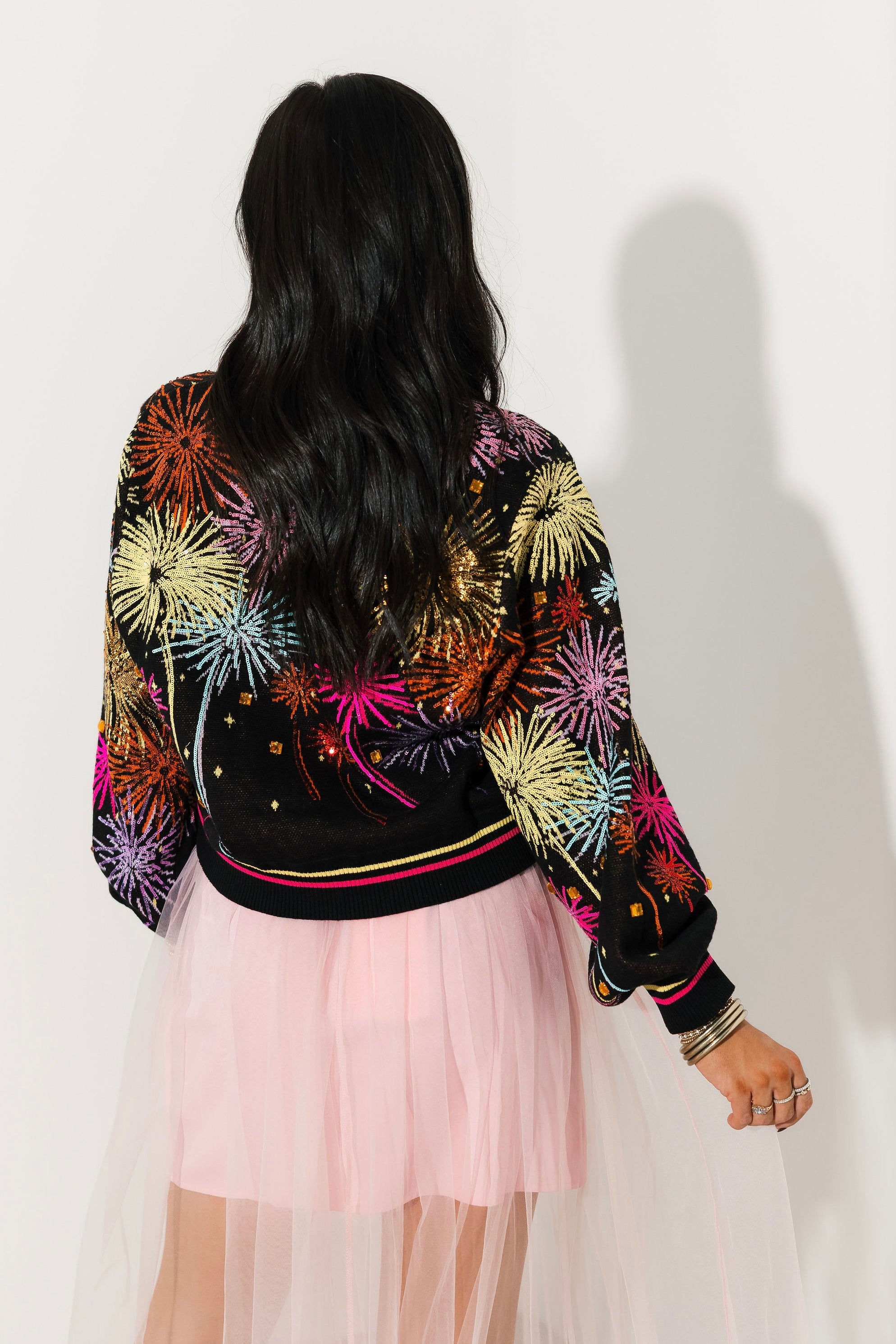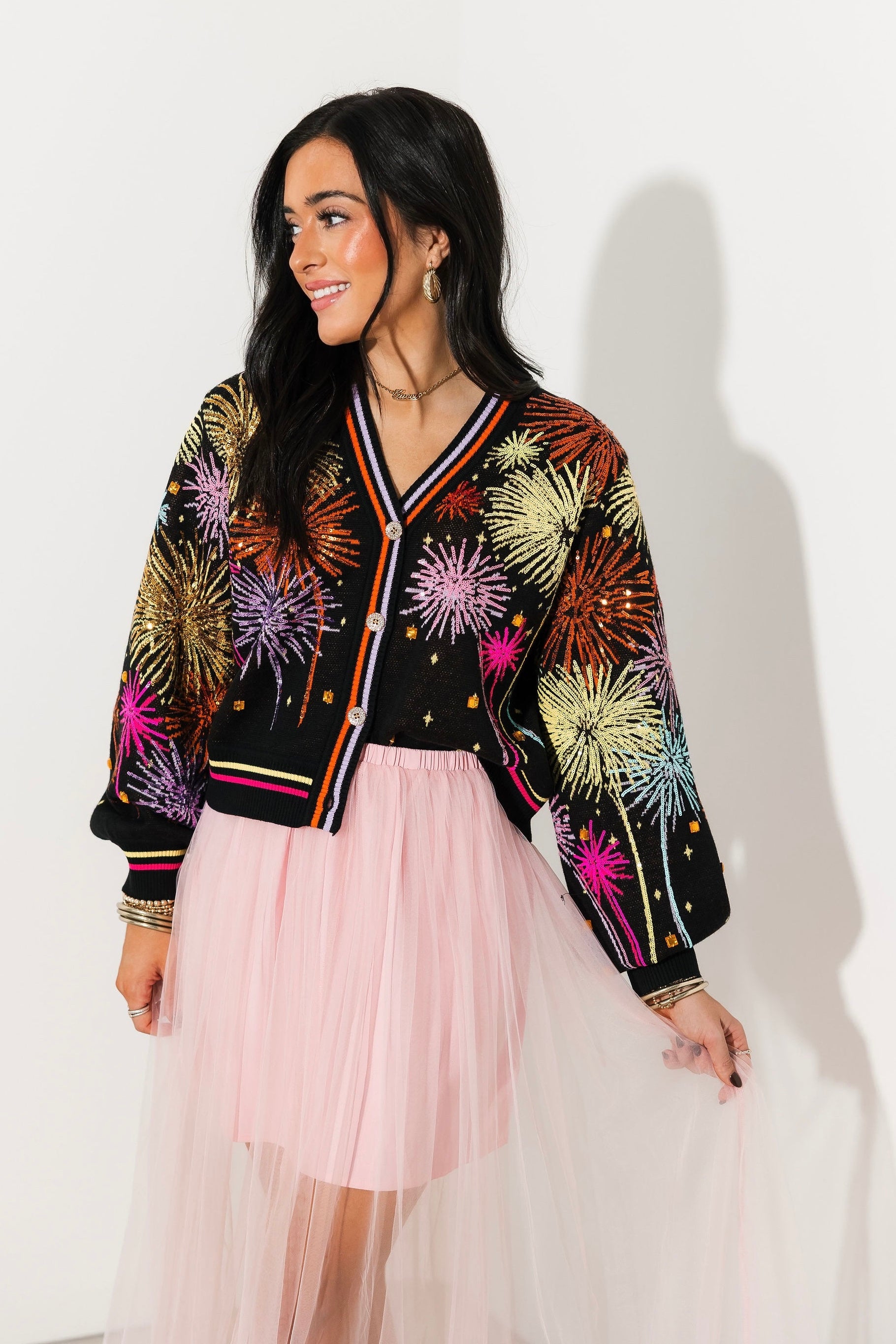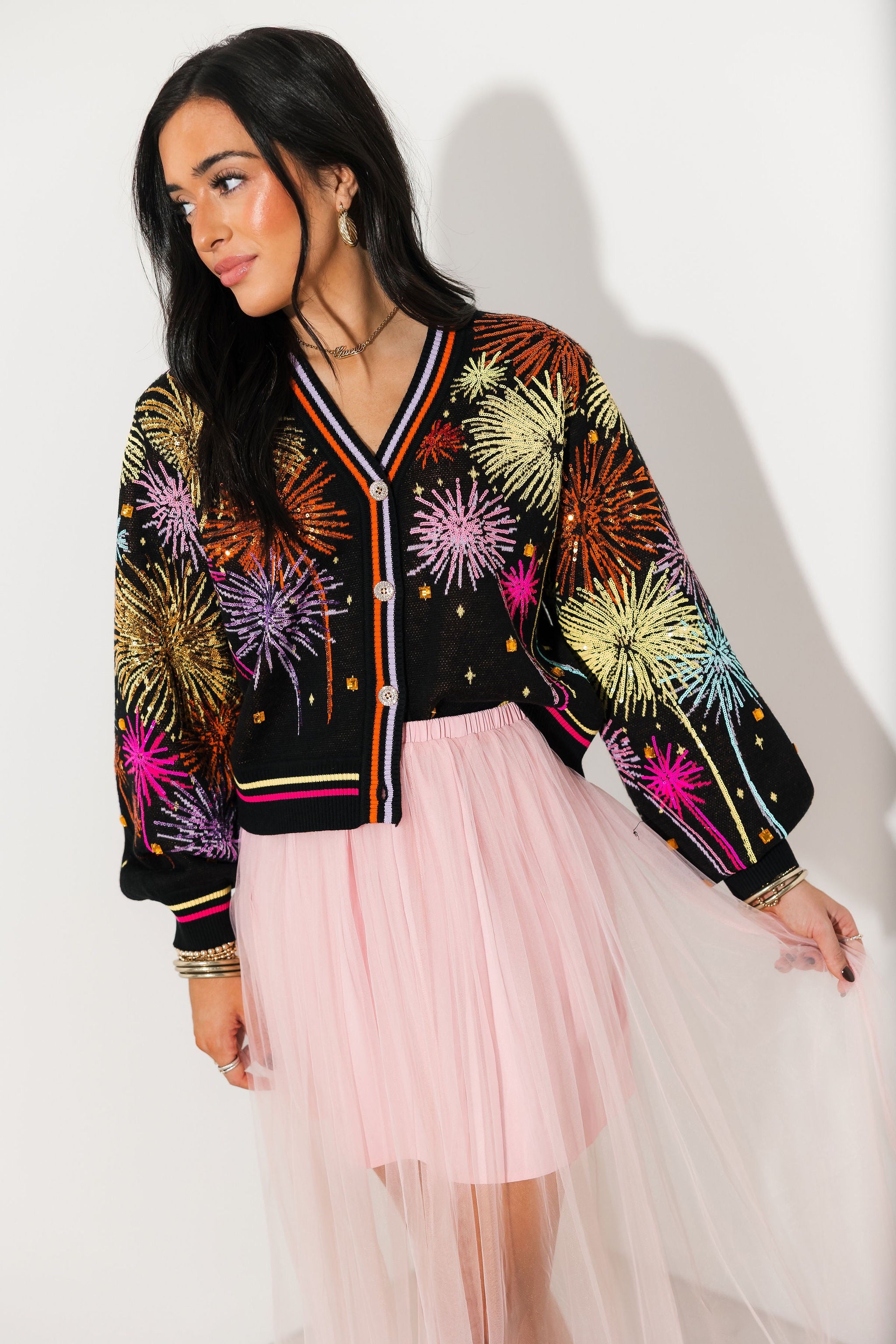 Bring the sparkle to every celebration with the Queen Of Sparkles Black Multi Rainbow Firework Button Up Cardigan. Designed with a relaxed fit, this festive knit features a classic V-neckline, functional buttons, and long sleeves for easy layering. Rainbow firework graphics light up the design, making it the perfect statement piece for holidays, parties, or any night you want to shine. Sage is wearing an XS.
