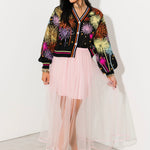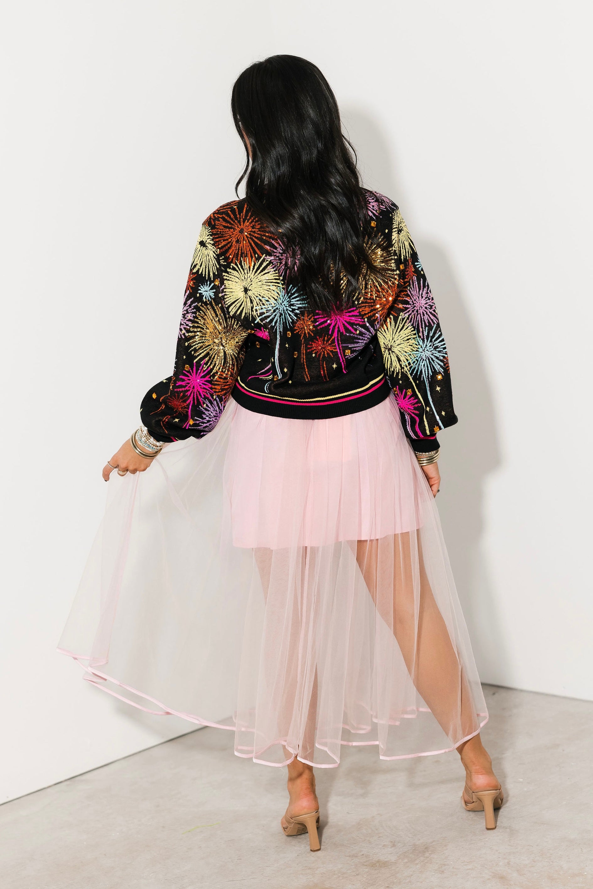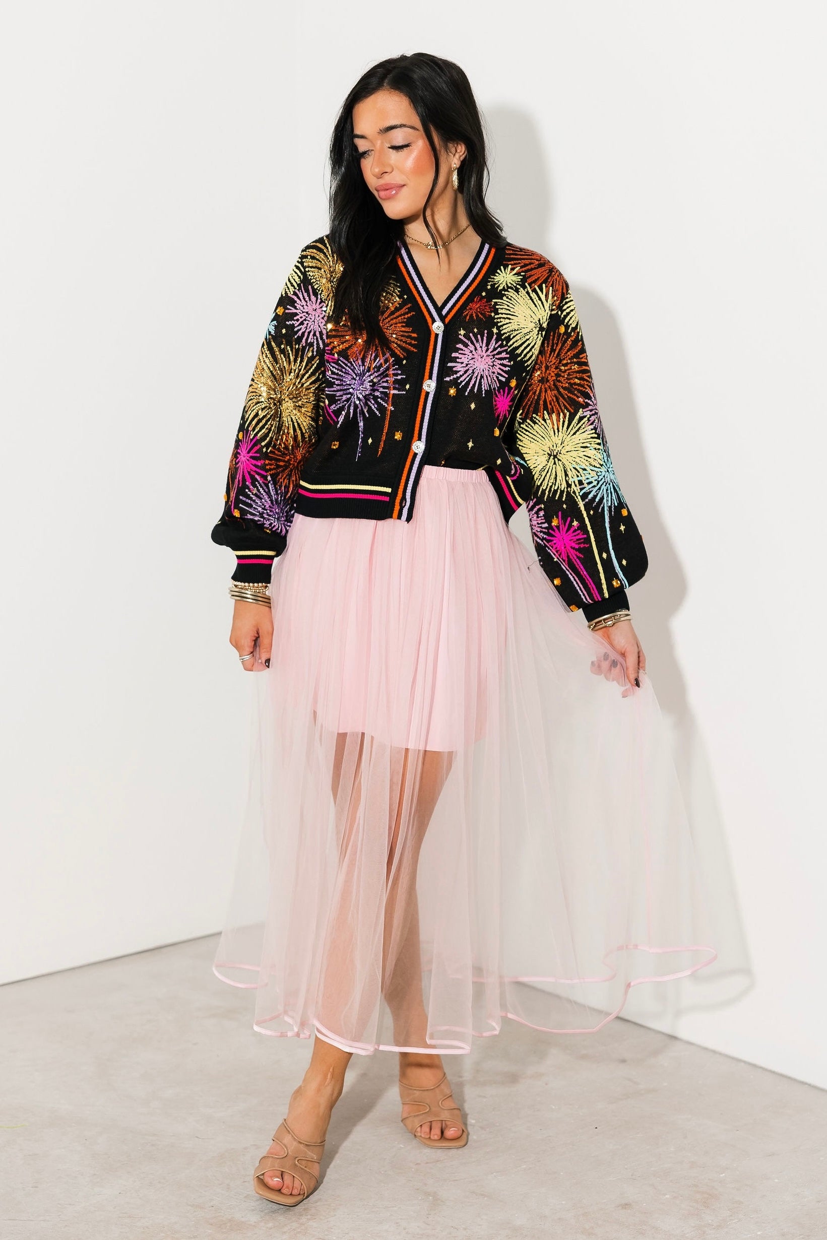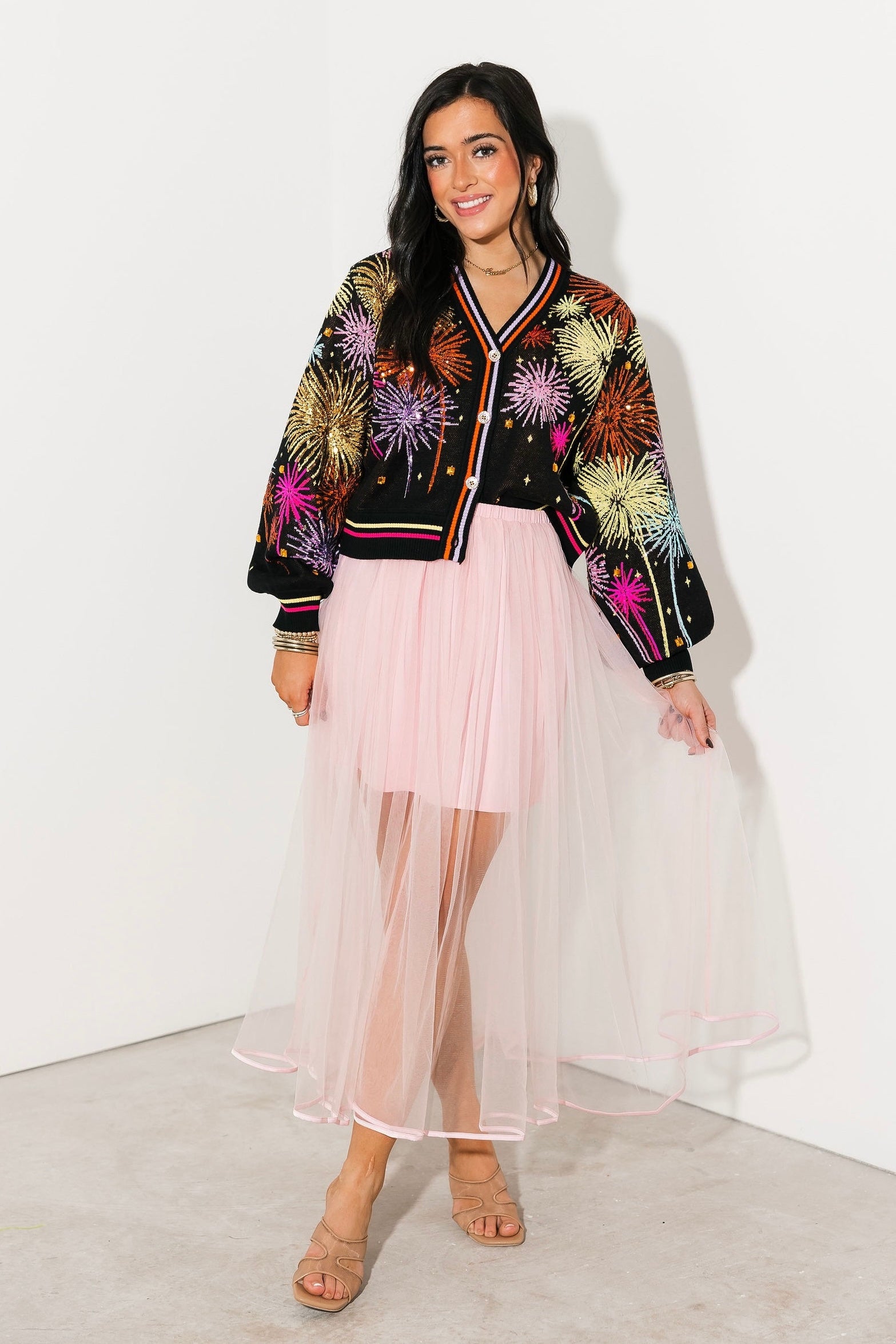Bring the sparkle to every celebration with the Queen Of Sparkles Black Multi Rainbow Firework Button Up Cardigan. Designed with a relaxed fit, this festive knit features a classic V-neckline, functional buttons, and long sleeves for easy layering. Rainbow firework graphics light up the design, making it the perfect statement piece for holidays, parties, or any night you want to shine. Sage is wearing an XS.