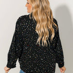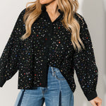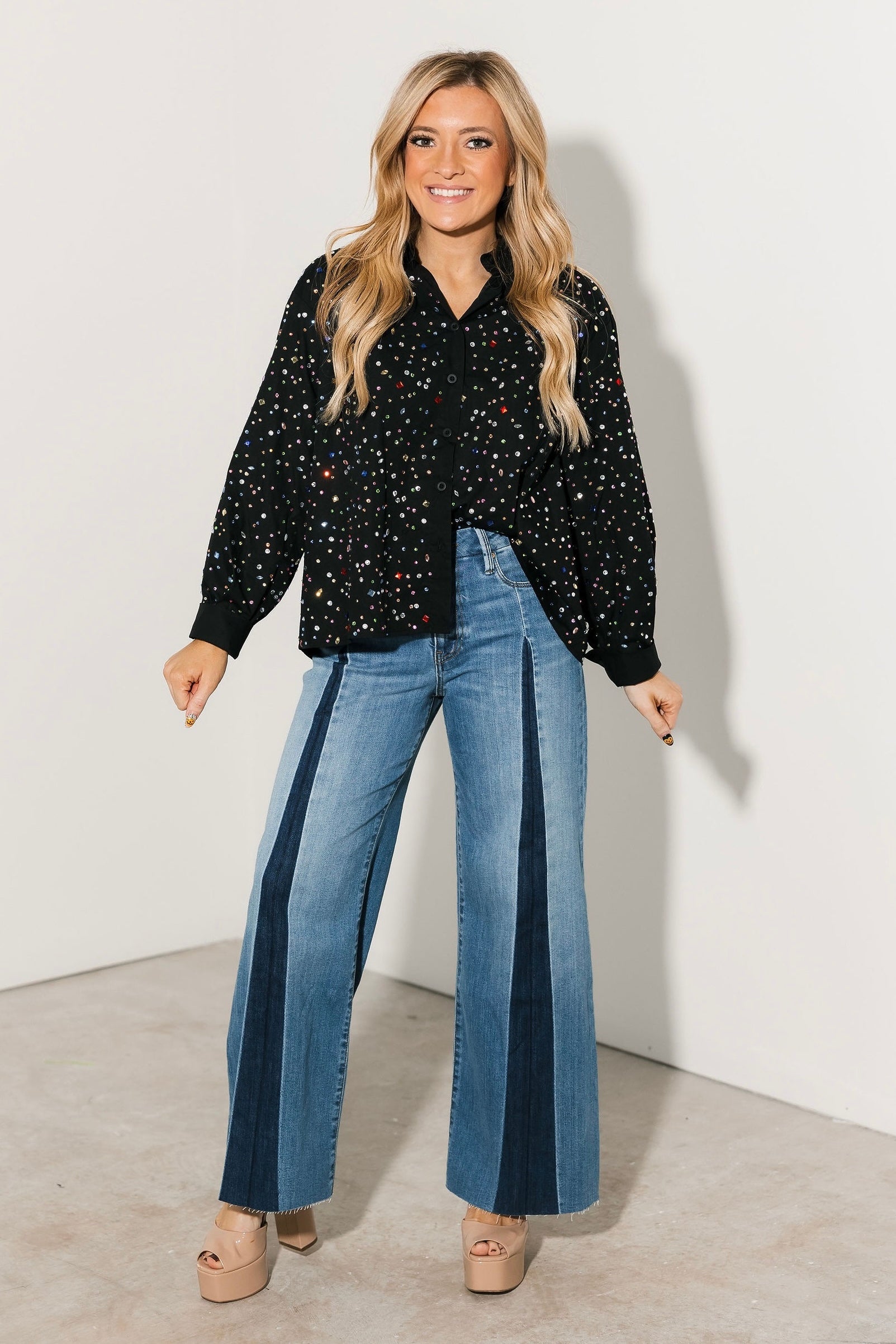 Shine bright in the Queen Of Sparkles Black Multi Rhinestone Cotton Button Up Collared Top. With a relaxed fit, classic collar, and colorful rhinestone embellishments, this top effortlessly combines comfort and glam. Pair it with jeans for a standout casual look or dress it up with a skirt or trousers for parties and special events. Perfect for anyone who loves to sparkle. Lexi Jade is wearing an XS.