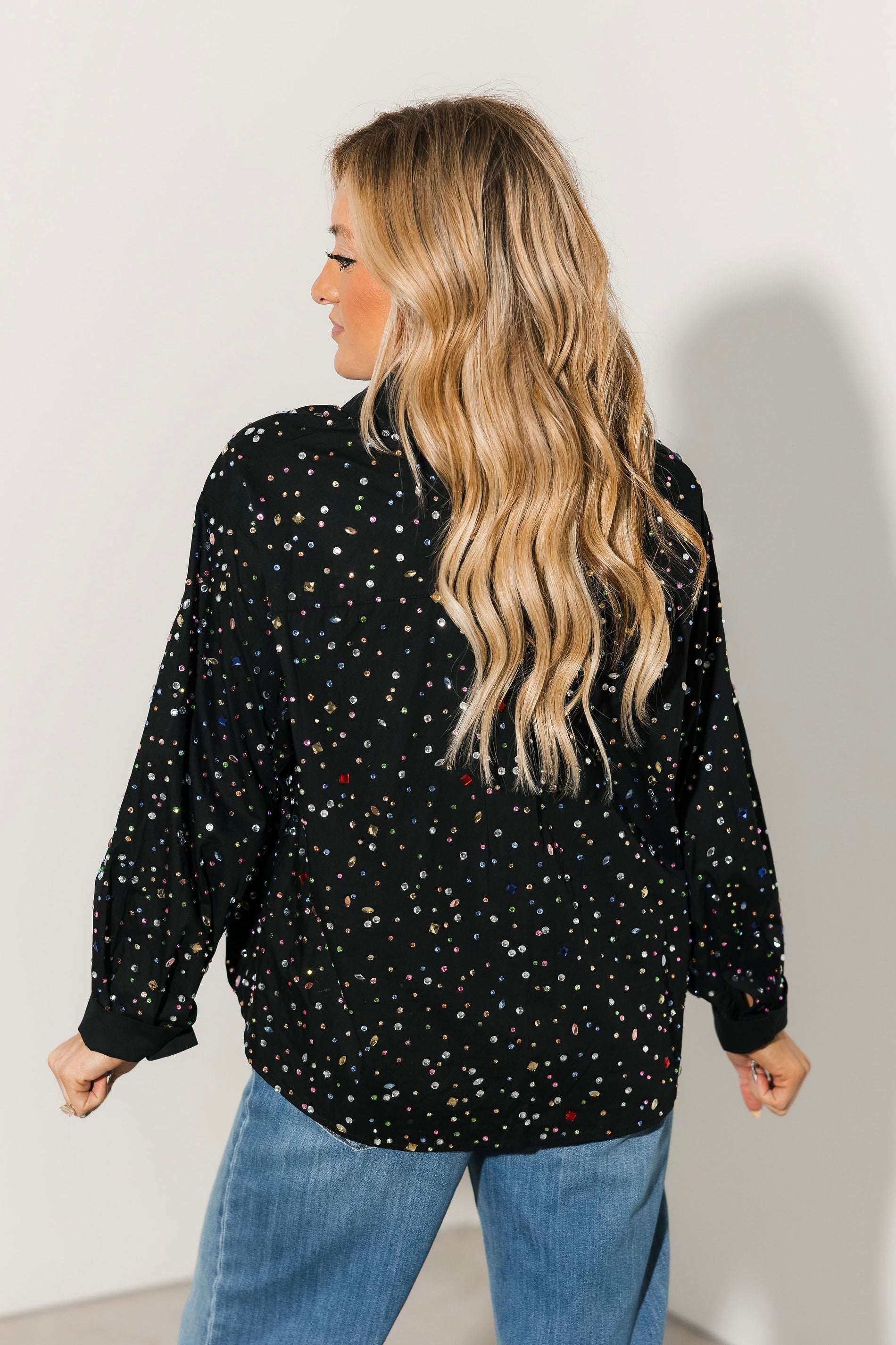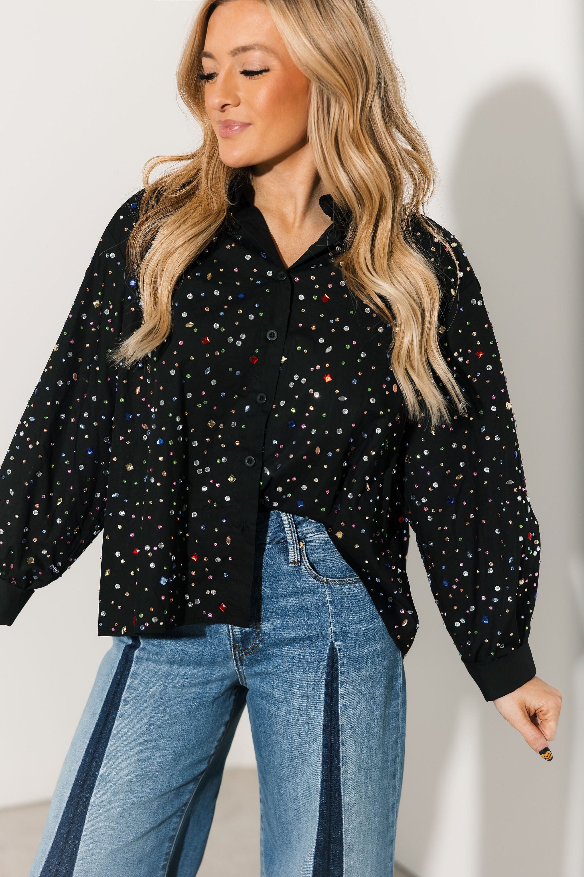 - Why We ❤ It: Sparkle from every angle—this collared button-up top is covered in colorful rhinestones, making it a show-stopping piece perfect for parties, special occasions, or adding a pop of glam to any outfit.