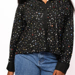 Queen Of Sparkles Black Multi Rhinestone Cotton Button Up Collared Top