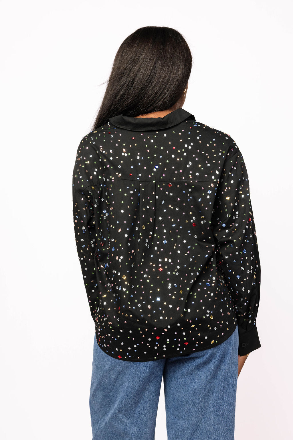 Black Multi Rhinestone Cotton Button Up Collared Top | Queen Of Sparkles