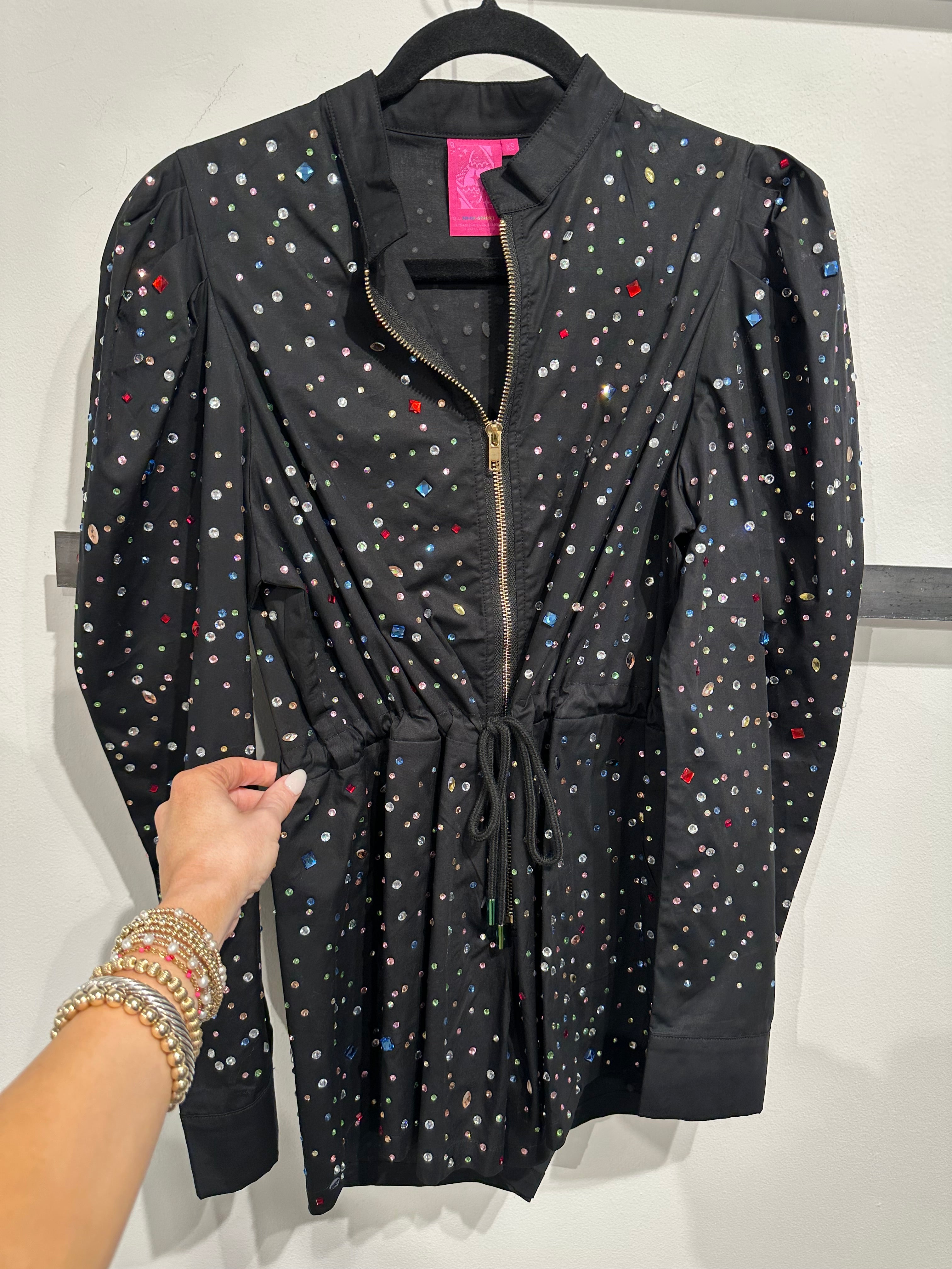 The Queen Of Sparkles Black Multi Scattered Rhinestone Long Sleeve Romper features a relaxed fit with a mock neck, long sleeves, and a front zipper closure. Adorned with scattered sparkling rhinestones, this playful piece is perfect for holiday parties, festive outings, or adding a dazzling touch to your seasonal wardrobe.