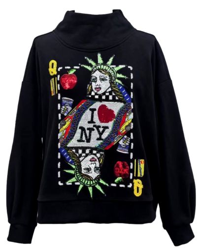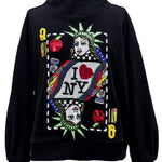 The Queen Of Sparkles Black NYC Queen Card Mock Neck Sweatshirt features a relaxed, loose fit with a chic mock neckline and long sleeves for a laid-back feel. Finished with bold NYC Queen Card graphics, it blends comfort with statement style—perfect for everyday wear while still feeling special.