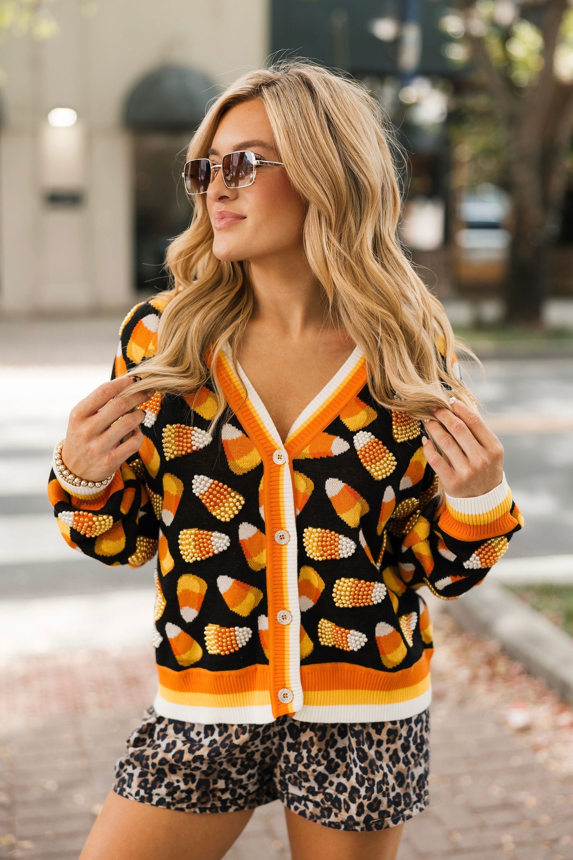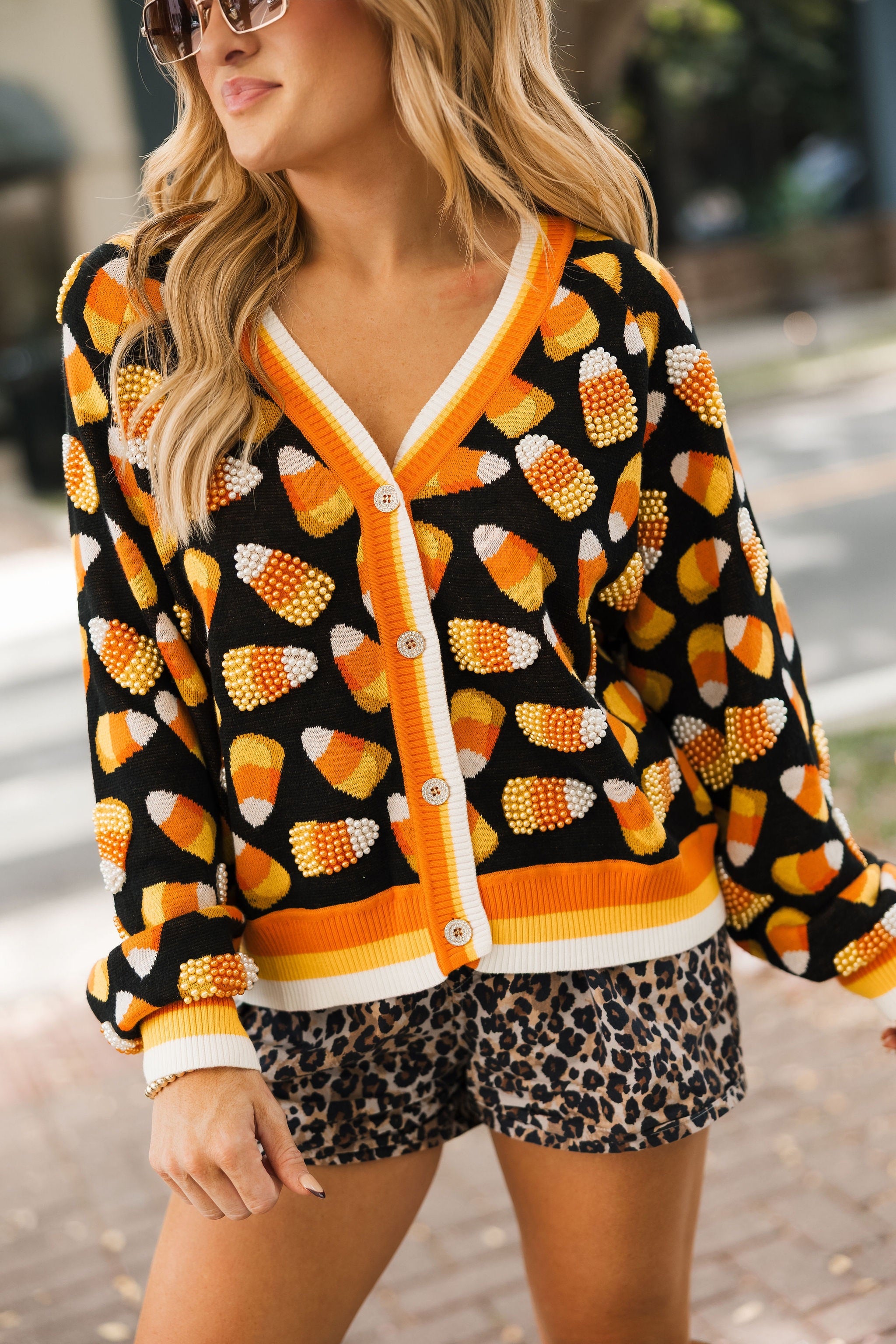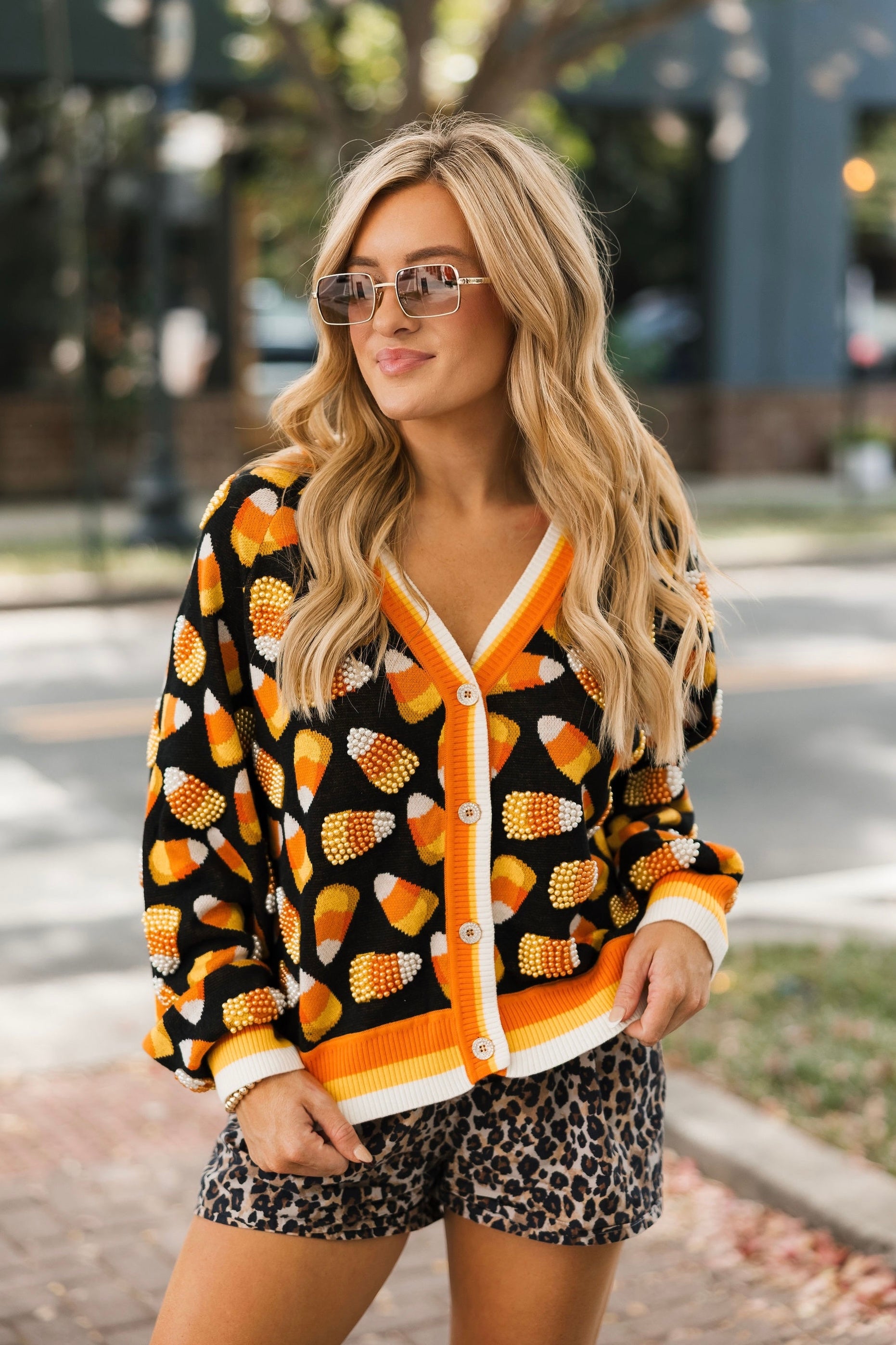 Bring cozy, sparkly fun to your Halloween wardrobe! This relaxed-fit cardigan features a flattering V-neck, functional front buttons, and glittery candy corn details scattered all over. Perfect for layering over tees, dresses, or skirts, it’s your go-to piece for adding festive charm to any fall outfit. Lexi is wearing an XS.