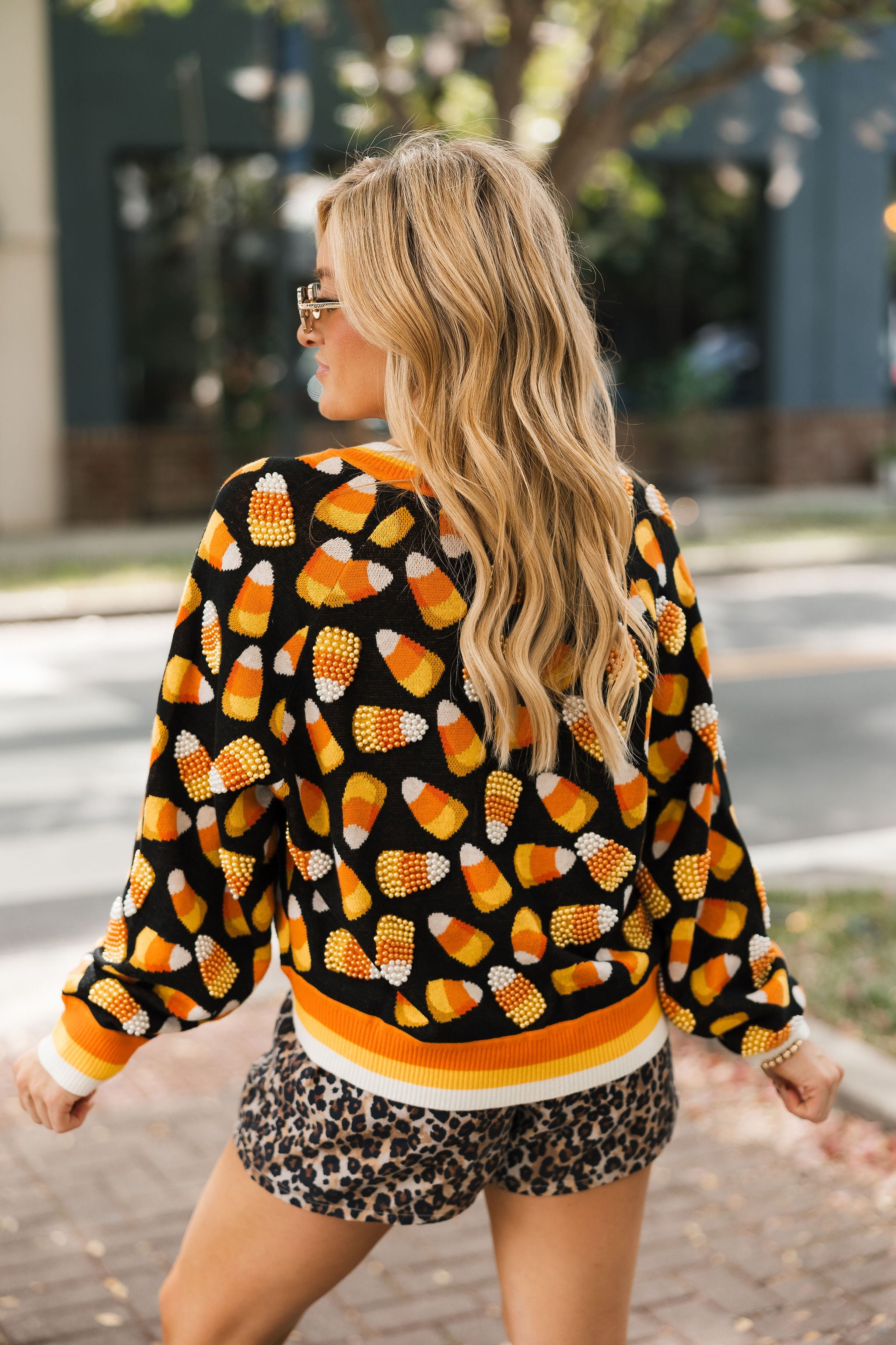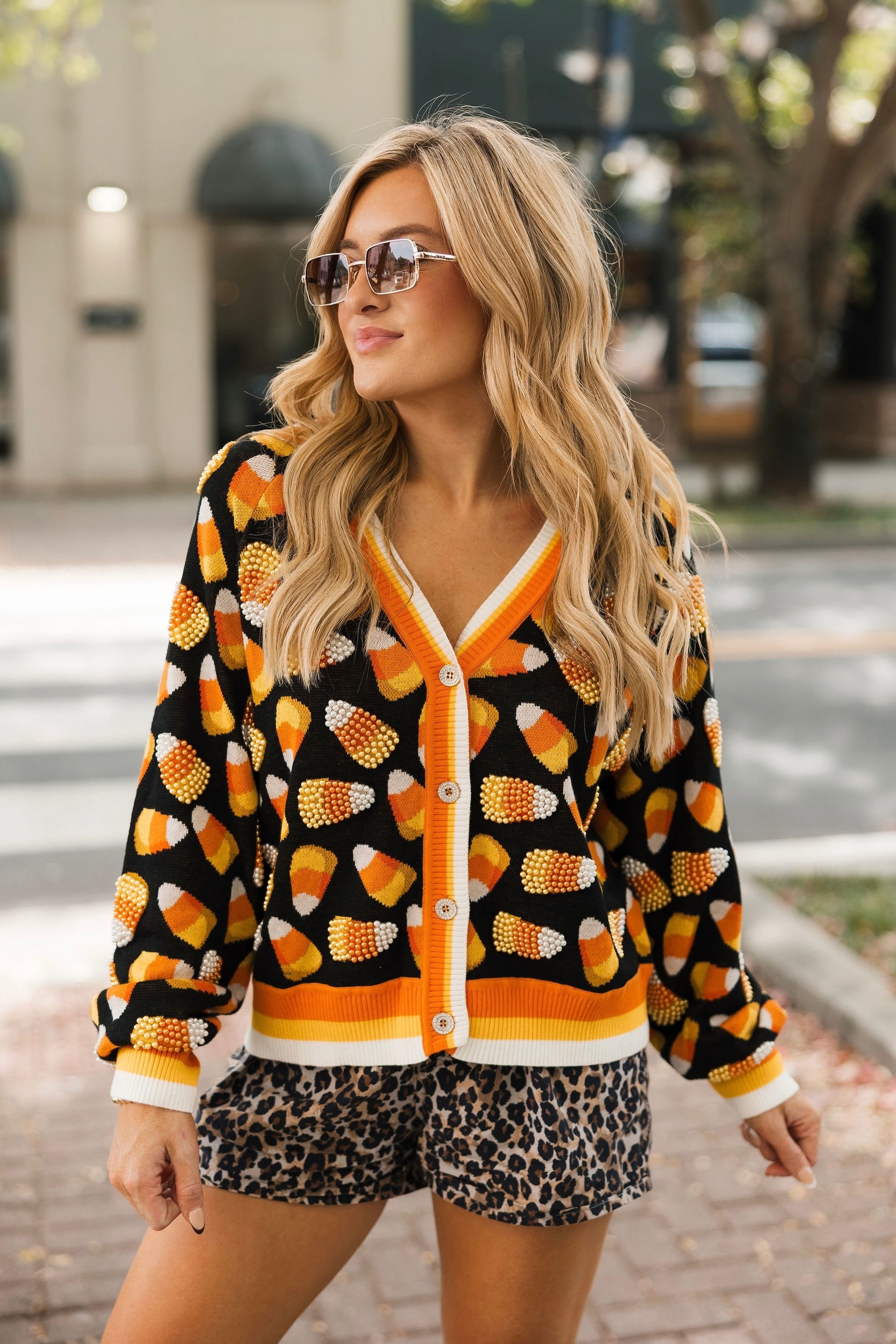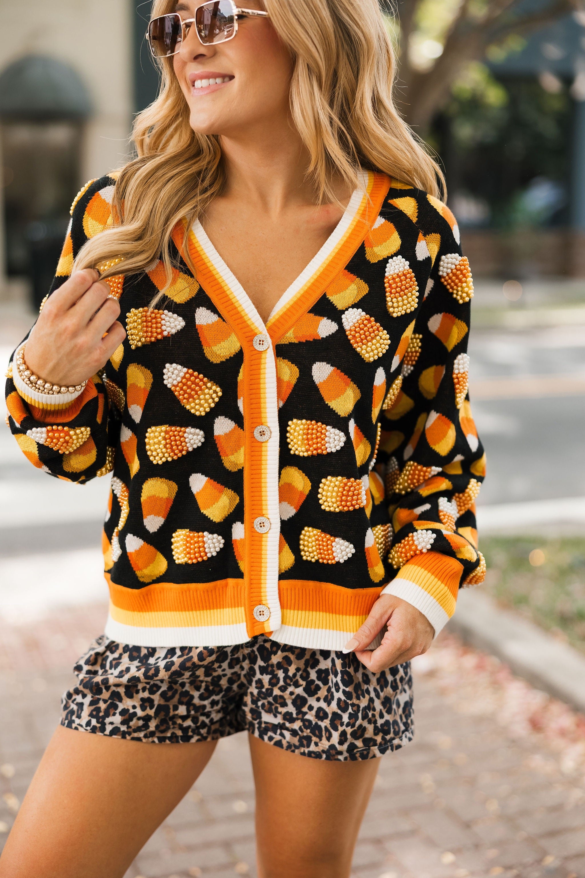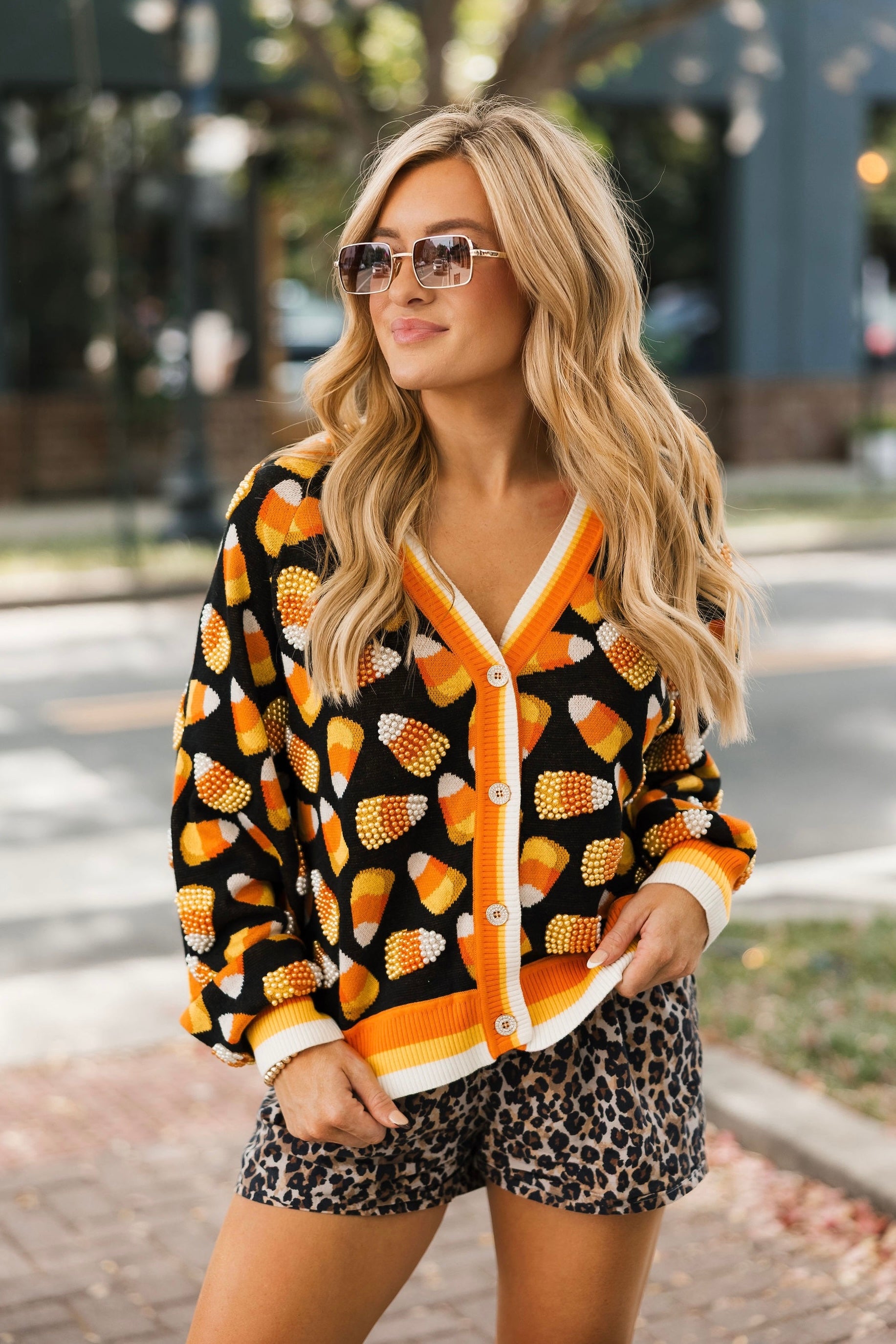 Bring cozy, sparkly fun to your Halloween wardrobe! This relaxed-fit cardigan features a flattering V-neck, functional front buttons, and glittery candy corn details scattered all over. Perfect for layering over tees, dresses, or skirts, it’s your go-to piece for adding festive charm to any fall outfit. Lexi is wearing an XS.