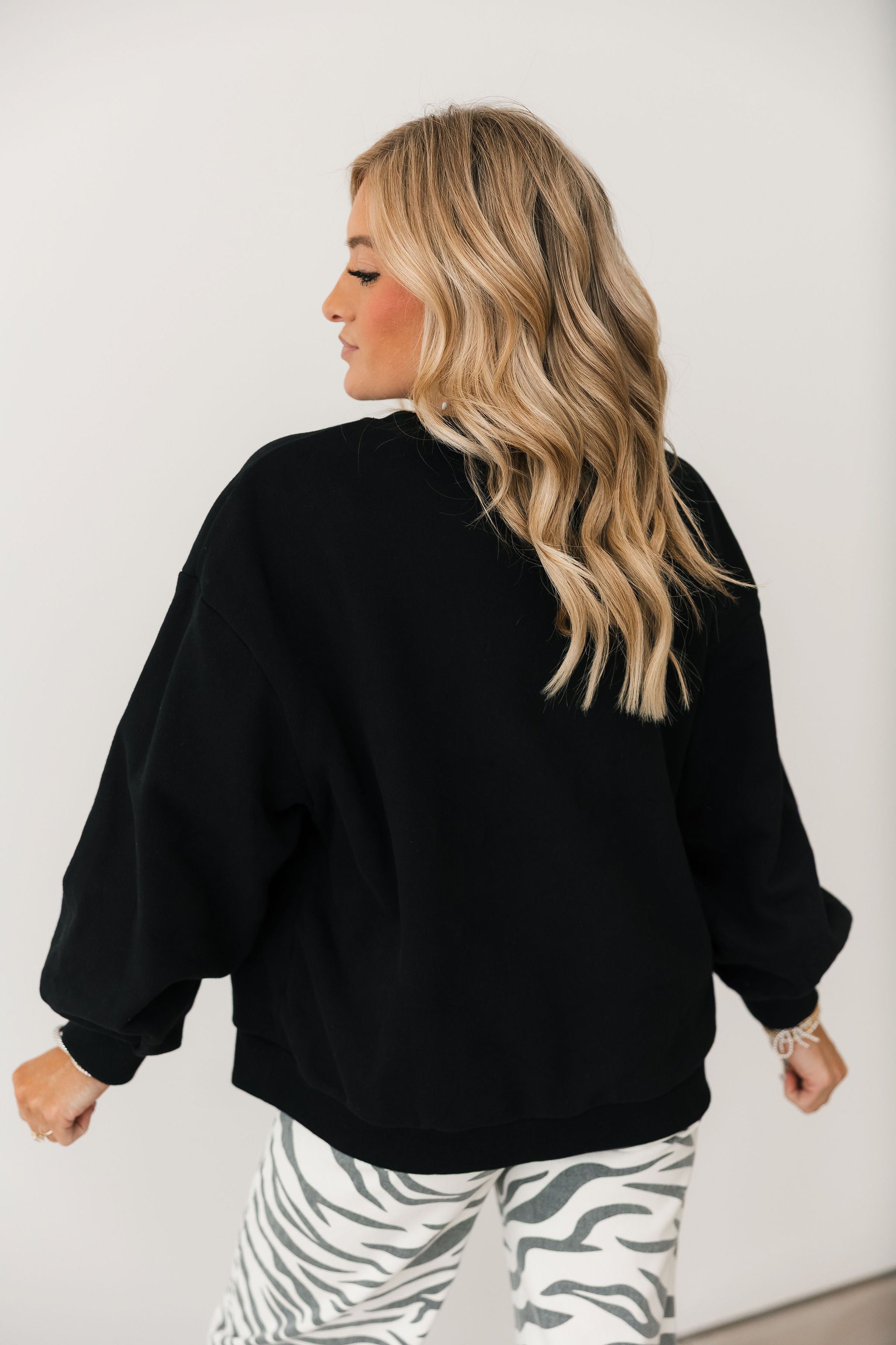 Keep it chic and comfy in the Queen Of Sparkles Black Tonal Queen Card Sweatshirt. With a relaxed fit, crewneck, and long sleeves, it’s perfect for everyday wear. The tonal black-on-black QOS card logo adds a subtle sparkle that elevates this classic piece. Lexi Jade is wearing an XS.