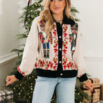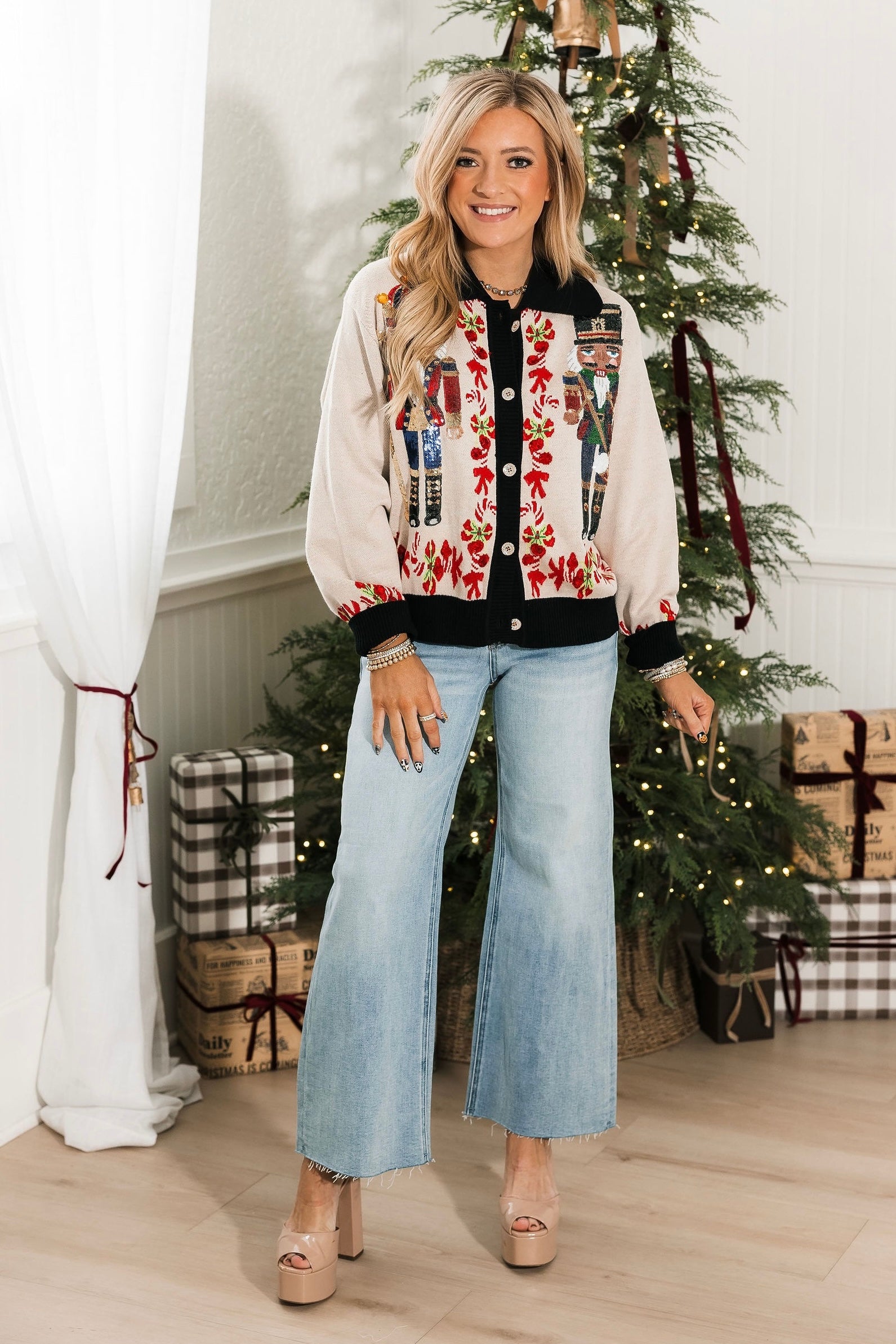 Black Trim Collar Nutcracker & Candy Cane Button Up Cardigan | Queen Of Sparkles
