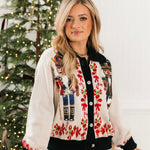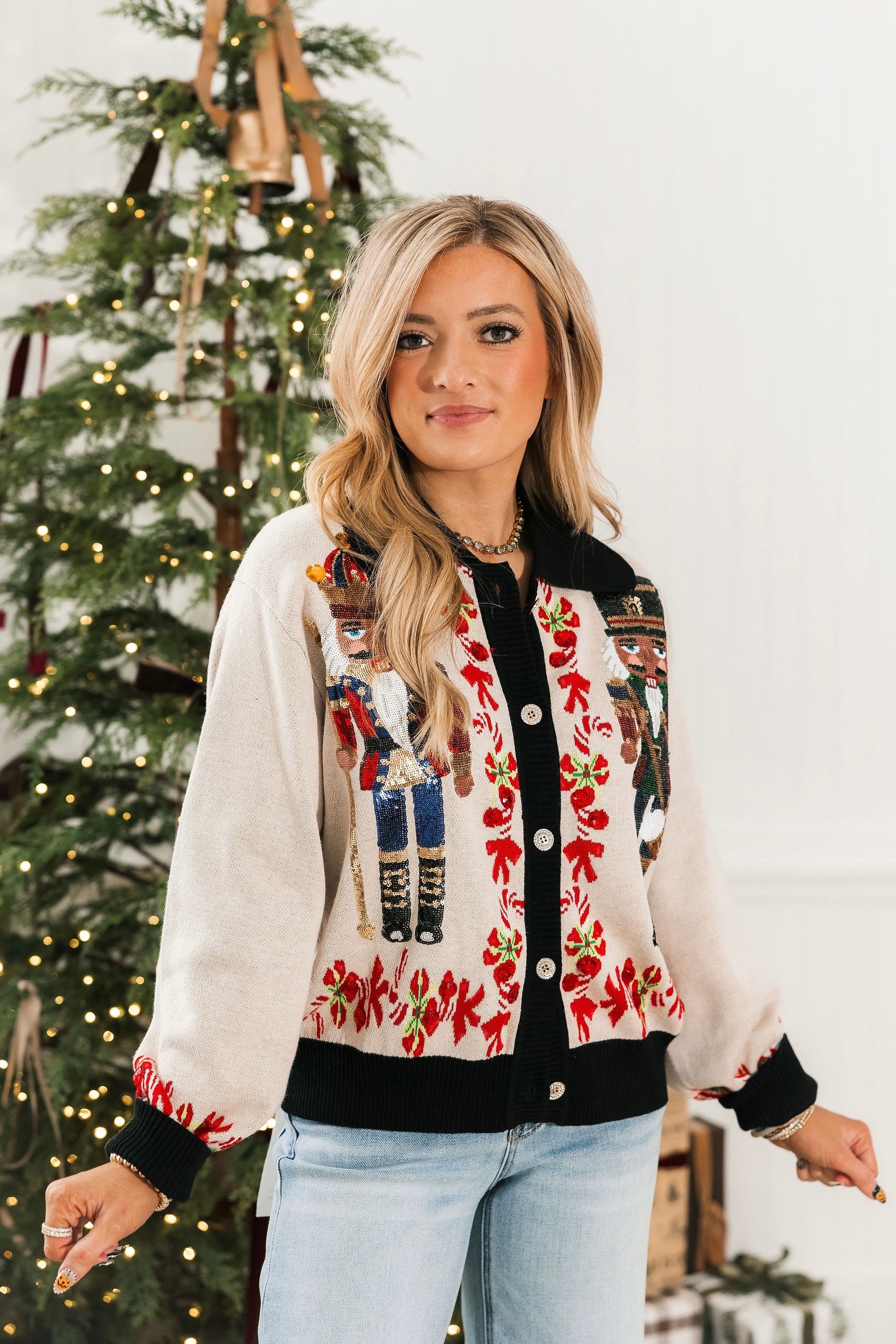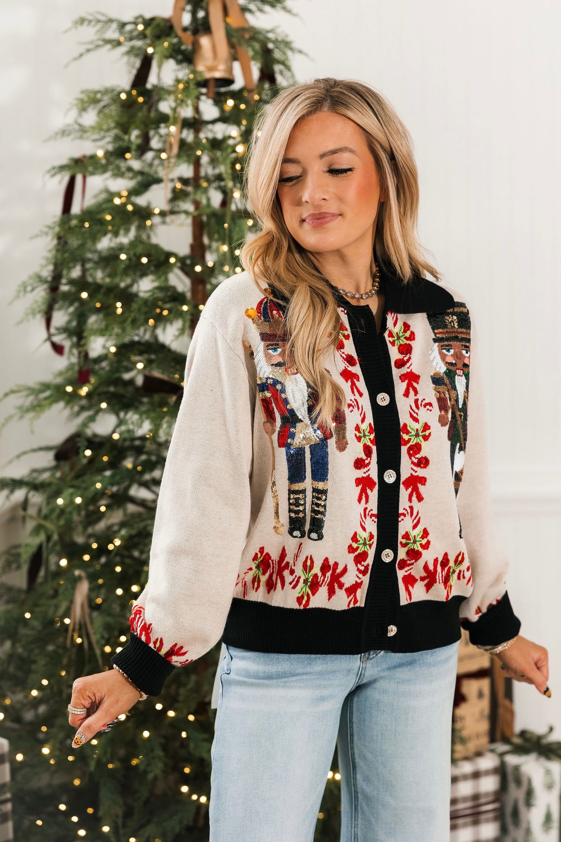 Queen Of Sparkles Black Trim Collar Nutcracker & Candy Cane Button Up Cardigan