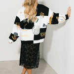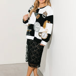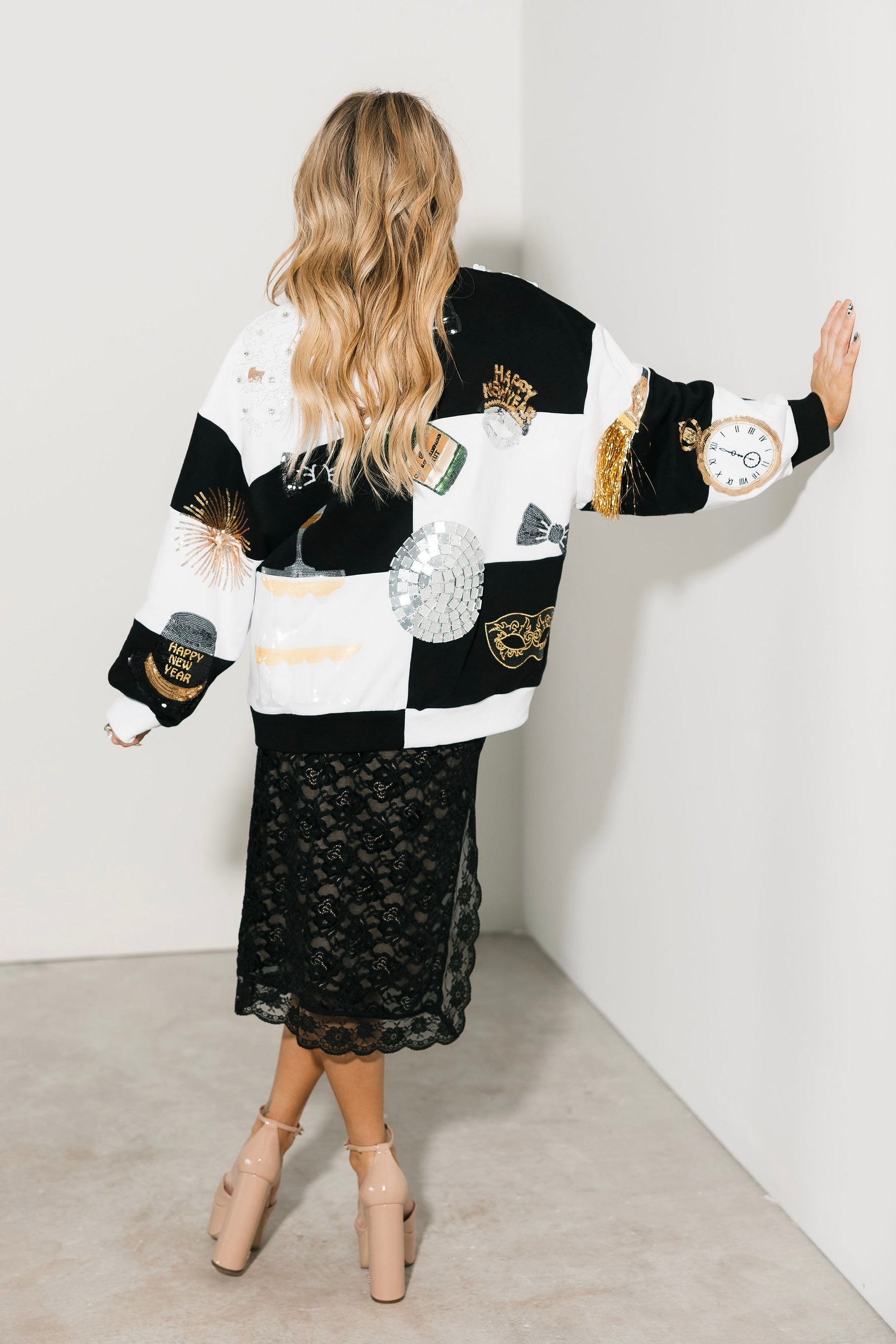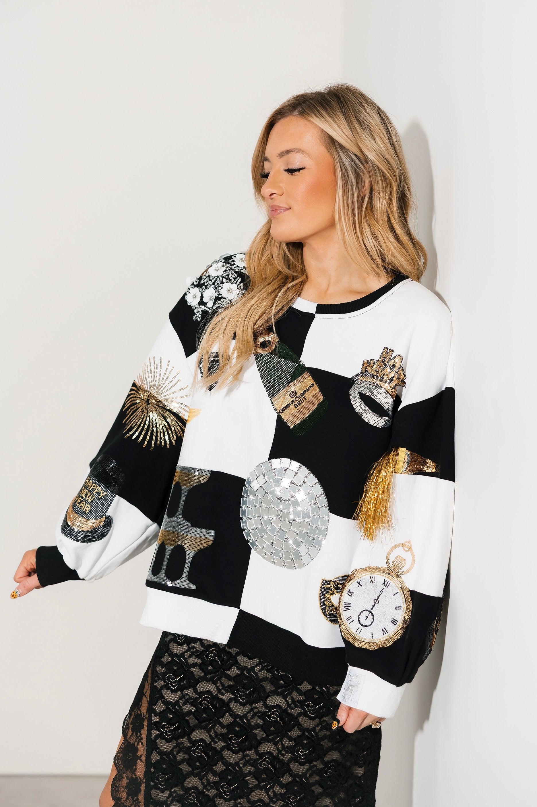 Celebrate in bold style with the Queen Of Sparkles Black & White Checkered NYE Icon Sweatshirt. Featuring a standout checkered pattern and dazzling New Year’s Eve-inspired icons—champagne glasses, disco balls, clocks, masks, and festive décor—this sweatshirt is the perfect mix of cozy and party-ready. With its relaxed fit and classic crewneck, it’s easy to throw on for countdown celebrations or casual nights with friends. Lexi Jade is wearing an XS.