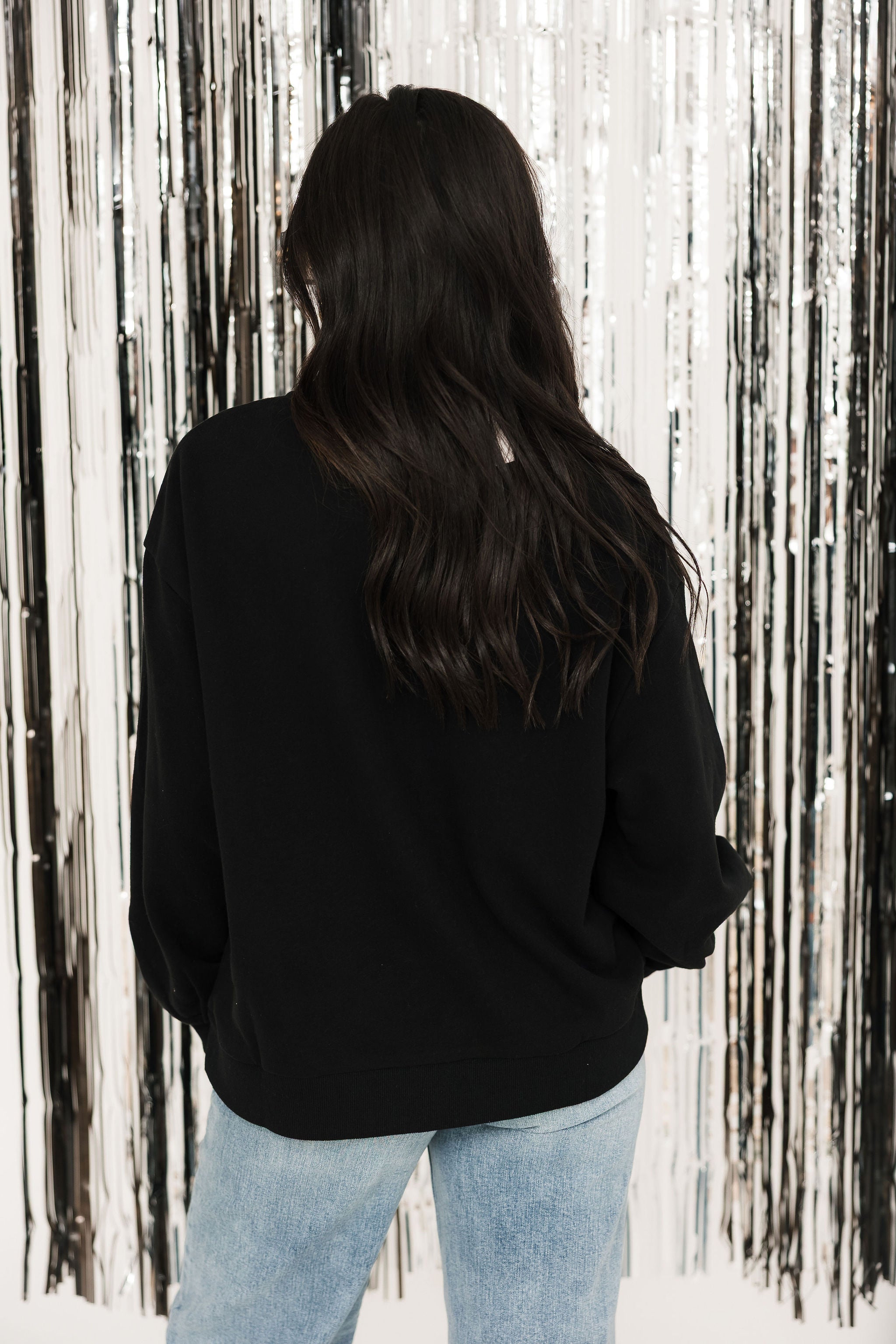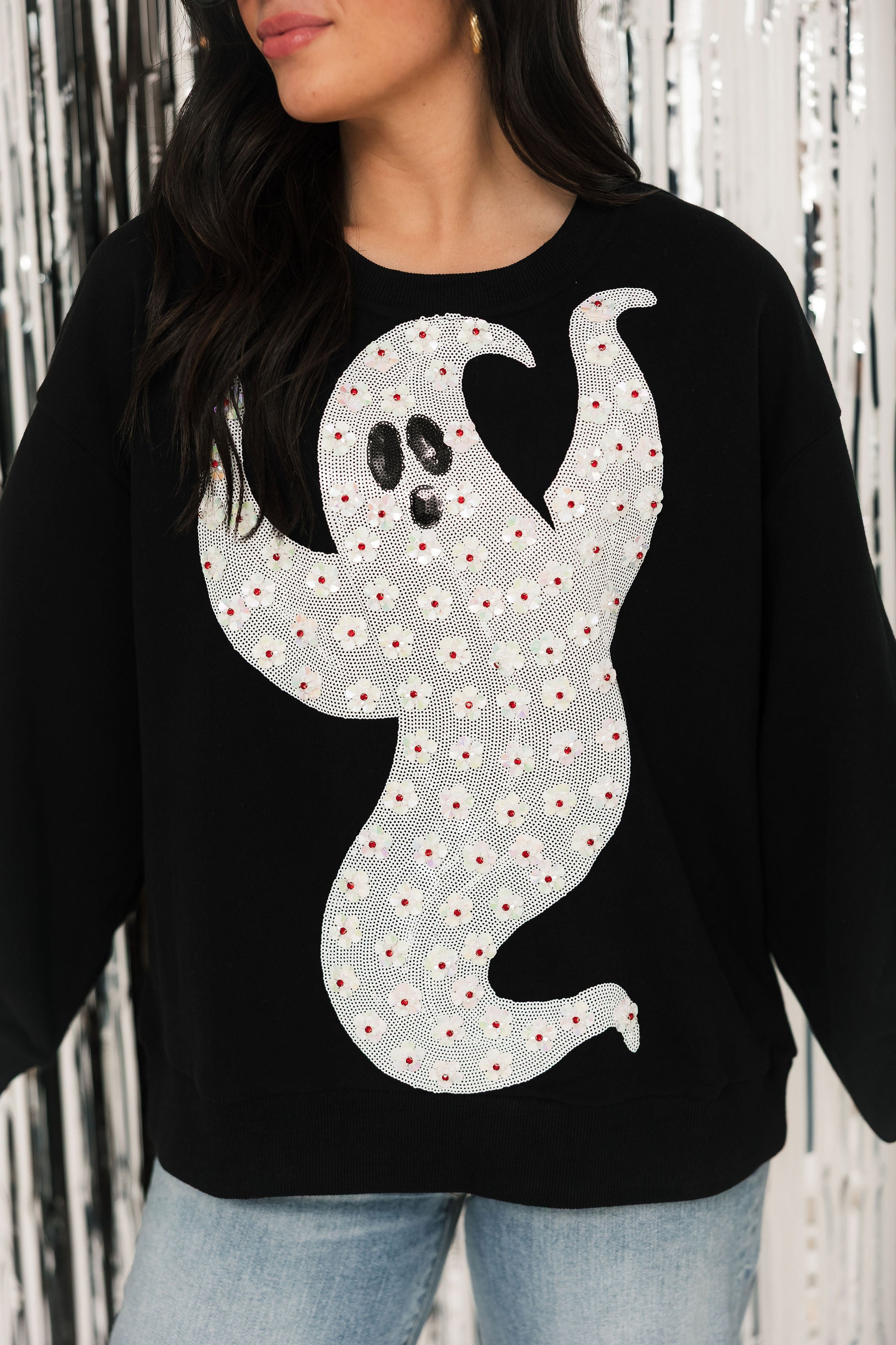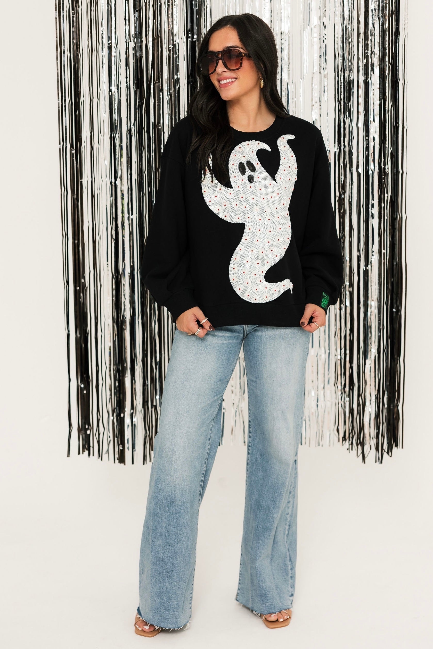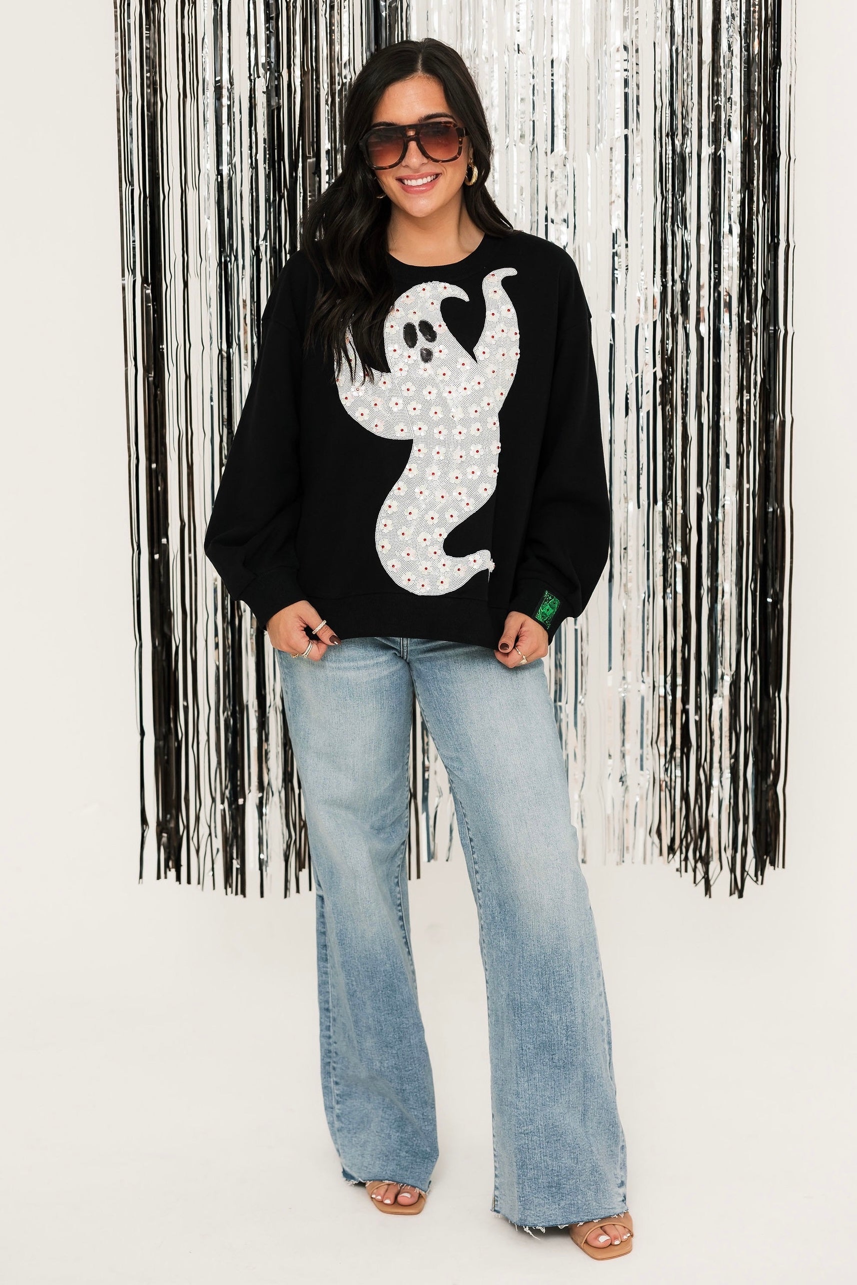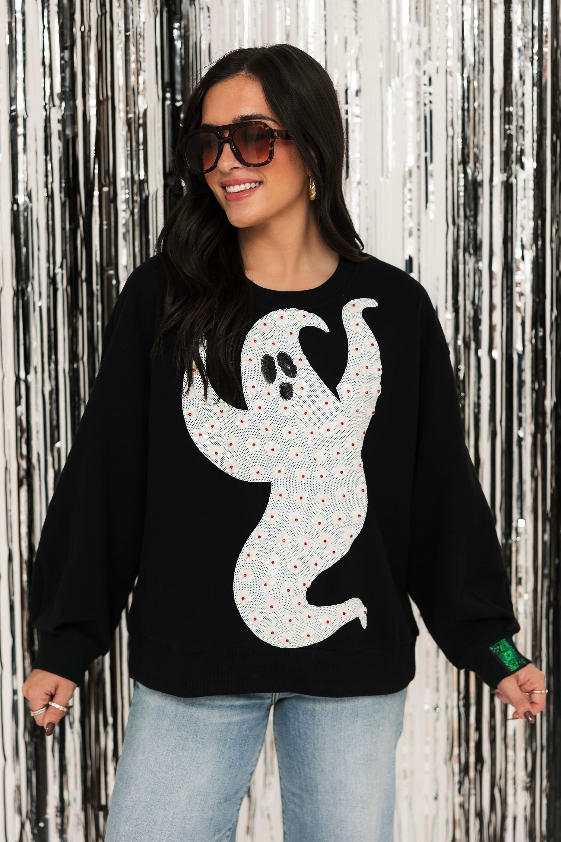 Float through fall in sparkly style with this cozy crewneck sweatshirt from Queen Of Sparkles. The relaxed fit and classic black base make it easy to wear, while the delicate white flower sequin ghost graphic adds a touch of playful magic. Perfect for layering or wearing solo on those crisp autumn days. Sage is wearing an XS.