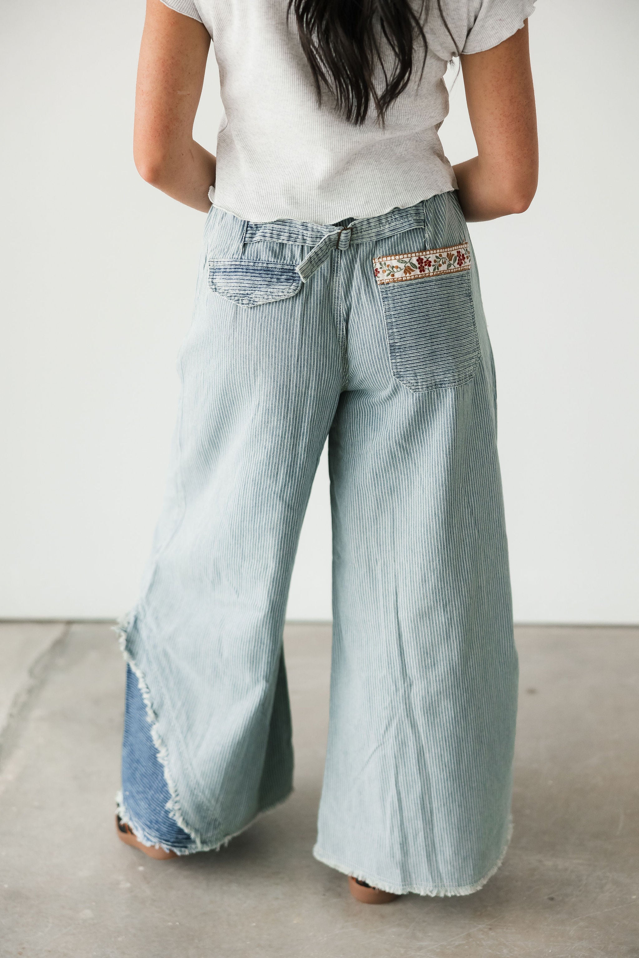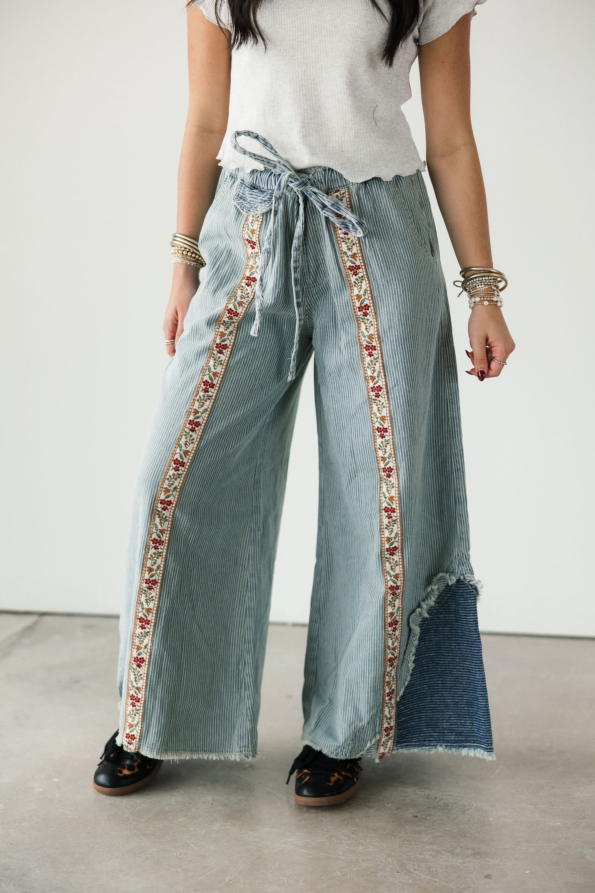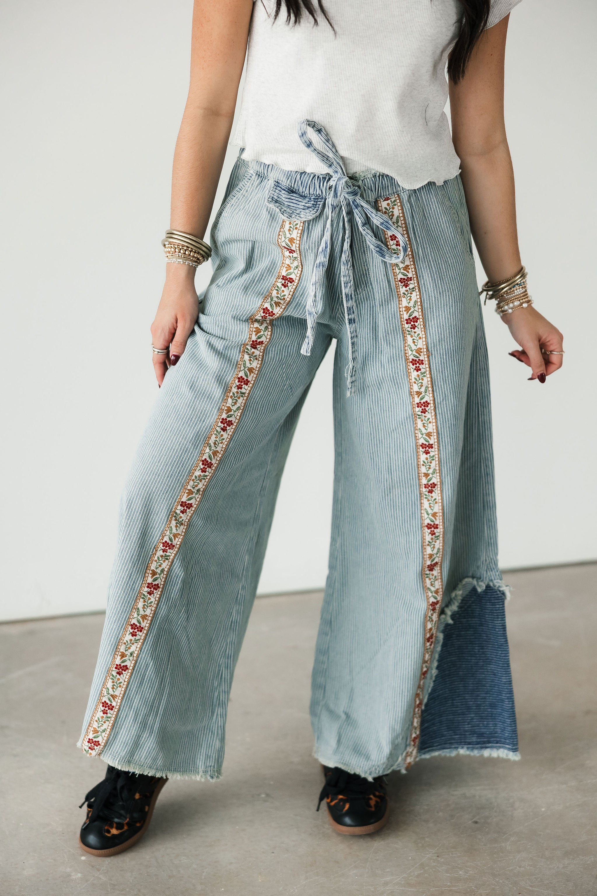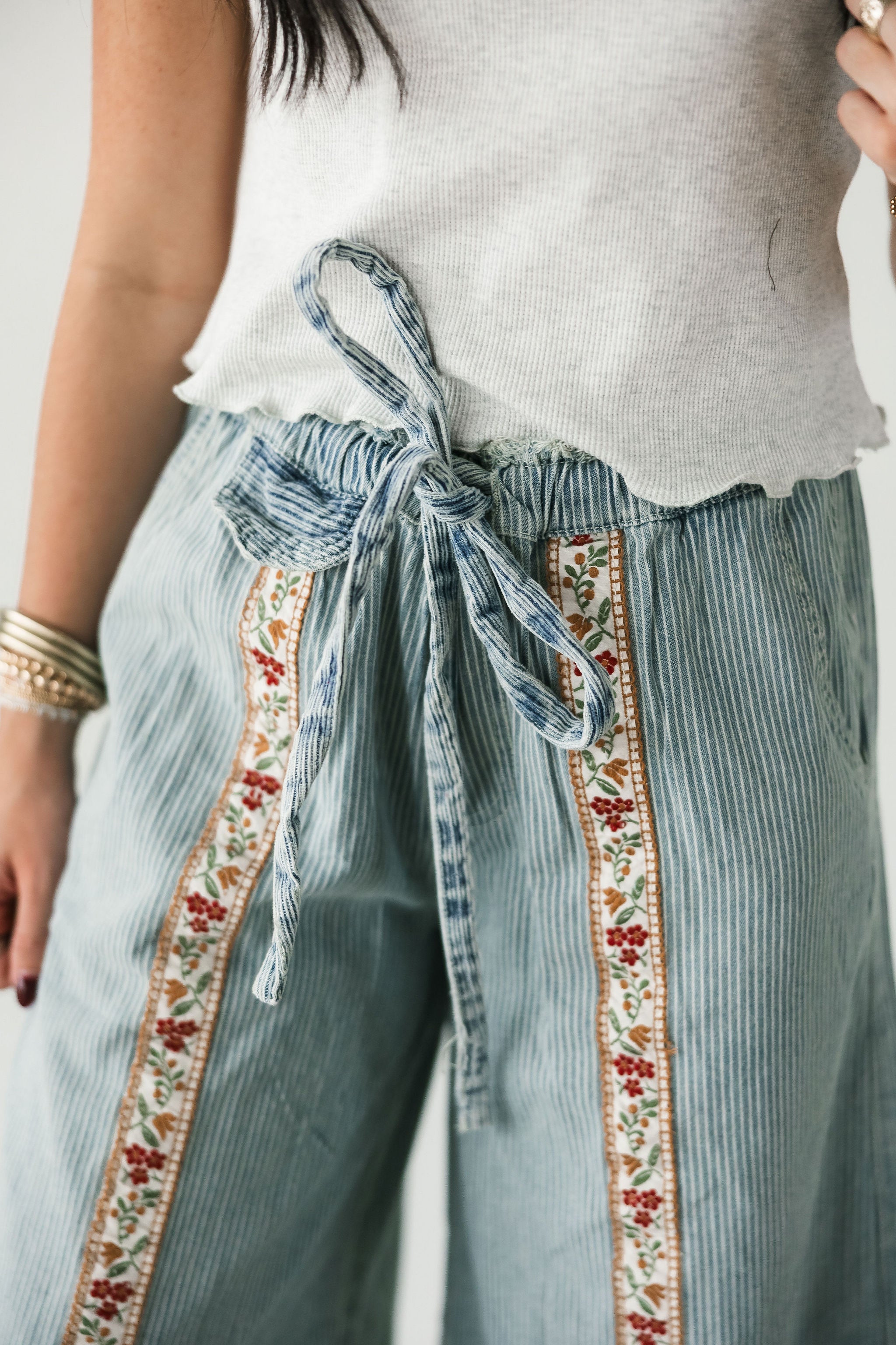 The Bloom Stripe Pants in Striped Denim bring a fresh mix of whimsy and edge to your wardrobe. Designed with an oversized, relaxed fit, these woven bottoms feature a standout floral trim running down the front of each leg for the prettiest pop of detail. A decorative mini pocket flap, buckle-back accent, and trimmed back patch pocket add charm and character from every angle. Style them with a simple top for a statement look or pair them with something bold for a fashion-forward moment. Perfect for a standout denim moment. Sage is wearing a small.