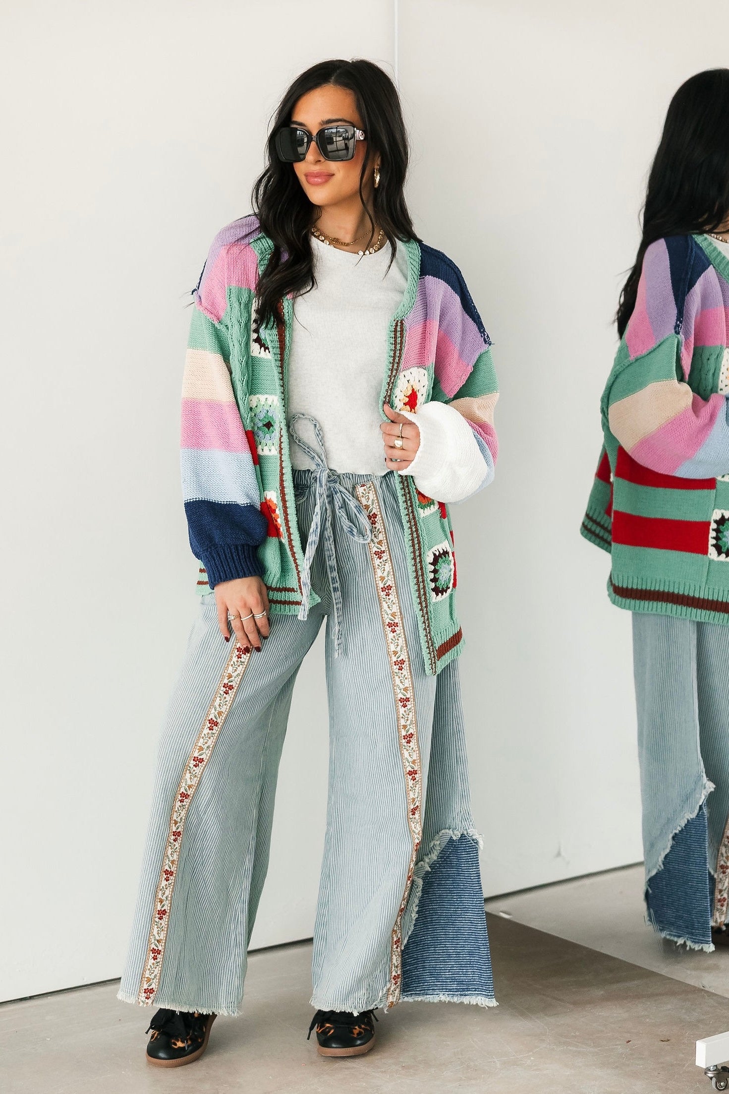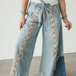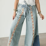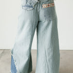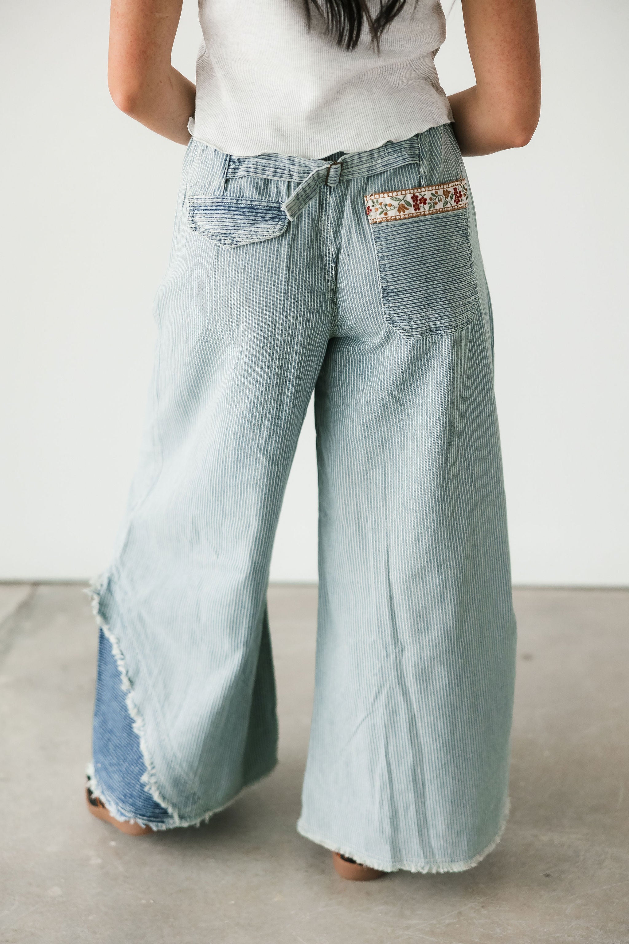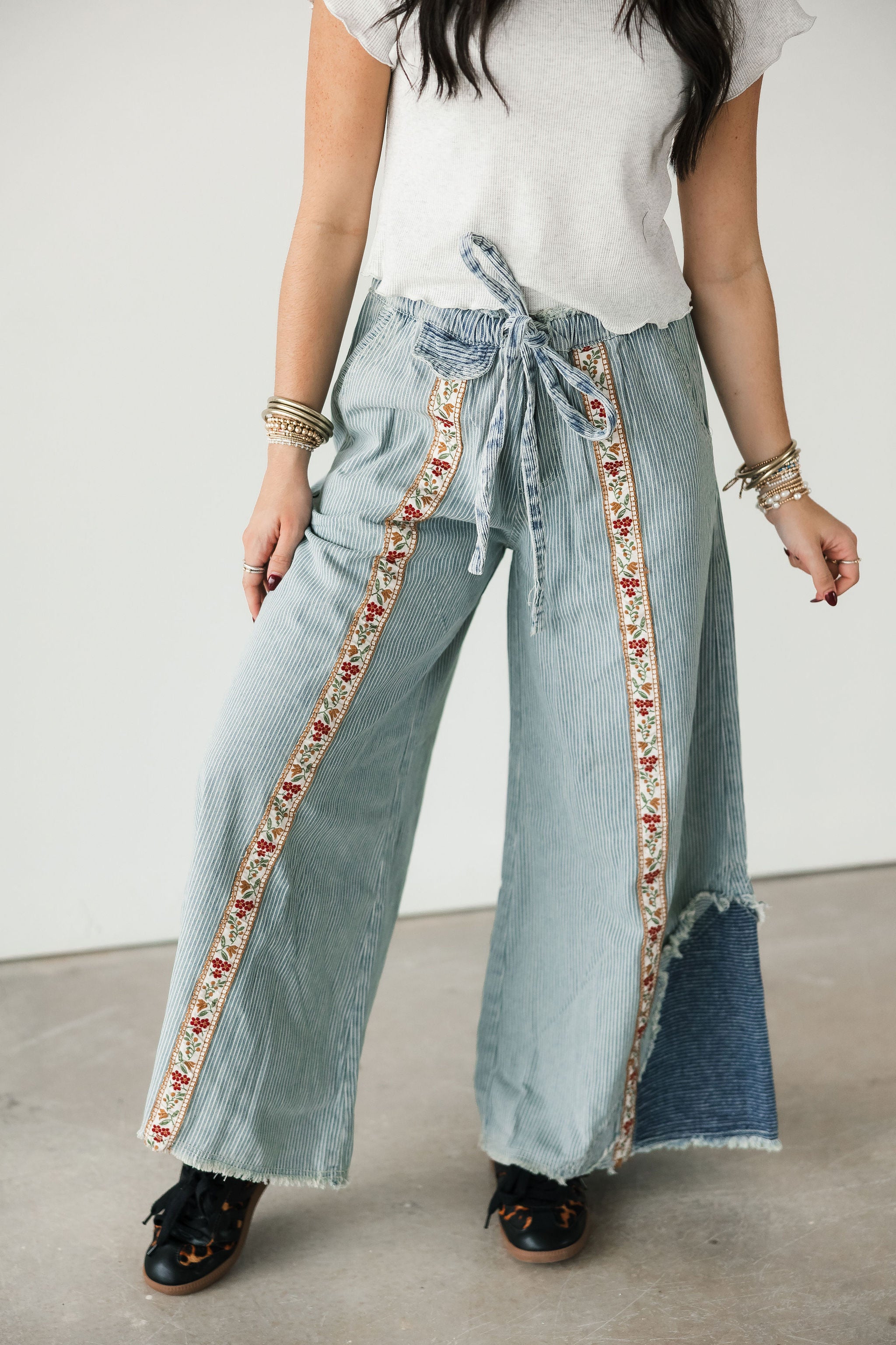 The Bloom Stripe Pants in Striped Denim bring a fresh mix of whimsy and edge to your wardrobe. Designed with an oversized, relaxed fit, these woven bottoms feature a standout floral trim running down the front of each leg for the prettiest pop of detail. A decorative mini pocket flap, buckle-back accent, and trimmed back patch pocket add charm and character from every angle. Style them with a simple top for a statement look or pair them with something bold for a fashion-forward moment. Perfect for a standout denim moment. Sage is wearing a small.