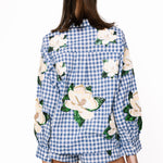 The Queen Of Sparkles Blue & White Checkered Scattered Magnolia Button Up Top features a relaxed fit with a crisp collar and long sleeves for effortless style. Magnolia flower graphics add a touch of Southern elegance to the playful checkered print. Pair it with the matching shorts or your favorite denim for a festive yet polished look.