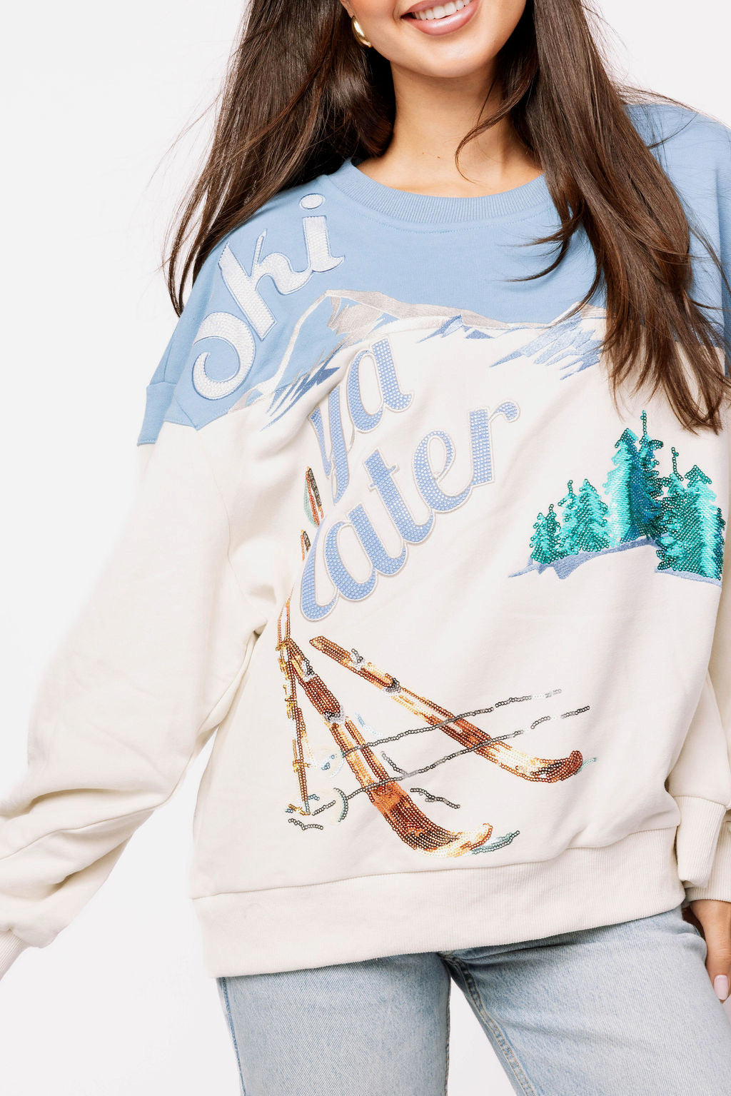The Queen Of Sparkles Blue & White 'Ski Ya Later' Sweatshirt brings mountain vibes to your winter wardrobe. Featuring bold graphics, a relaxed fit, and signature sparkle detailing, it’s the ultimate cozy-chic layer whether you’re slopeside or just dreaming of your next ski trip.