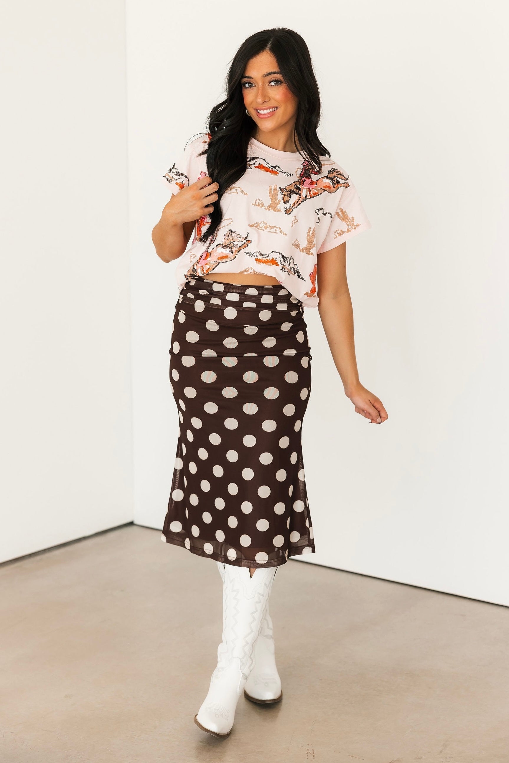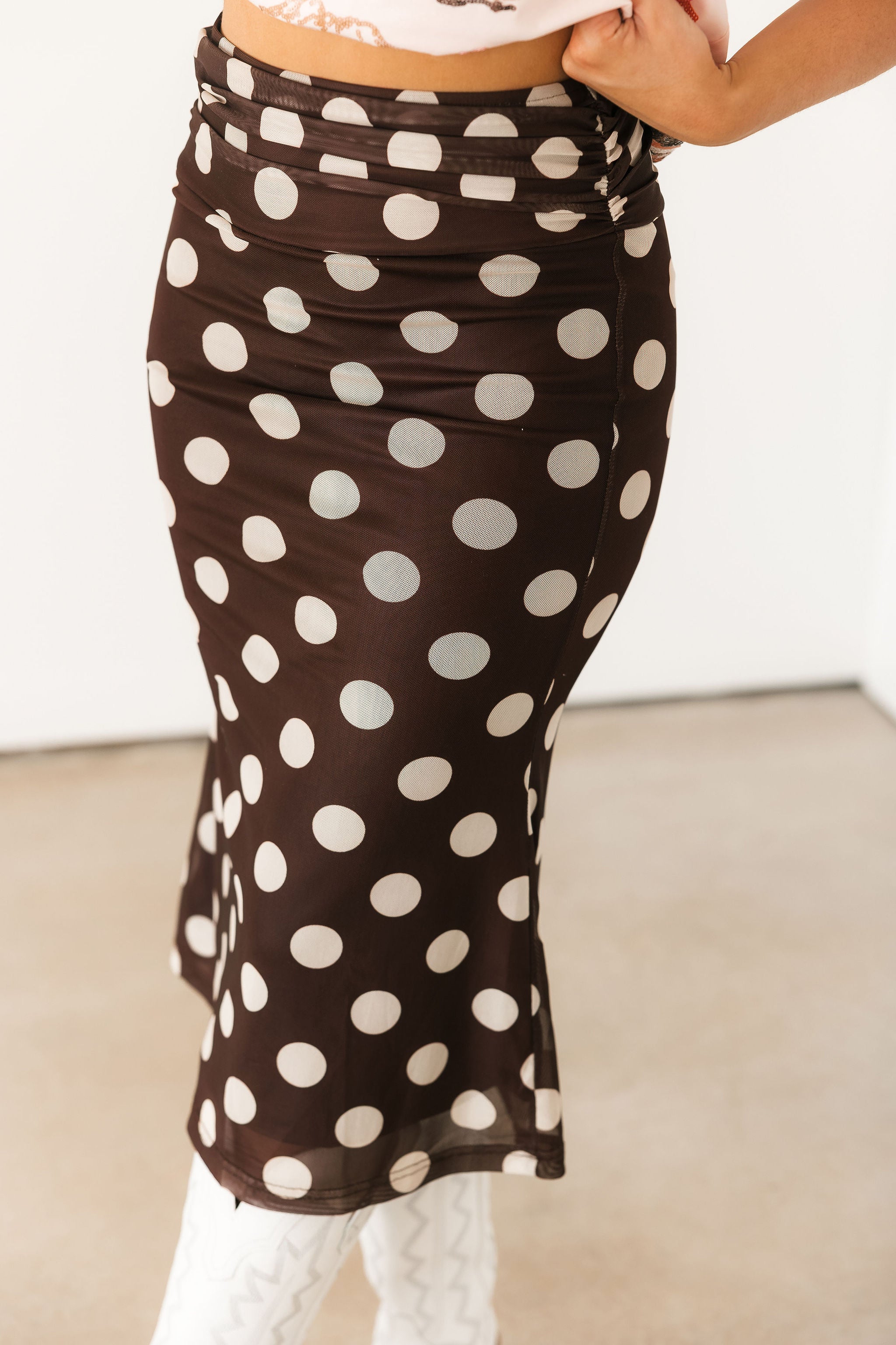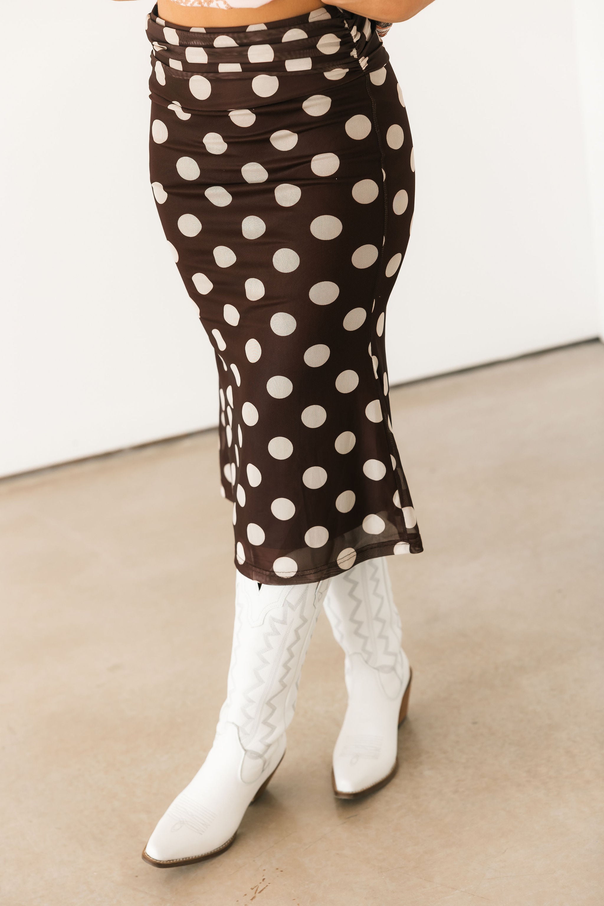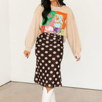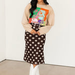 The Bold Polka Dot Midi Skirt in Chocolate features a fitted silhouette with a midi length and bold cream polka dots on a rich chocolate base. Designed with a folded waistband, this skirt offers a stretchy, comfortable fit that moves with you. Perfect for dressing up for a night out or styling more casually, this piece adds a fun yet timeless touch to your wardrobe.