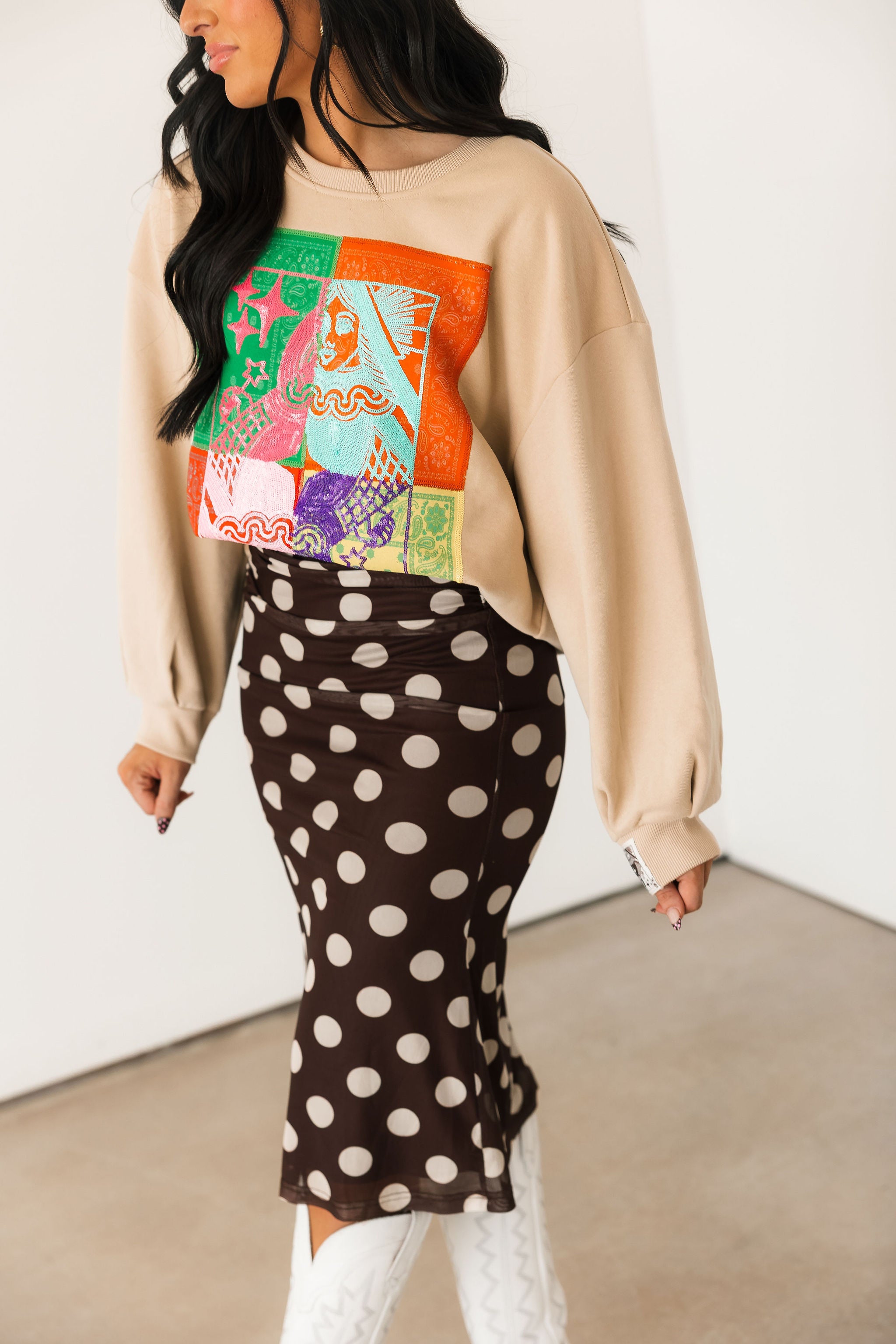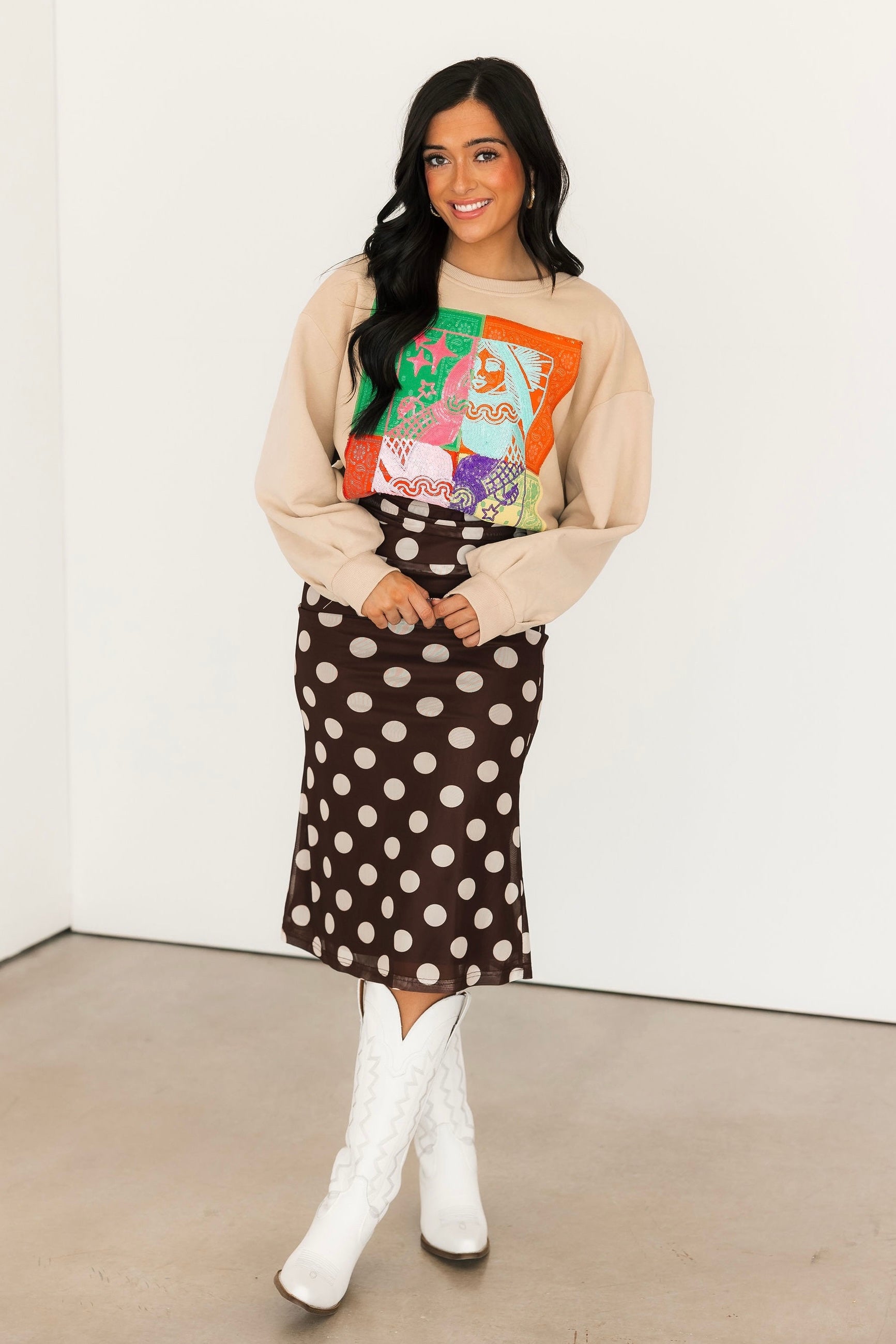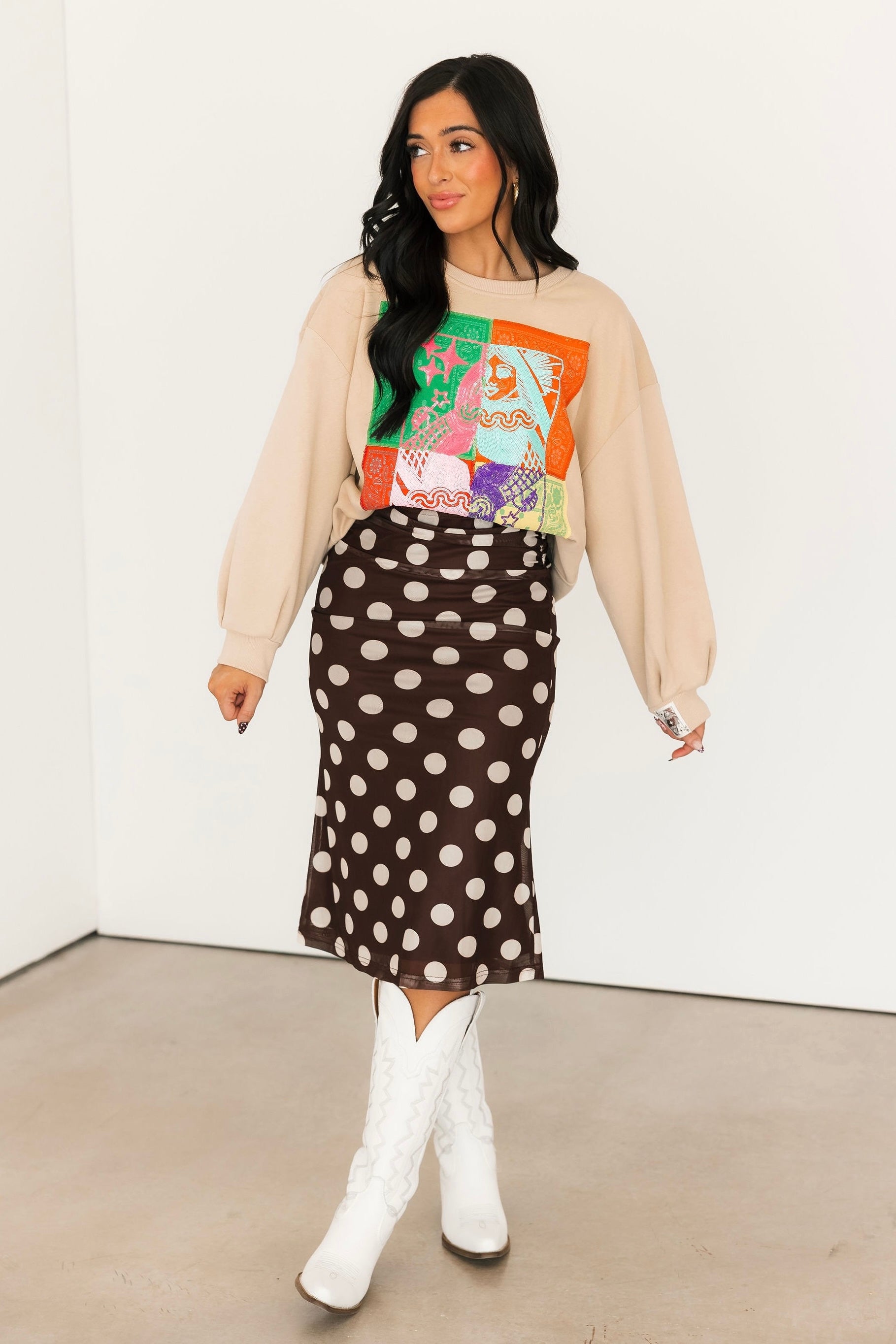 The Bold Polka Dot Midi Skirt in Chocolate features a fitted silhouette with a midi length and bold cream polka dots on a rich chocolate base. Designed with a folded waistband, this skirt offers a stretchy, comfortable fit that moves with you. Perfect for dressing up for a night out or styling more casually, this piece adds a fun yet timeless touch to your wardrobe.