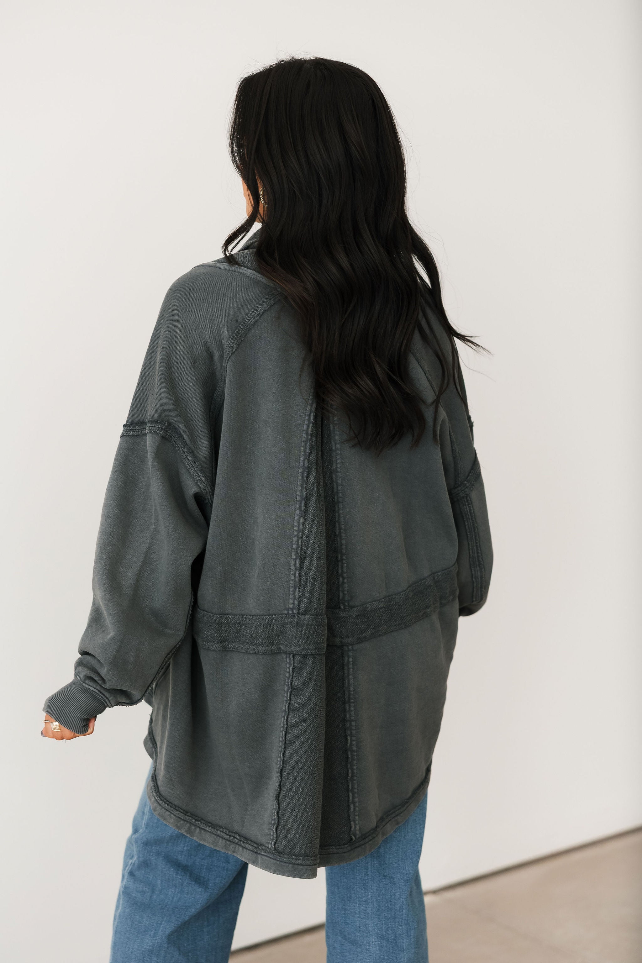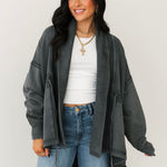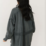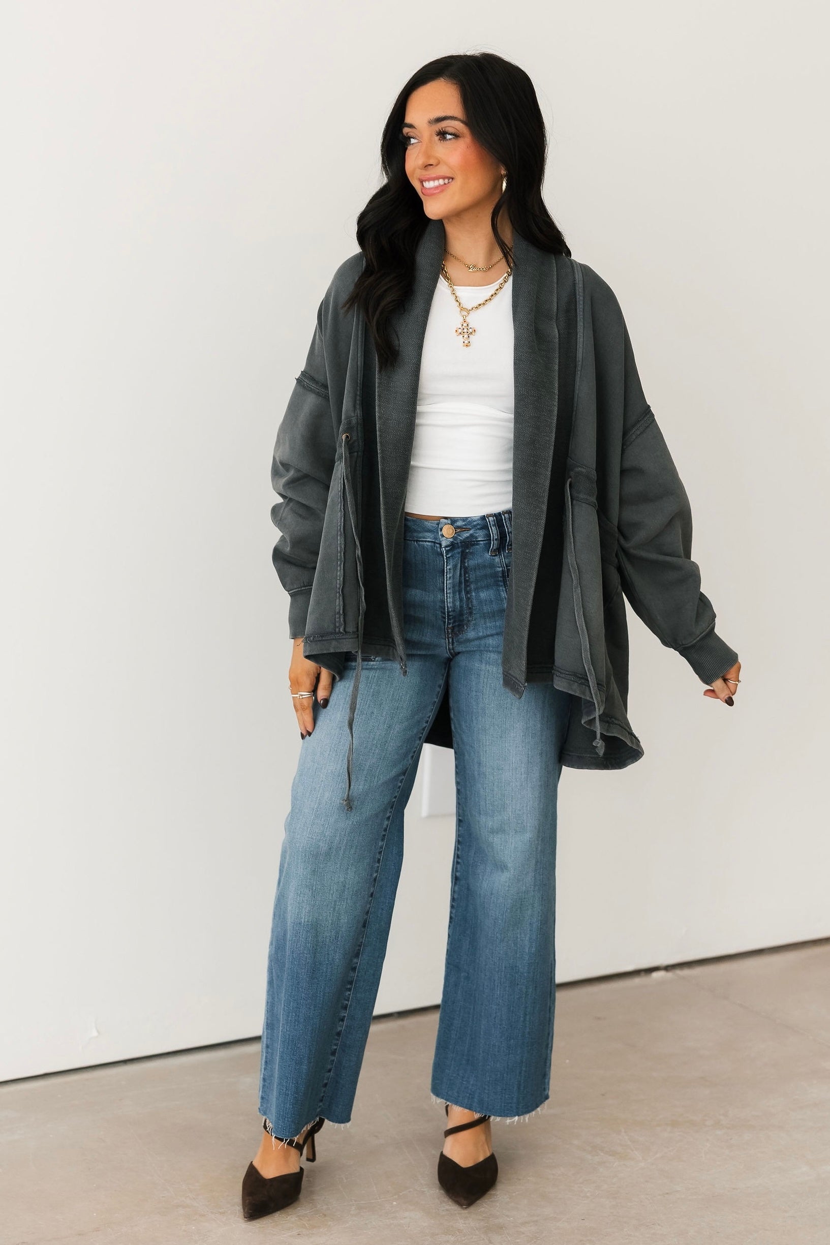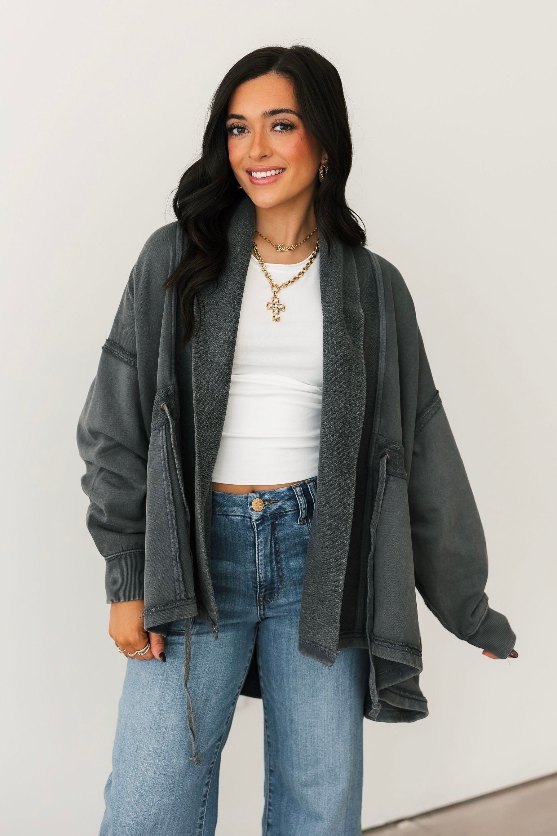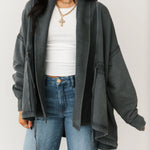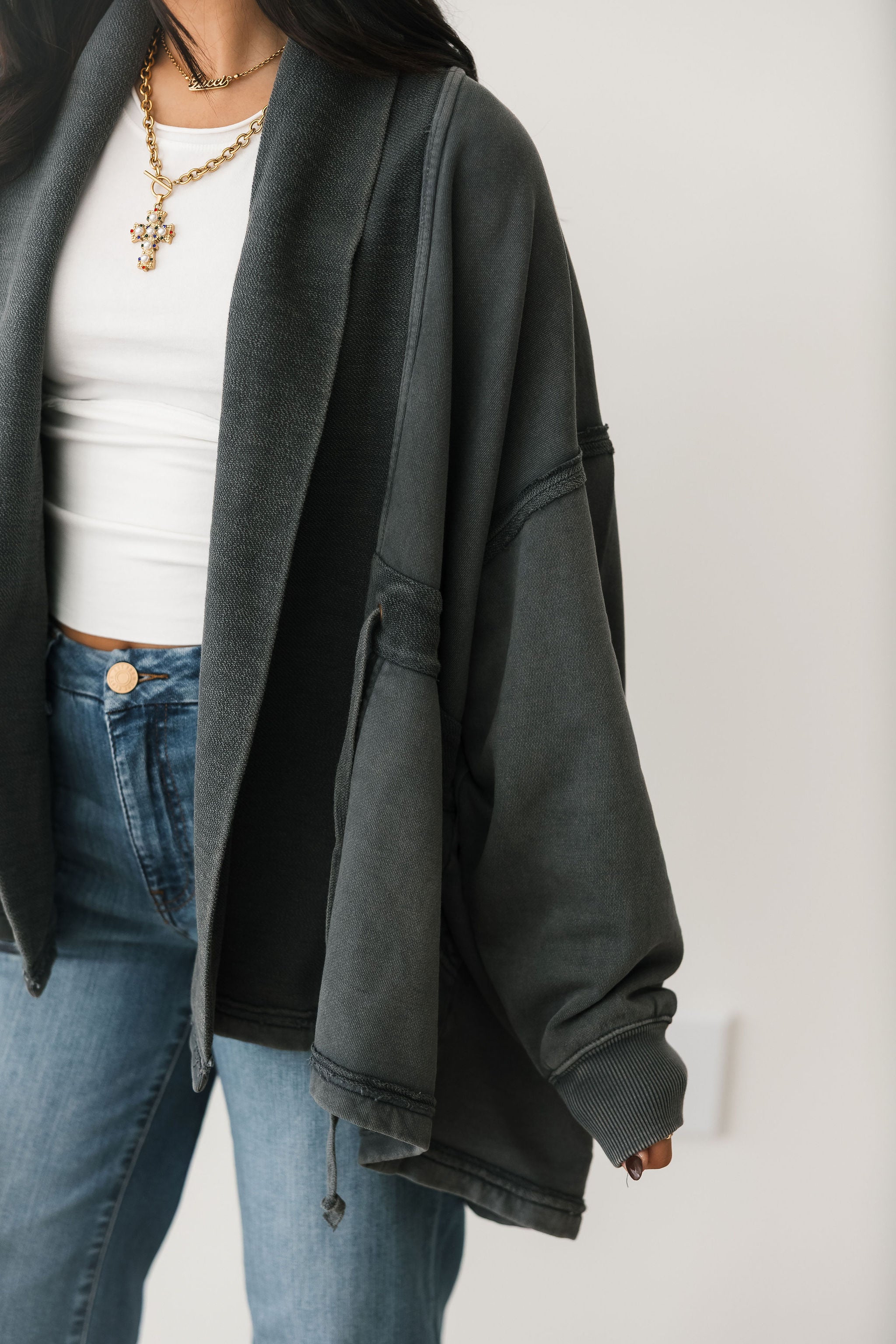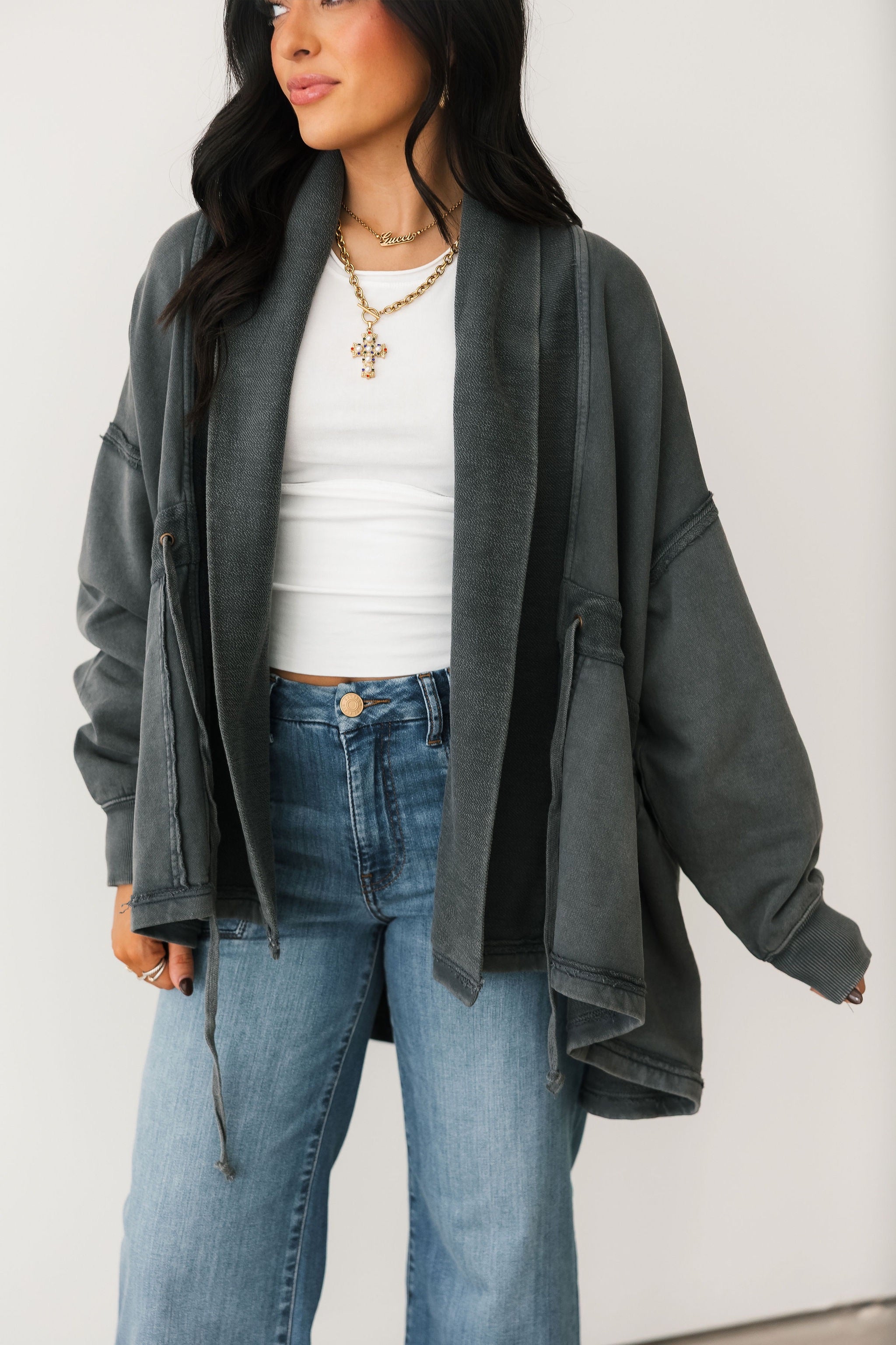 Being comfy just got cooler with this unique longline sweatshirt, featured in an open-front design with a drawcord waistline and vented back detail. Sage is wearing an xs.