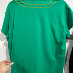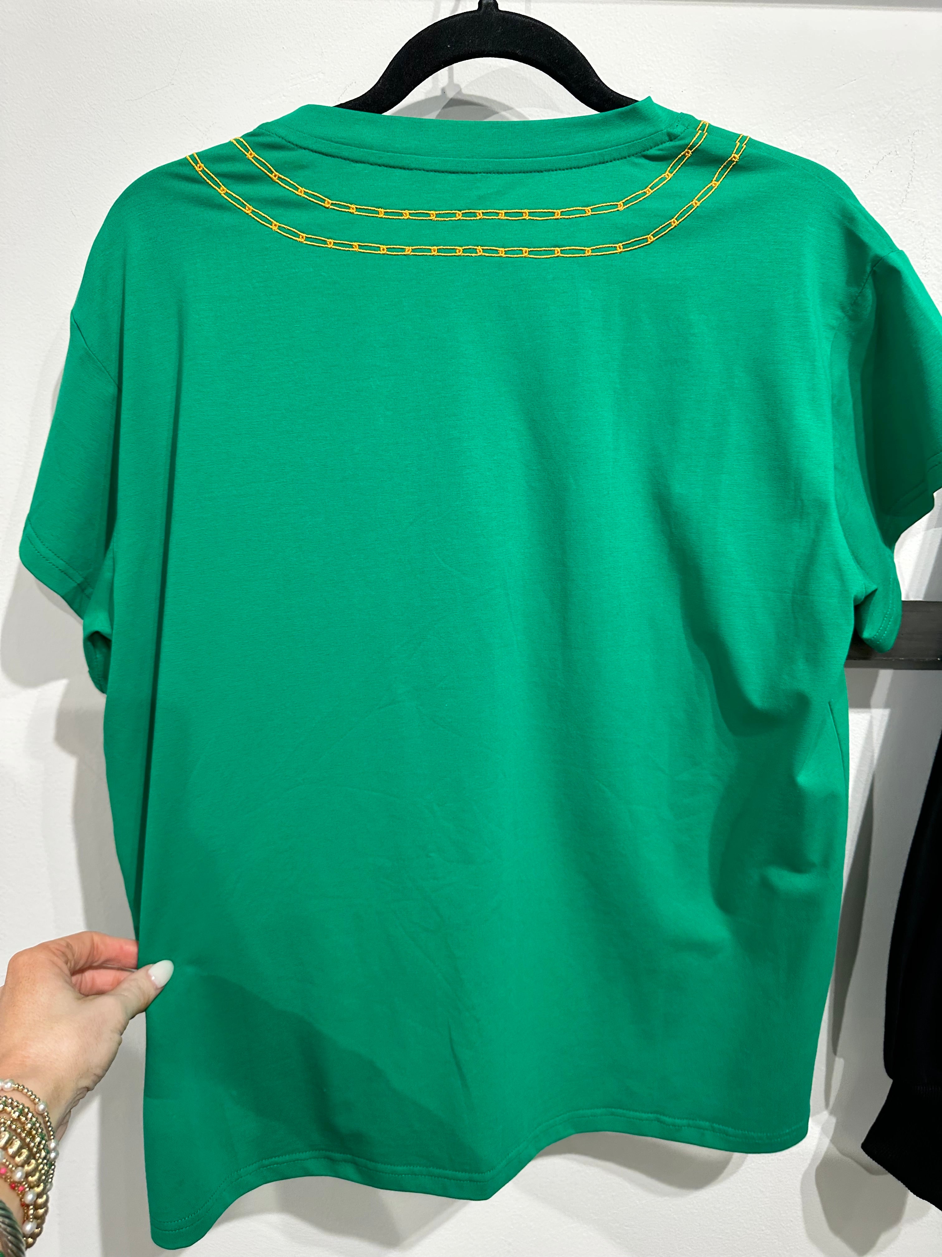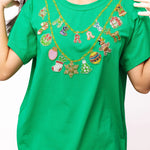 The Queen Of Sparkles Bright Green Necklace Tee is a relaxed-fit classic with a merry twist. Designed with short sleeves, a crew neckline, and a statement necklace graphic, it blends comfort with festive sparkle. Pair it with denim for casual holiday outings or tuck it into a skirt for a dressed-up seasonal style.
