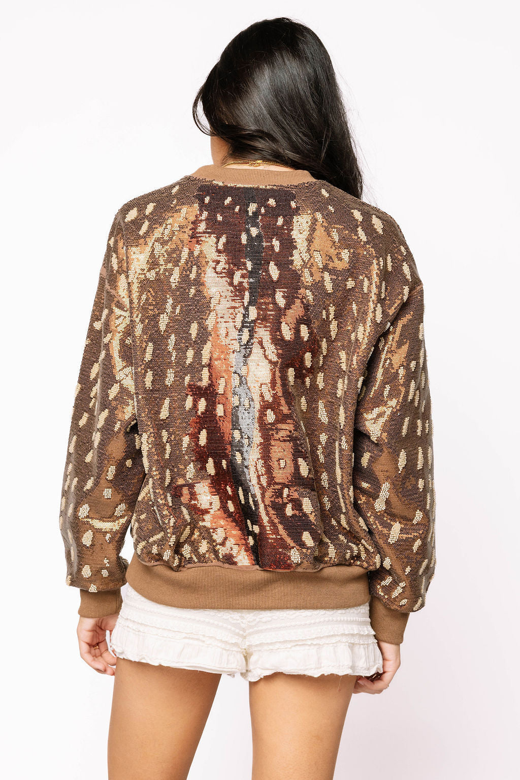 Embrace cozy, woodland vibes this fall! This relaxed-fit sweatshirt features a soft brown base adorned with a charming deer print, perfect for layering. The classic crewneck adds effortless comfort to your seasonal wardrobe.