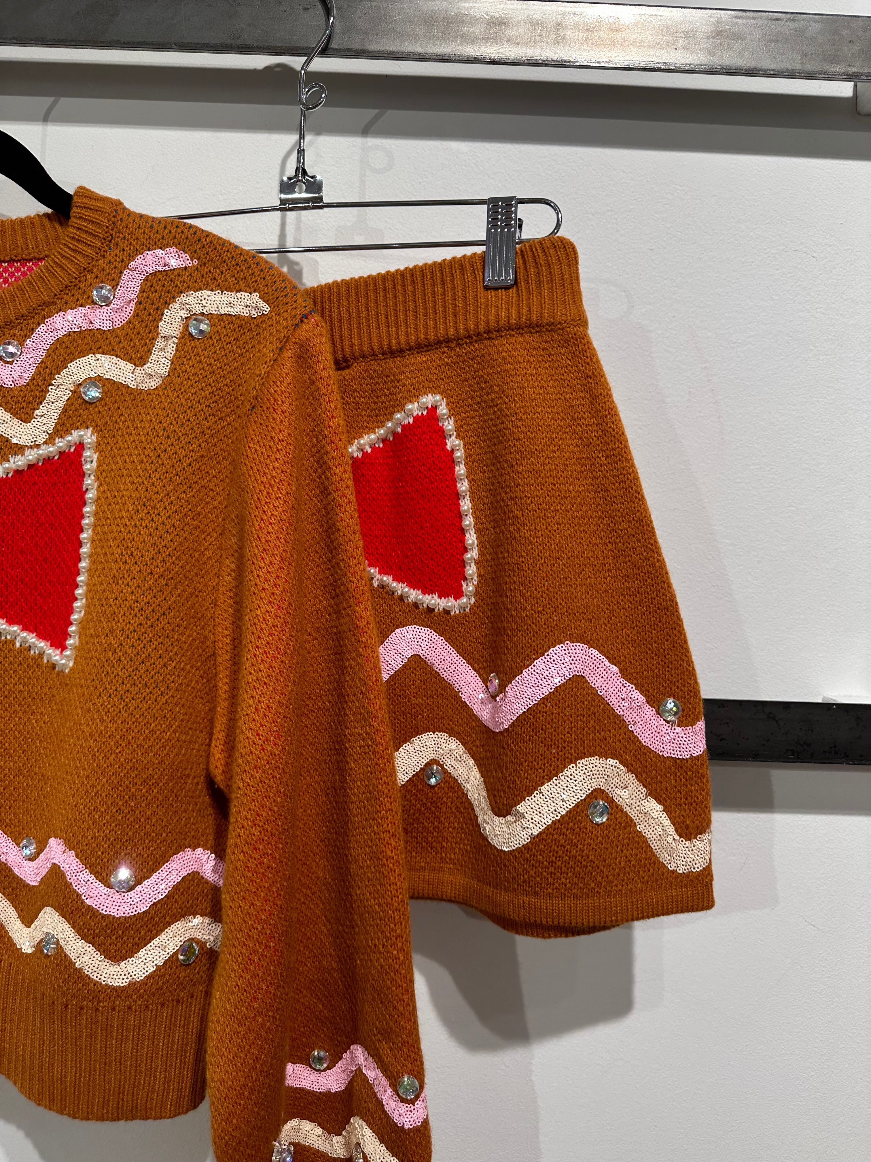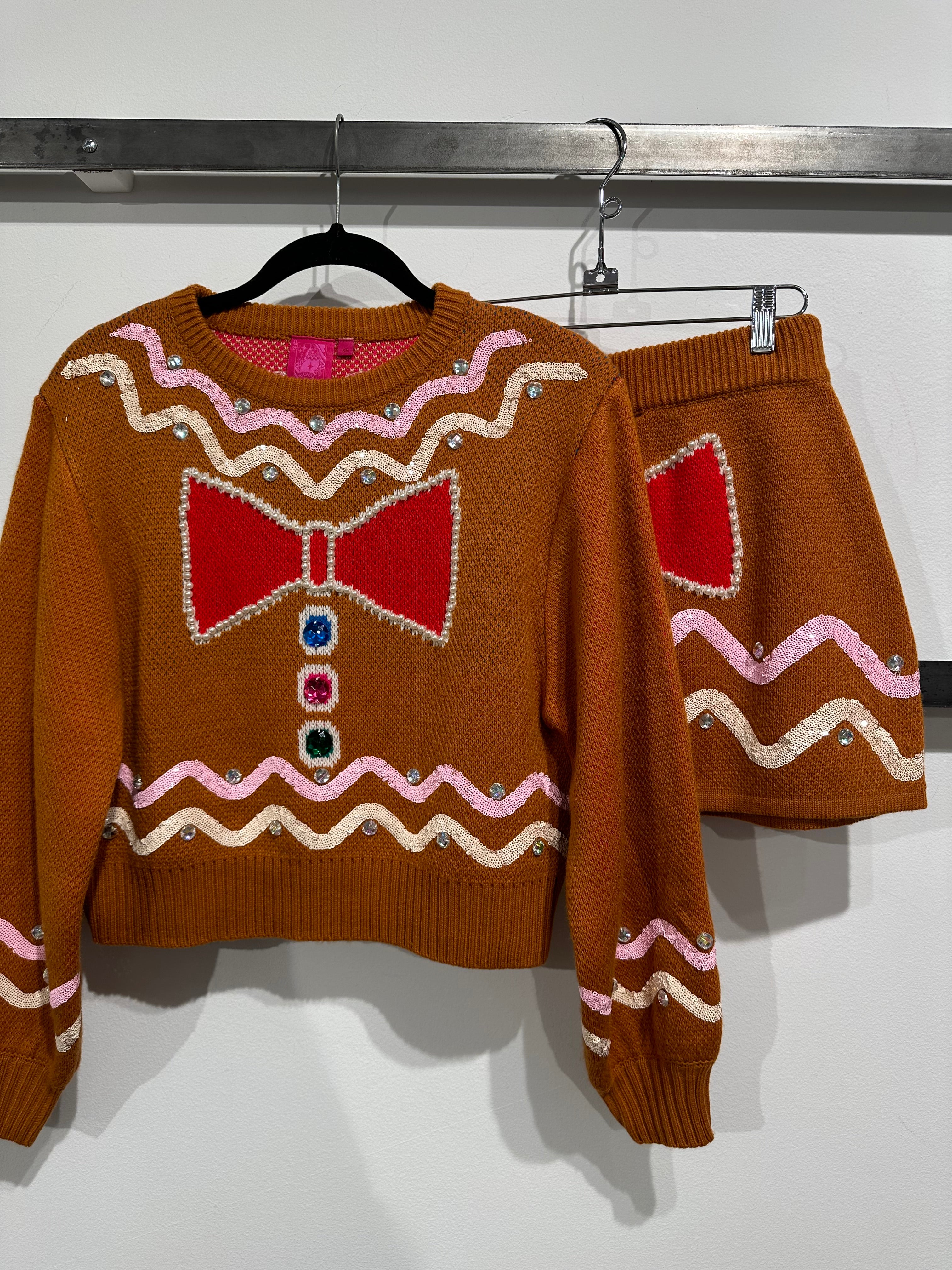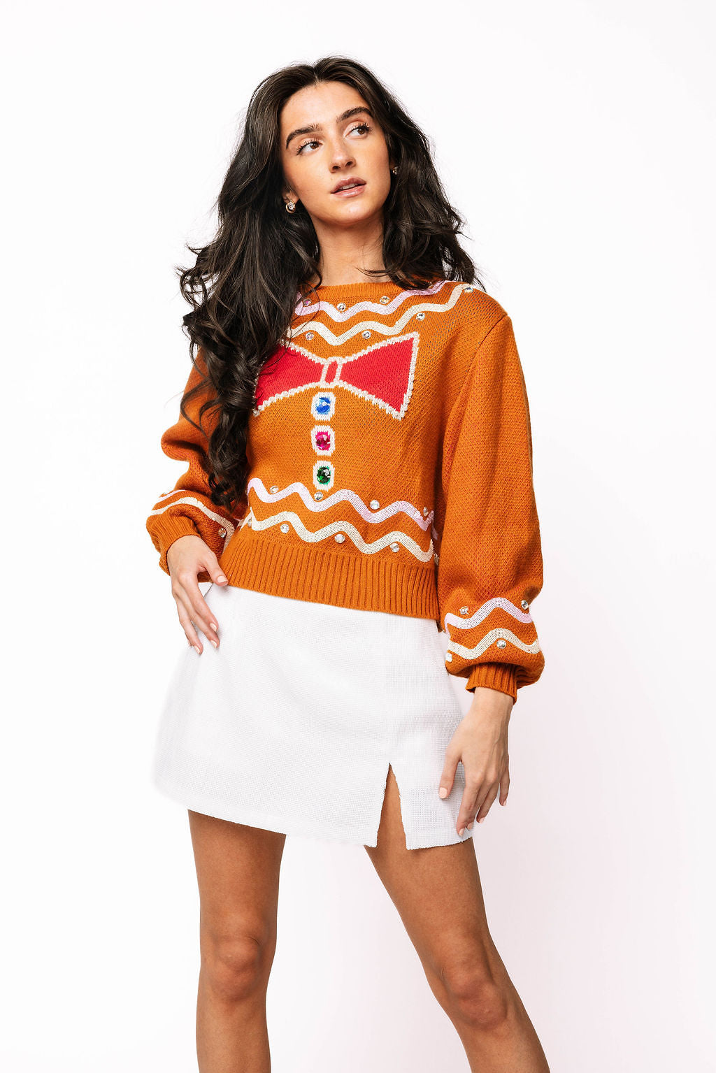 Brown Gingerbread Man Jewel Bow Tie Sweater | Queen Of Sparkles