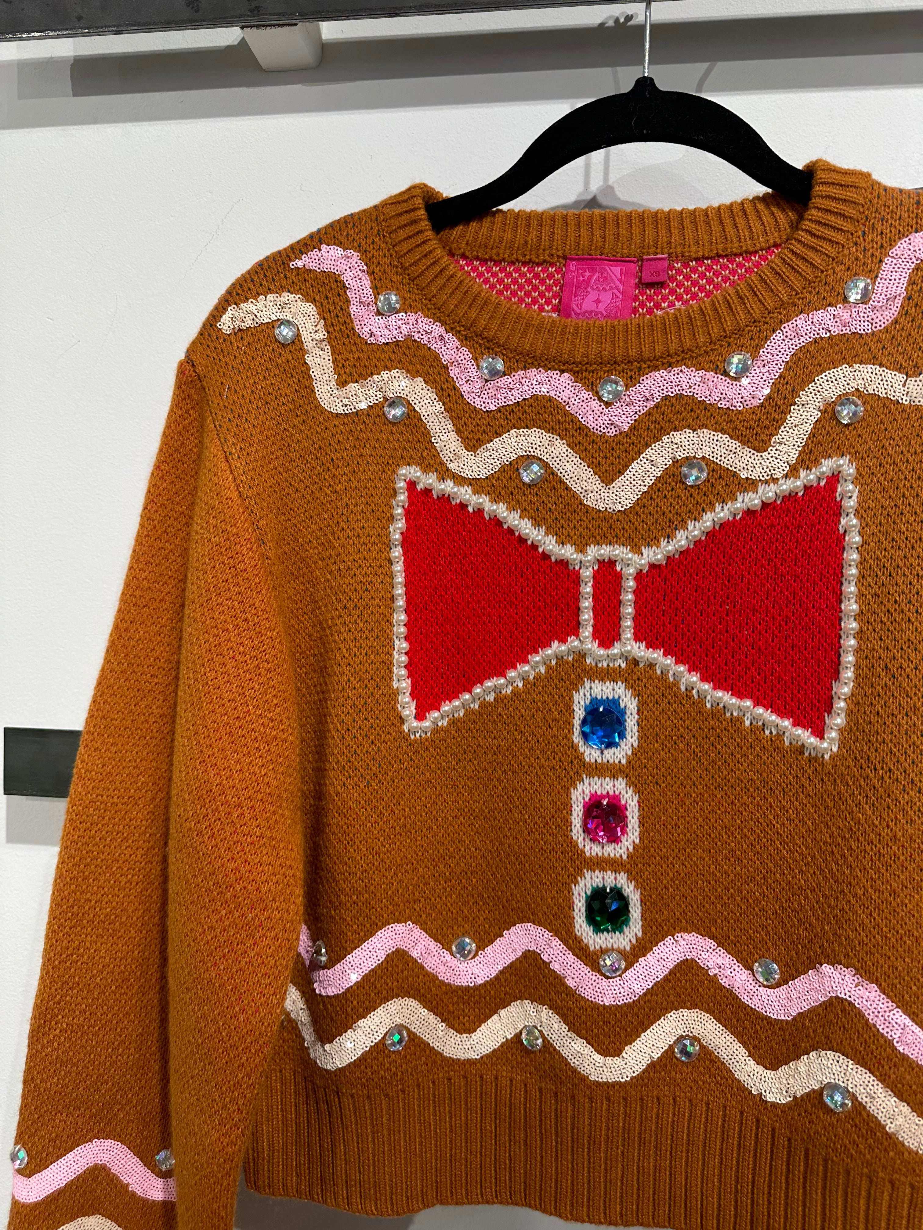 Queen Of Sparkles Brown Gingerbread Man Jewel Bow Tie Sweater