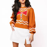 The Queen Of Sparkles Brown Gingerbread Man Jewel Bow Tie Sweater is a cheerful holiday essential with a relaxed fit and classic crewneck design. Featuring long sleeves and a sparkling gingerbread man graphic with a jeweled bow tie, it’s perfect for layering, pairing with your favorite bottoms, or styling with other Queen Of Sparkles pieces for a complete holiday-ready outfit.