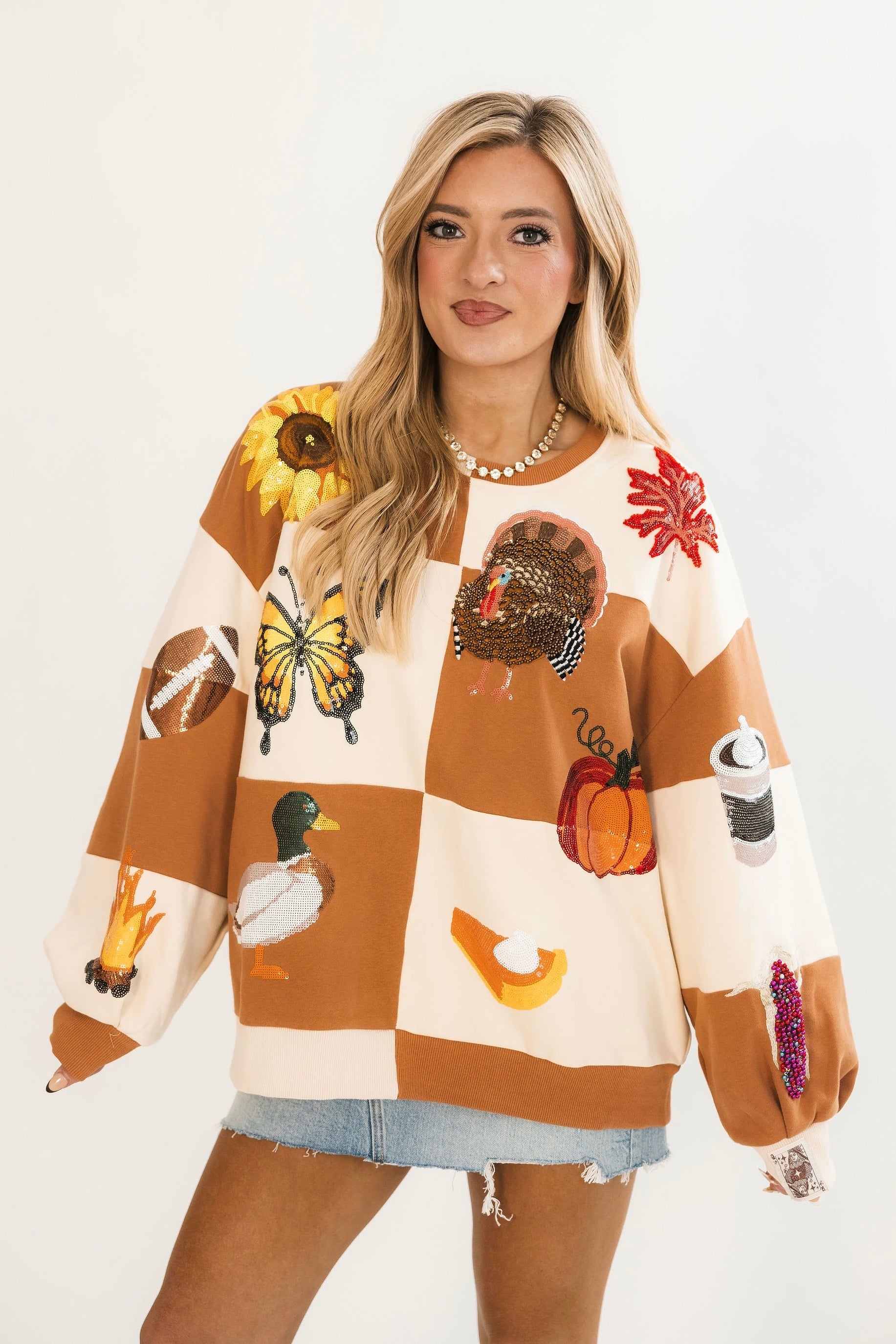Celebrate all things cozy and festive with this relaxed-fit crewneck sweatshirt. Featuring a classic brown and ivory checkered pattern, it’s sprinkled with sparkly fall icons—sunflowers, footballs, turkeys, ducks, pumpkins, and more—for a playful seasonal touch. Perfect for layering or pairing with jeans and leggings for effortless fall style. Lexi is wearing an XS.