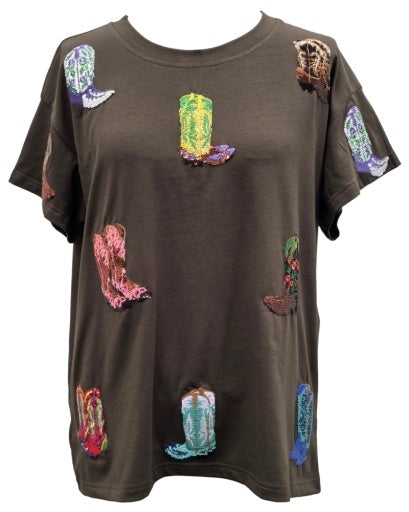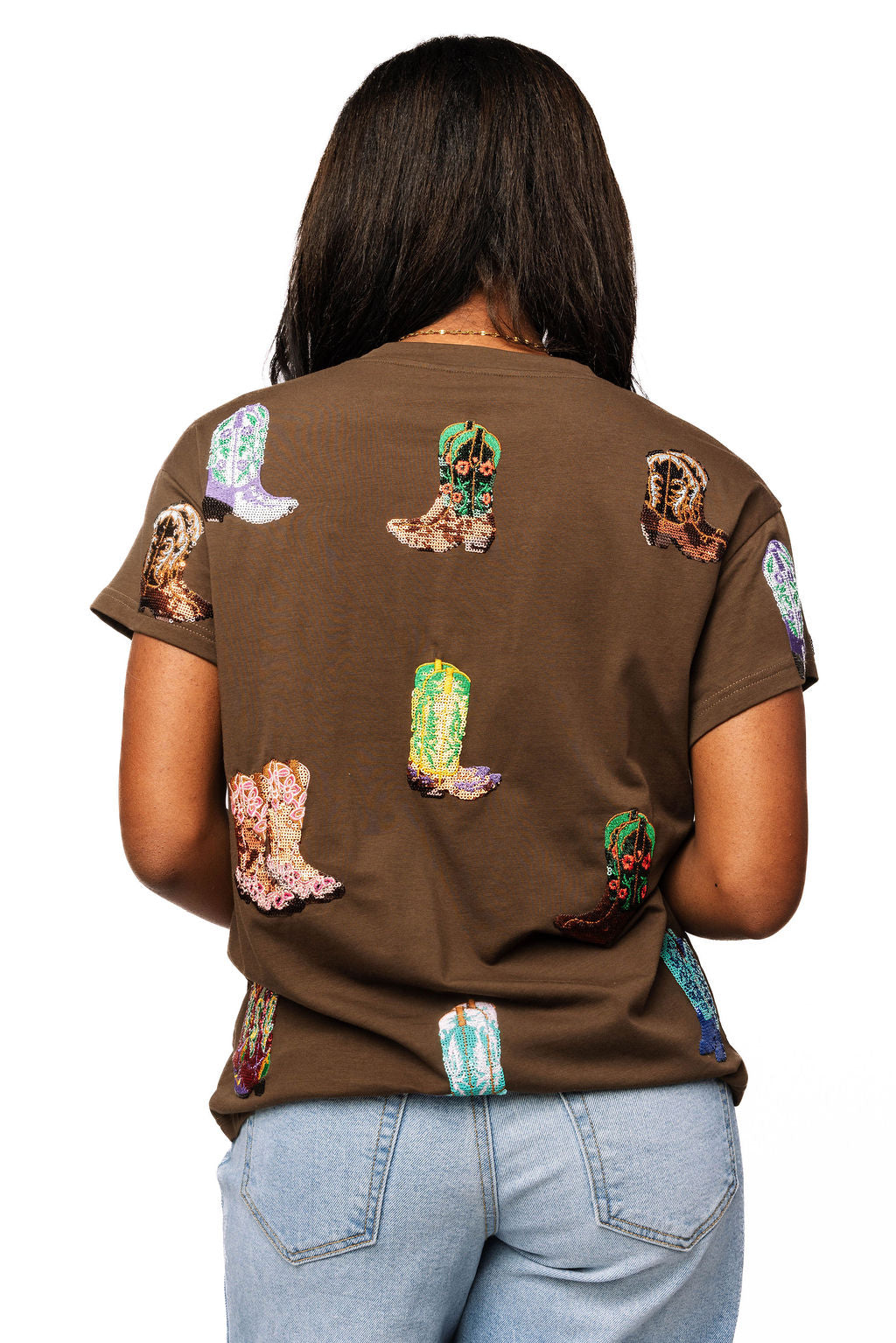 The Queen Of Sparkles Brown Multi Cowboy Boot Tee features a relaxed fit with a crewneck and short sleeves. Its fun cowboy boot graphic adds a subtle statement to a wardrobe staple, making it effortless to pair with jeans, shorts, or skirts.