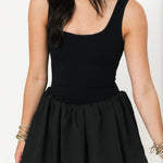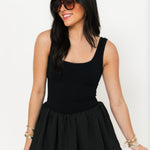 Sporty meets chic in this black bubble mini dress featuring a fitted bodice, wide shoulder straps, and a flattering square neckline. Its lightweight, easy-moving design makes it perfect for days on the go while still keeping that effortless style factor. Sage is wearing a small.