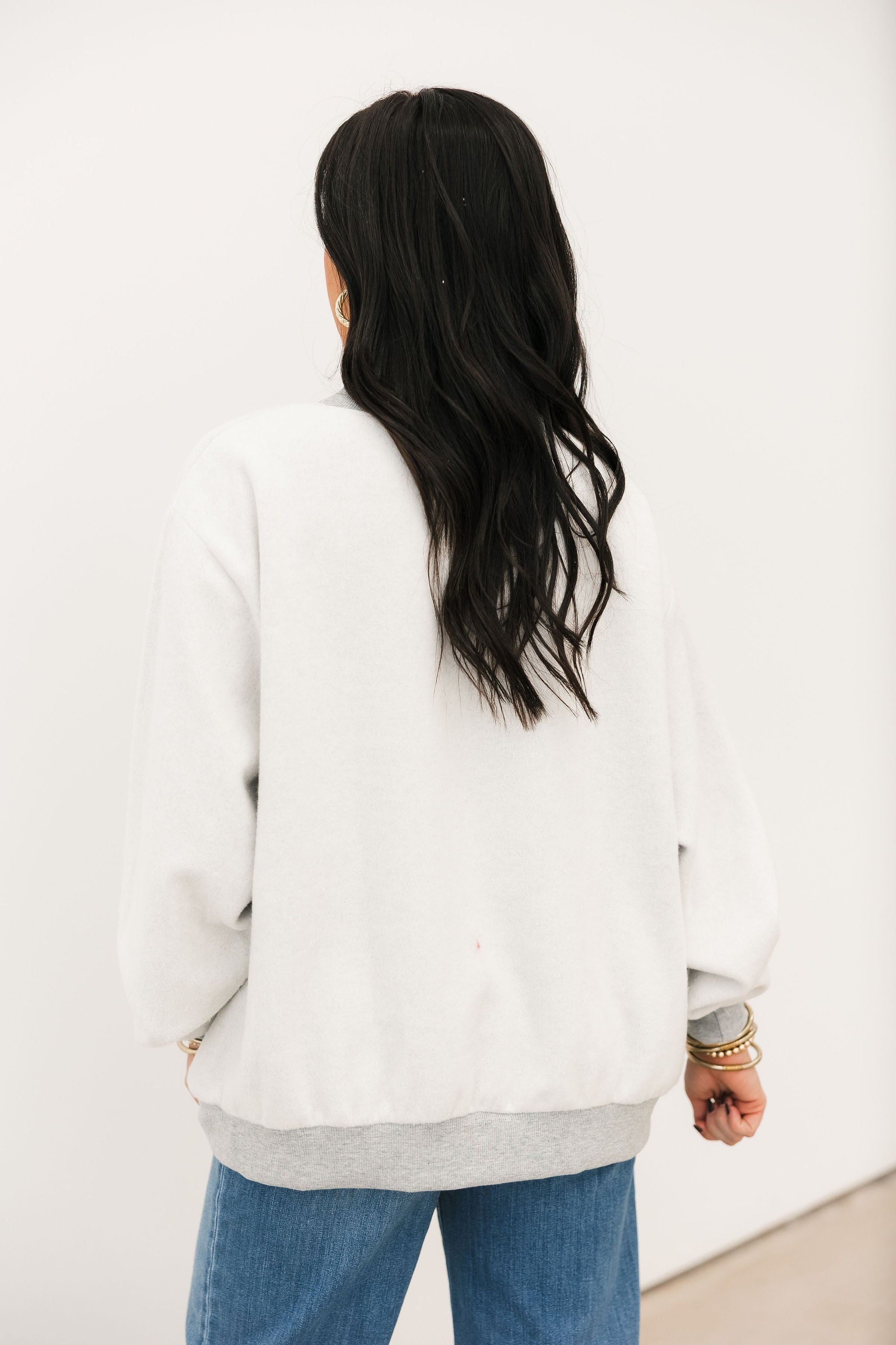This relaxed, oversized sweatshirt features a cozy mock neckline and long sleeves for ultimate comfort. Soft, warm, and effortlessly cool, it’s the ideal throw-on piece for casual days, travel, or layering through every season. Sage is wearing a small.