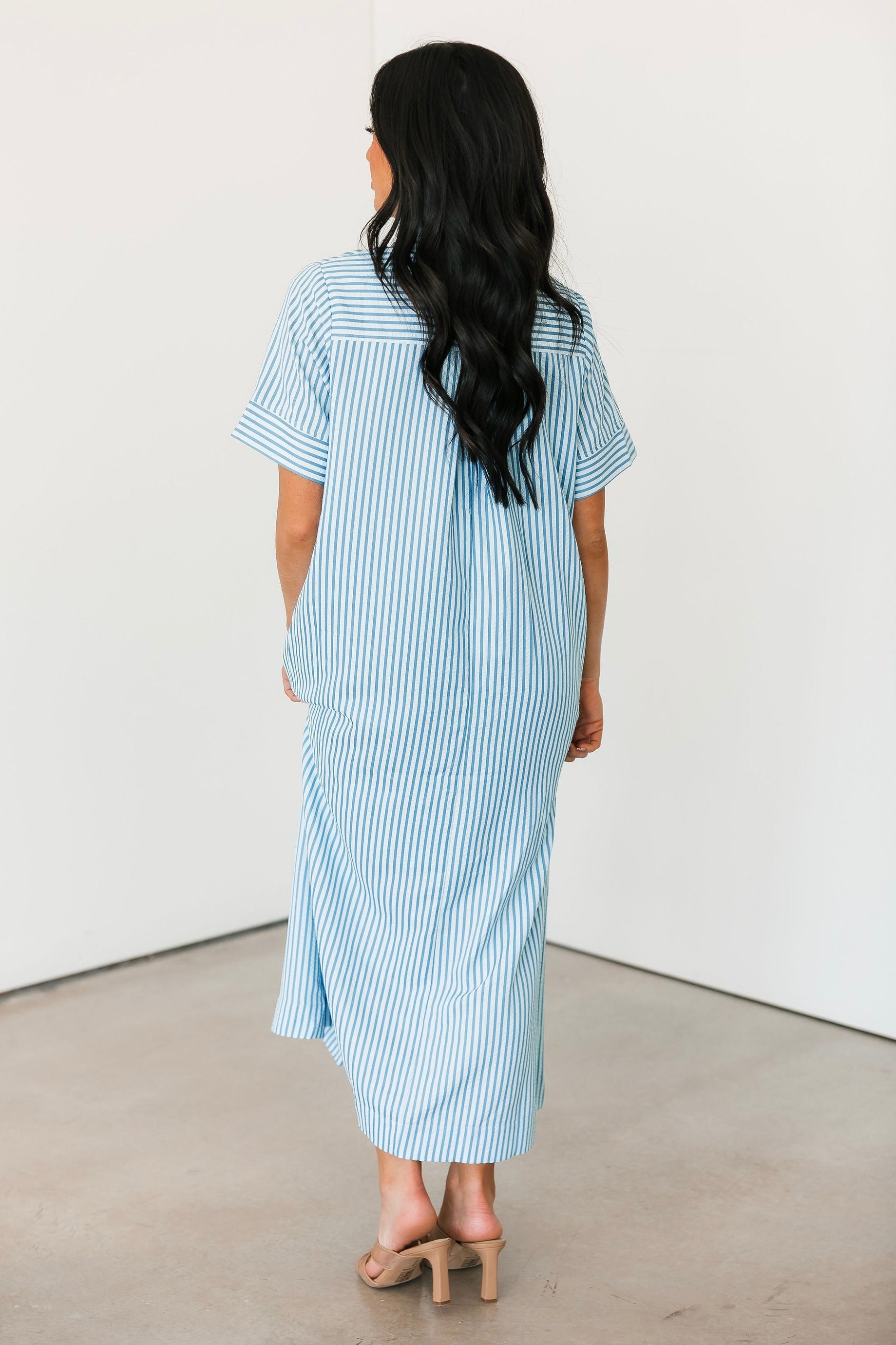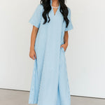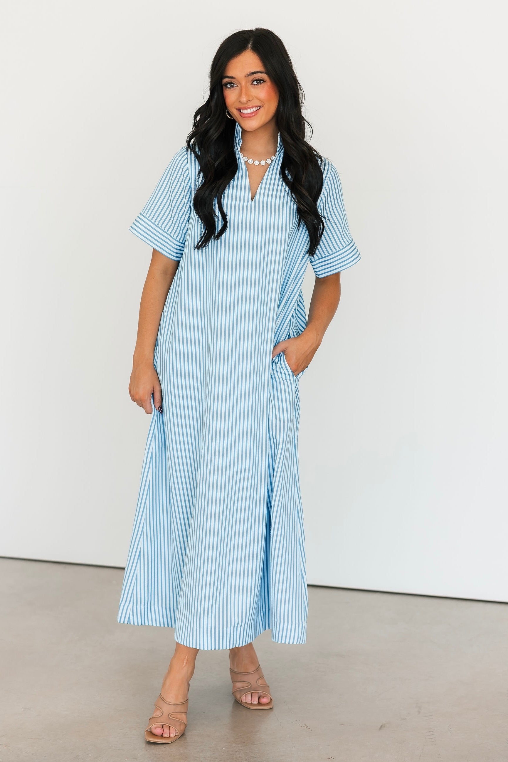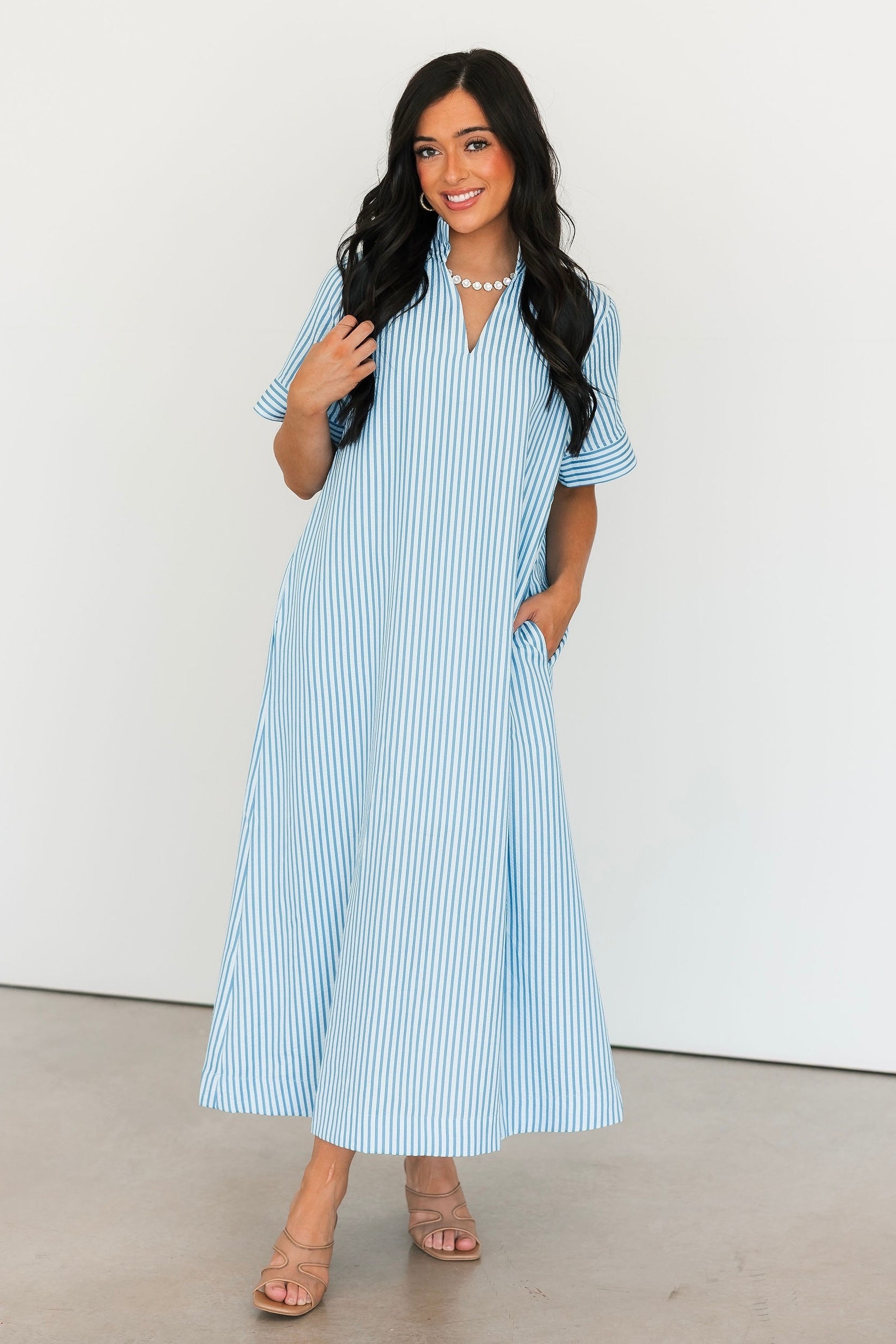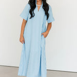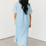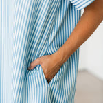 The Cambria Midi Dress in Blue is a stunning striped midi designed with an easy, relaxed, and flowy fit that feels as good as it looks. Its effortless silhouette makes it a true statement piece while still being simple to style. Just add your favorite jewelry and a great pair of heels for an instantly polished look that works for everything from brunch dates to special occasions. Sage is wearing a small.