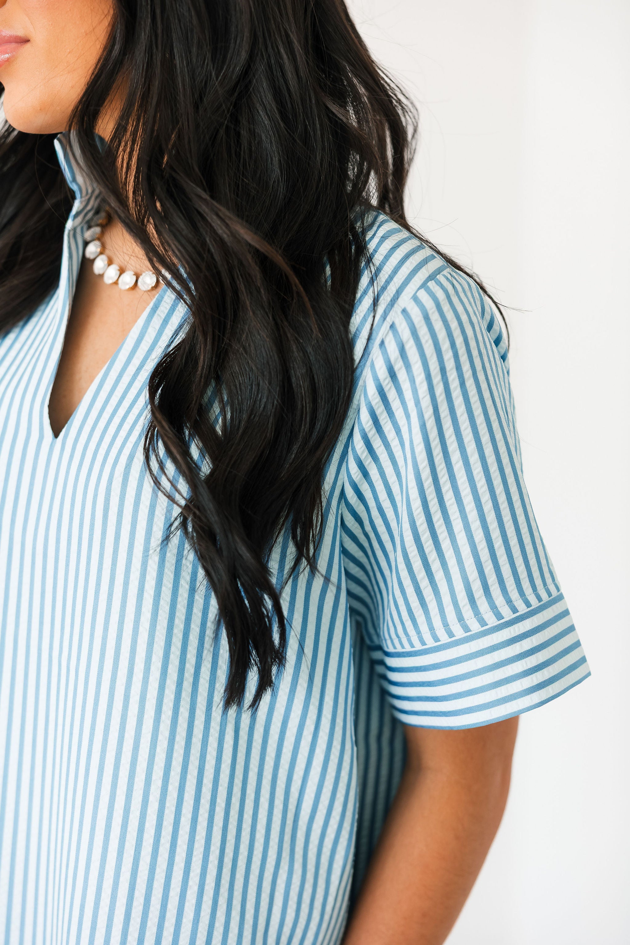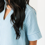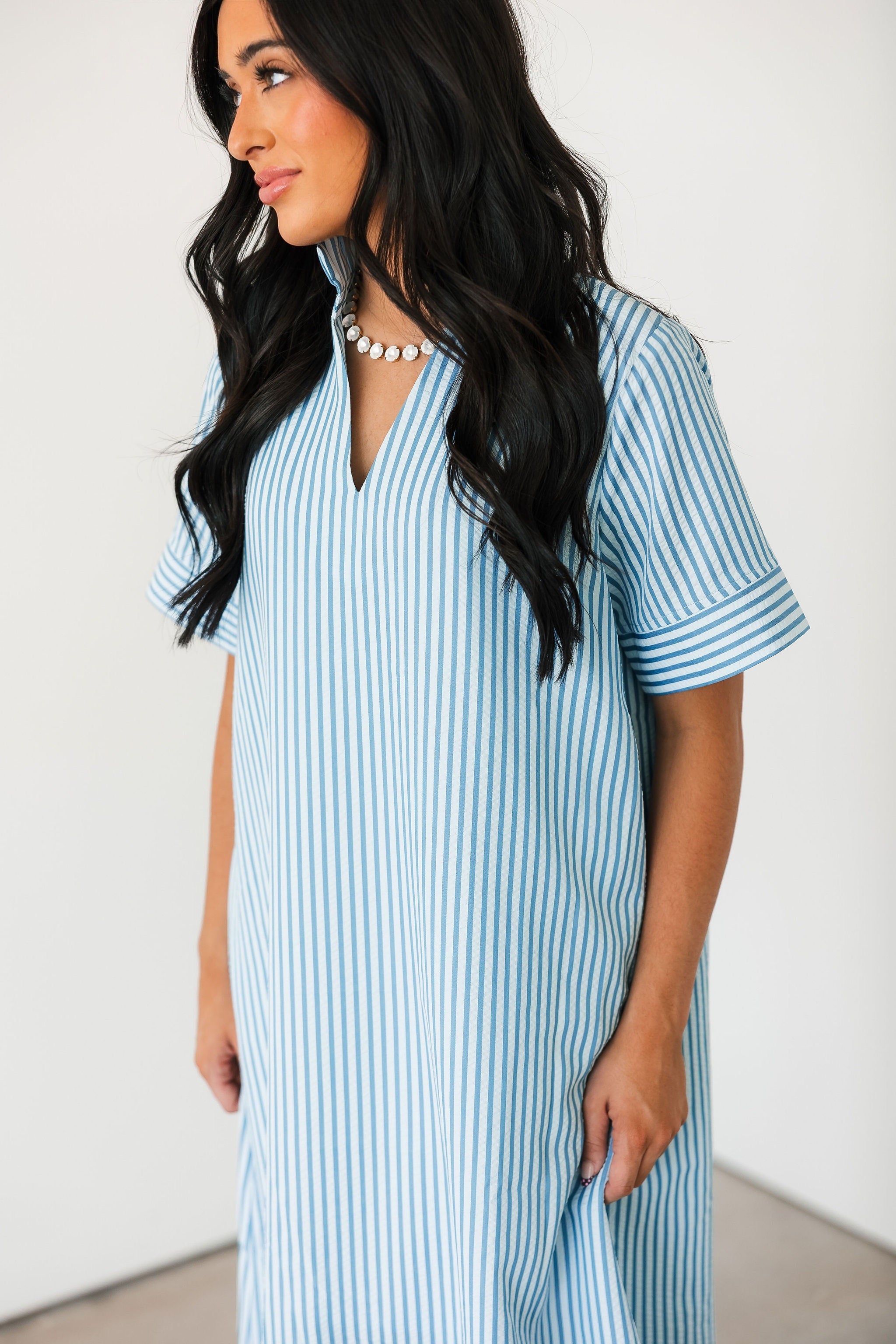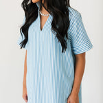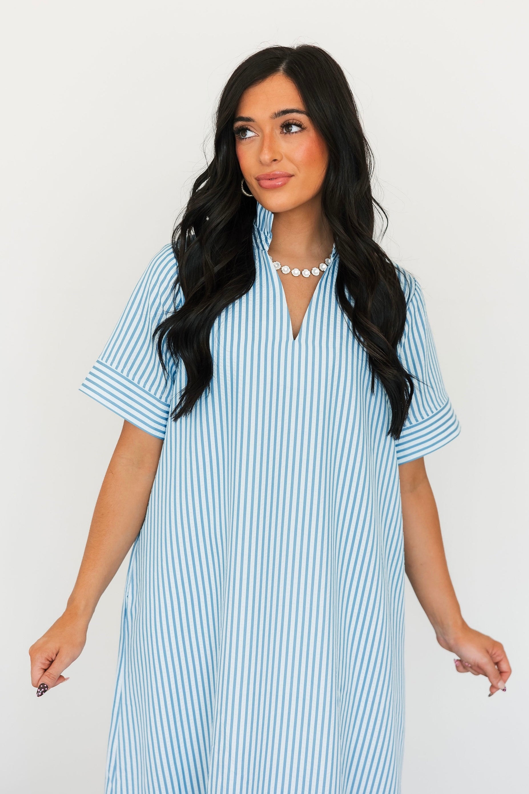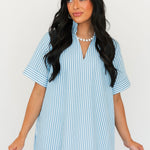 The Cambria Midi Dress in Blue is a stunning striped midi designed with an easy, relaxed, and flowy fit that feels as good as it looks. Its effortless silhouette makes it a true statement piece while still being simple to style. Just add your favorite jewelry and a great pair of heels for an instantly polished look that works for everything from brunch dates to special occasions. Sage is wearing a small.