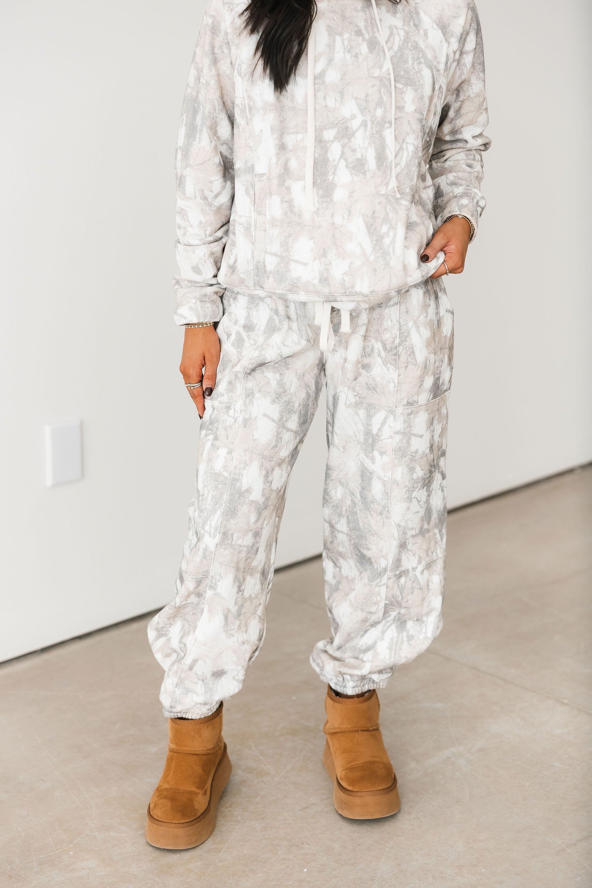 Cozy meets bold with these soft camo joggers, featuring an elastic waistband, cuffed ankles, and a relaxed fit. Sage is wearing a small.