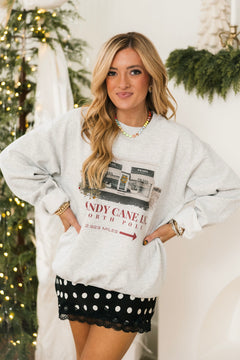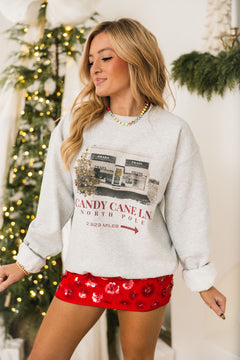 Sweet meets chic in the Candy Cane X Marfa Crewneck Sweatshirt. With its playful Prada-inspired “Candy Cane Lane” graphic, this cozy crewneck brings a high-fashion twist to holiday lounging. Lexi and Sage are both wearing a small.