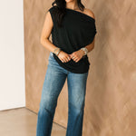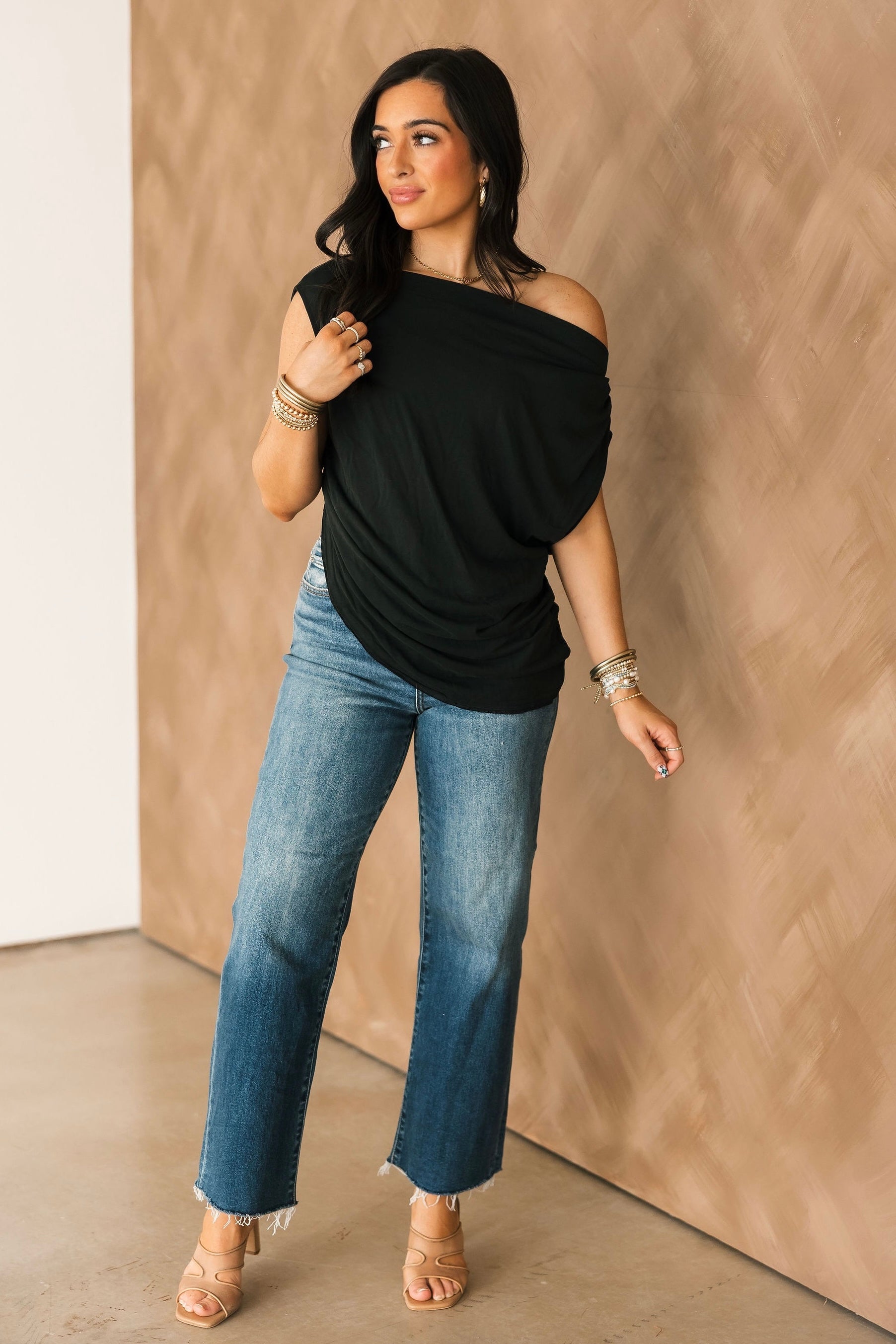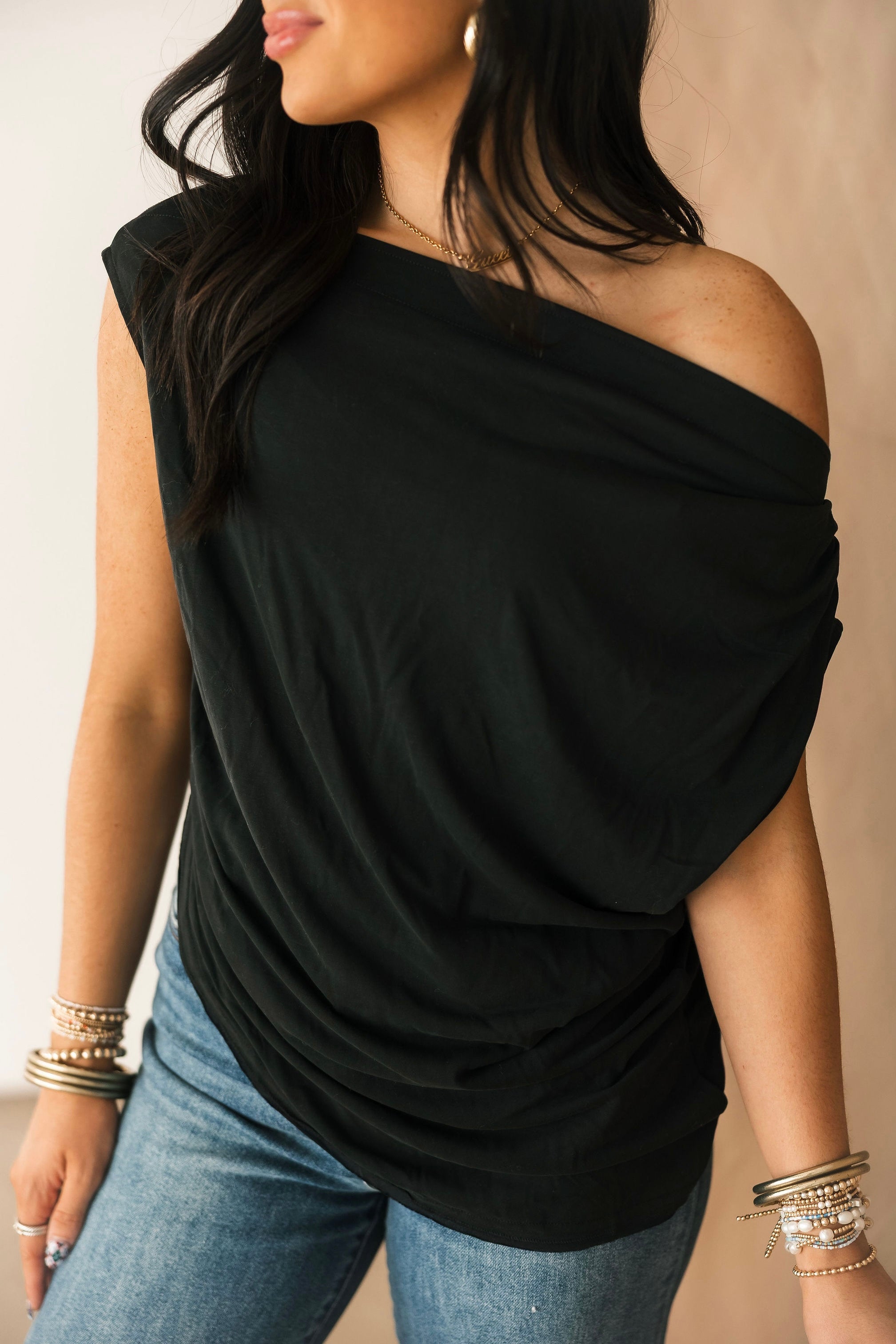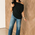 Draped to perfection, this versatile tunic is featured in the perfect slinky jersey with an off-the-shoulder neckline for that laidback look. Sage is wearing an xs.