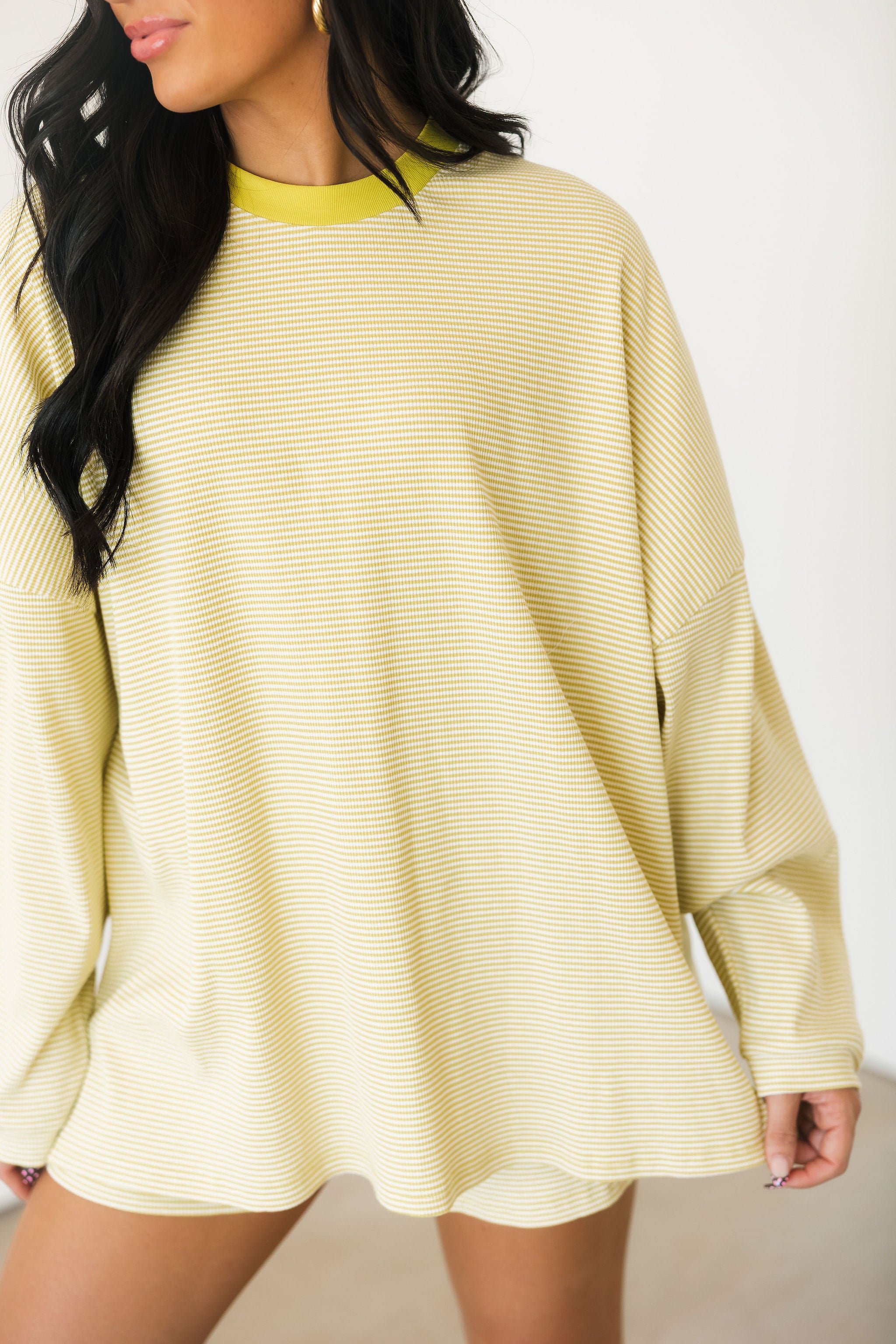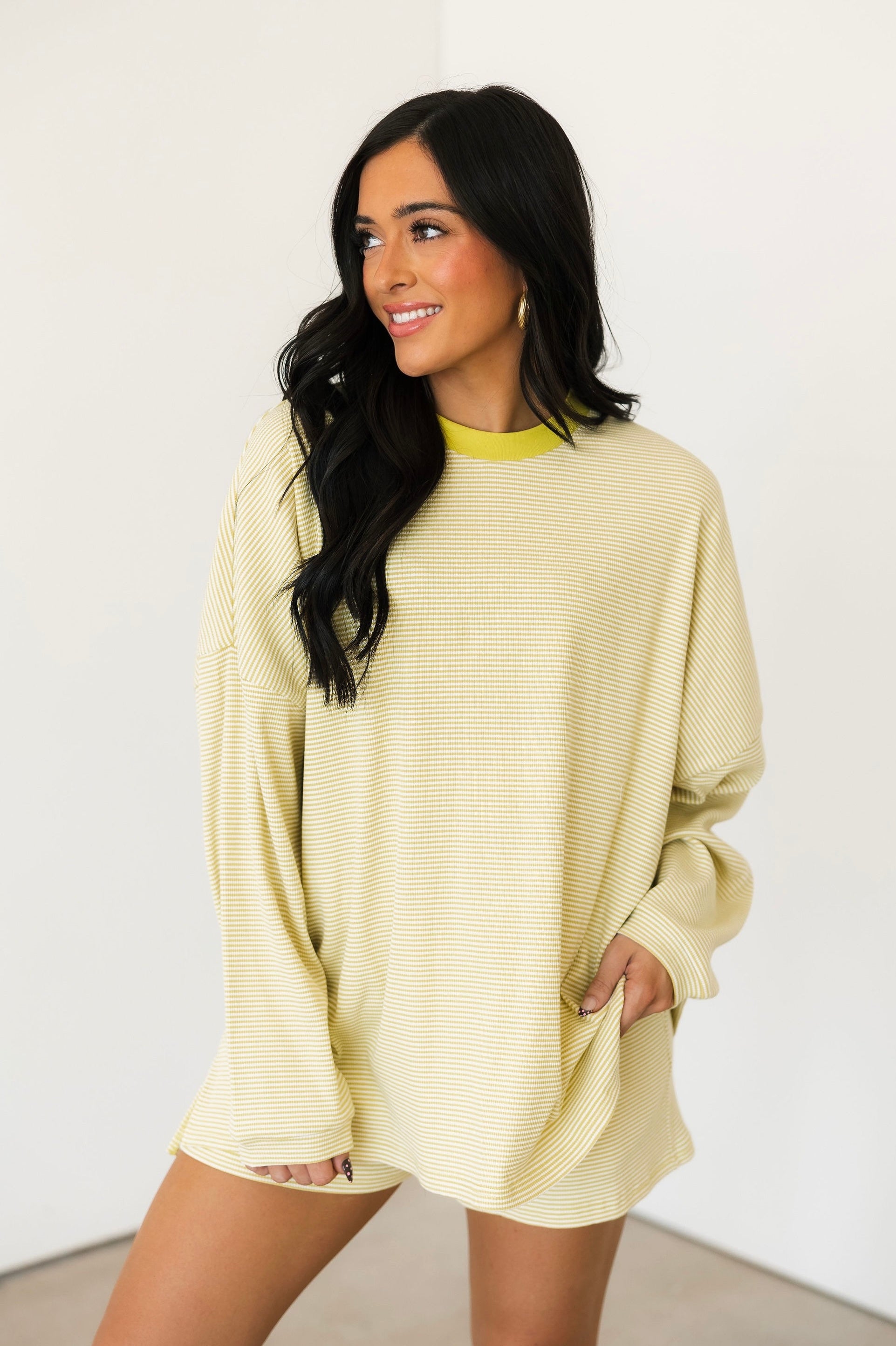 The Cassandra Long Sleeve in Matcha features a long sleeve striped top with long sleeves. This top is so soft and pairs perfectly with the matching bottoms. Perfect for an easy throw on and go outfit! Sage is wearing a S/M.