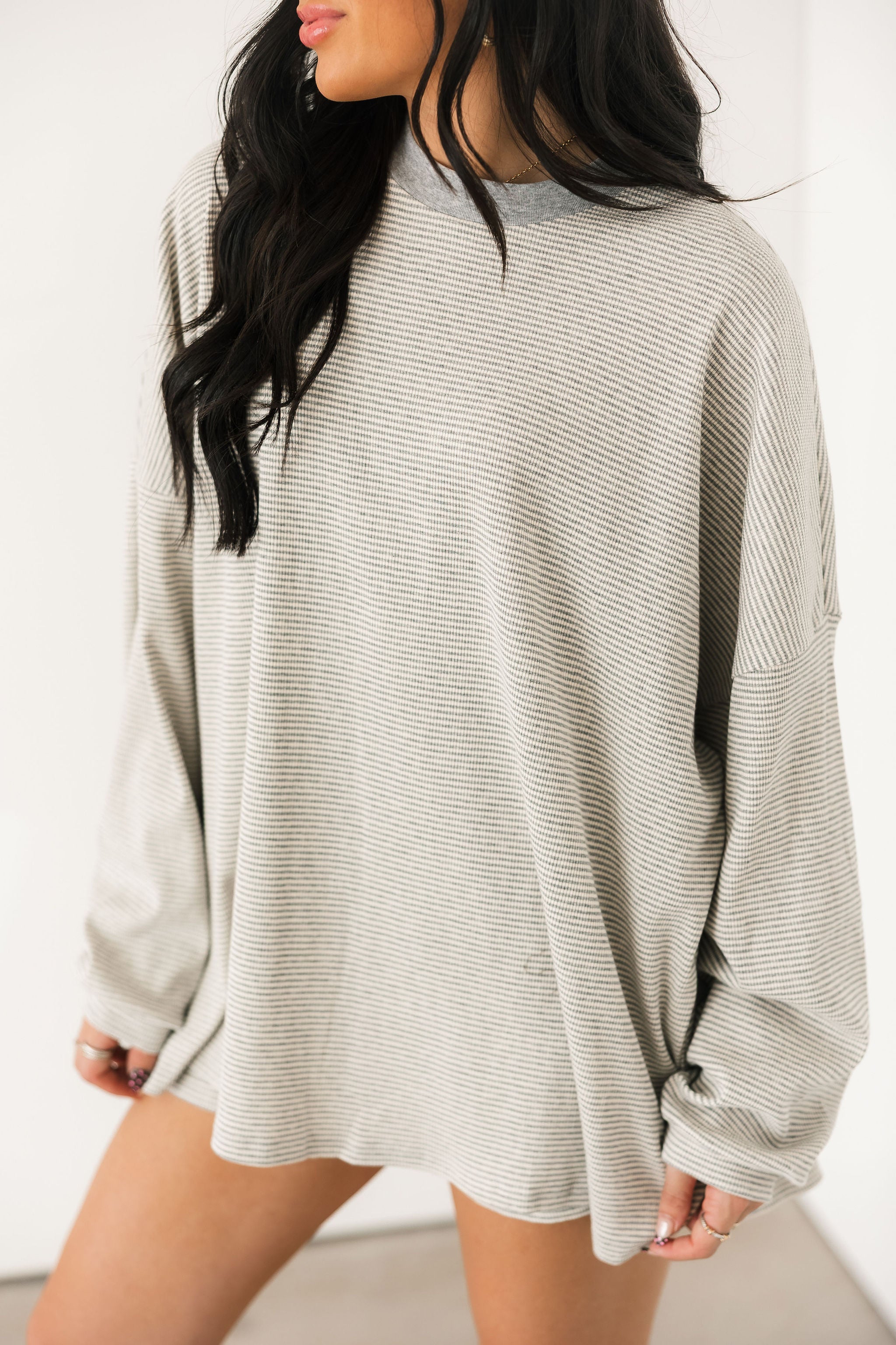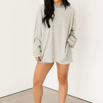 The Cassandra Long Sleeve in Heather Grey features a long sleeve striped top with long sleeves. This top is so soft and pairs perfectly with the matching bottoms. Perfect for an easy throw on and go outfit! Sage is wearing a S/M.