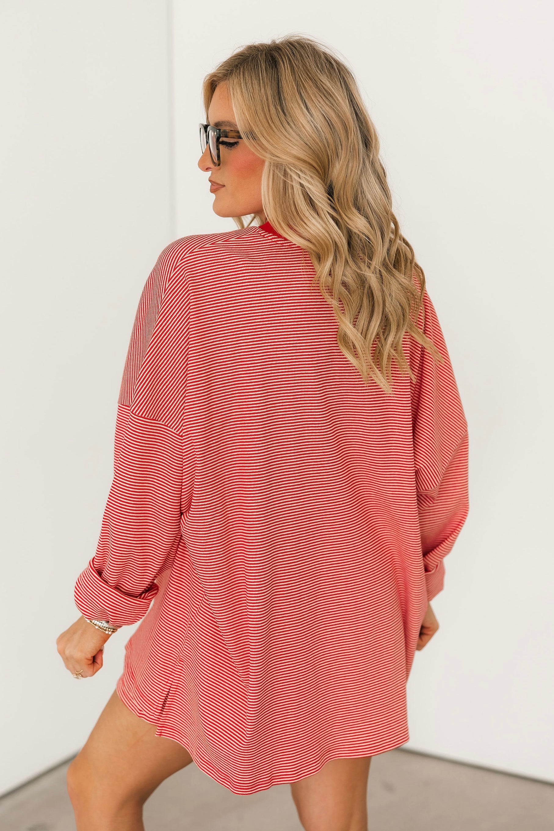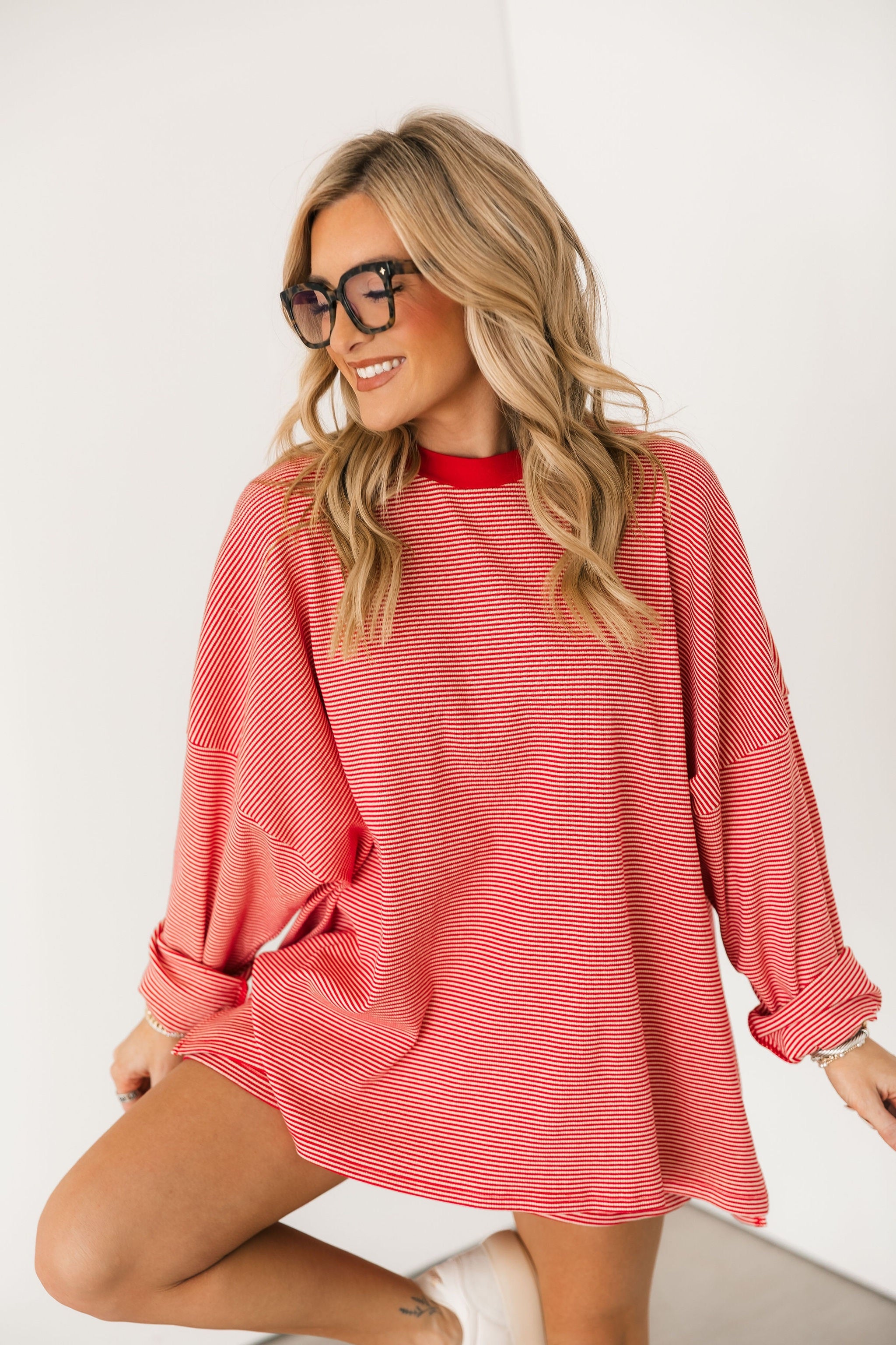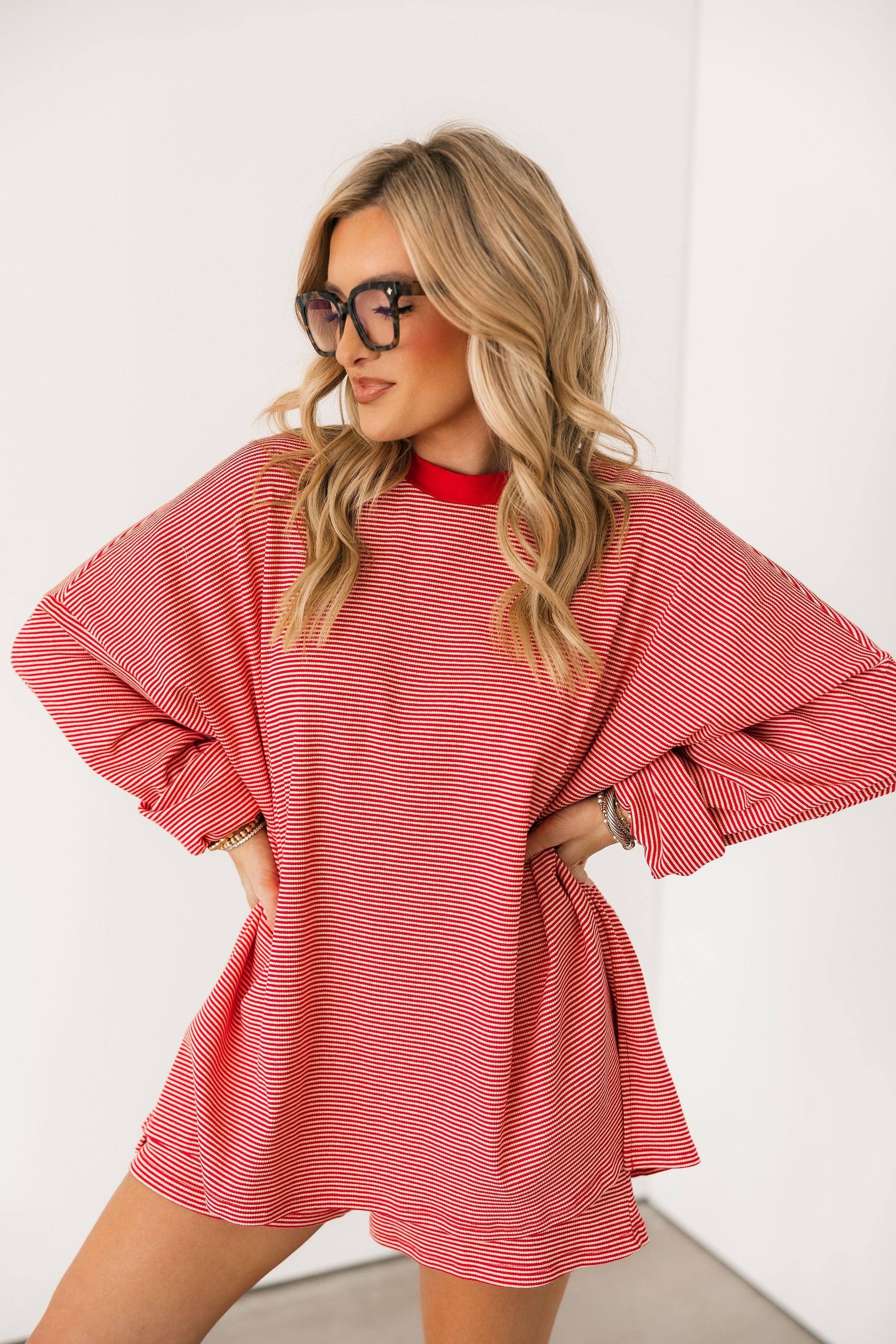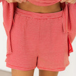 The Cassandra Striped Shorts in Red feature a soft, pull-on style with an elastic waistband for all-day comfort. They pair perfectly with the matching long sleeve, making them ideal for an easy, throw-on-and-go outfit! Lexi is wearing a small.