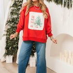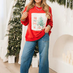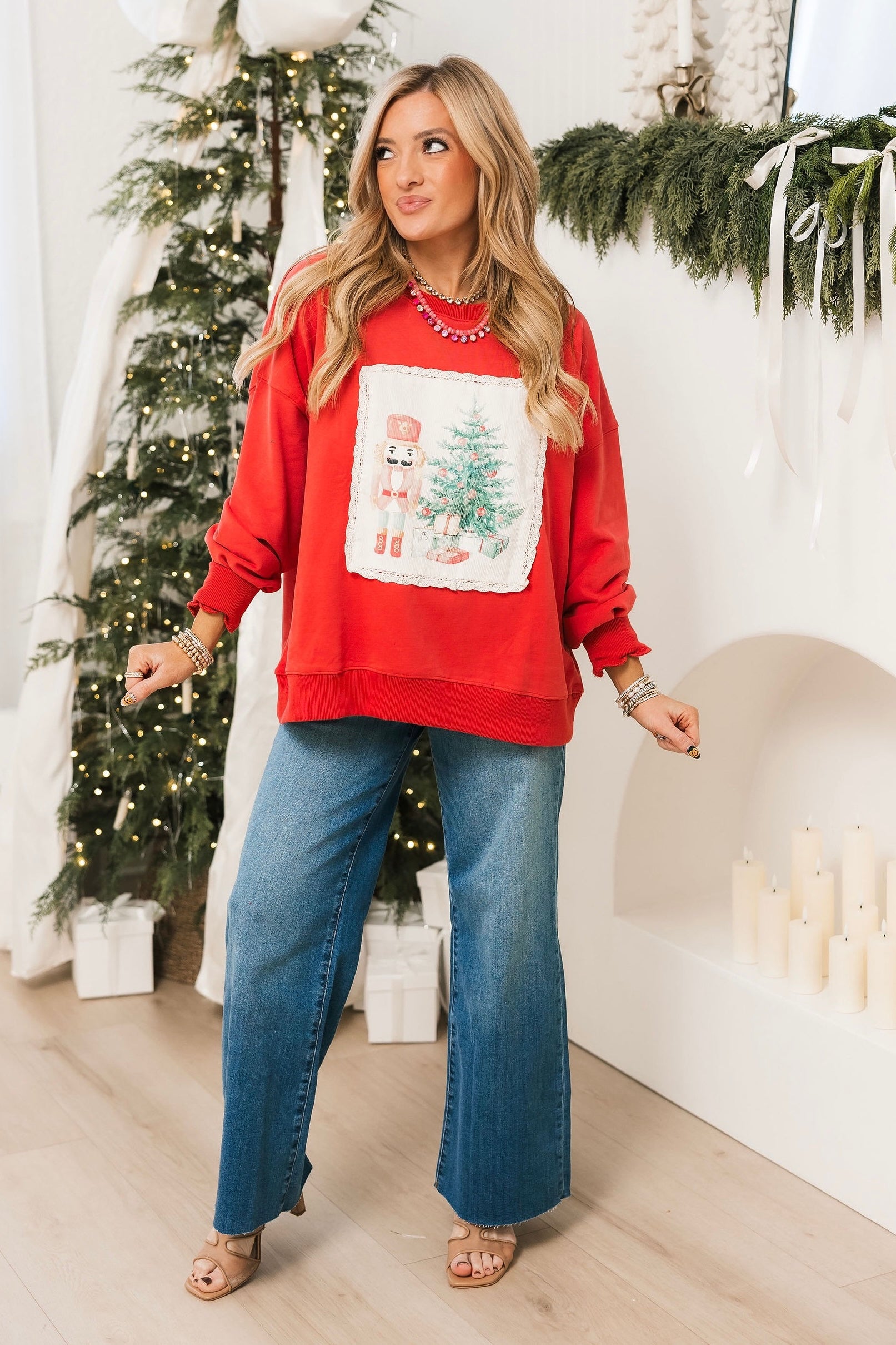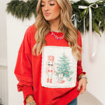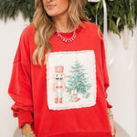 The Christmas Scenes Crewneck brings festive charm to your cozy wardrobe. Featuring a playful nutcracker next to a Christmas tree with gifts and delicate lace detailing, this relaxed crewneck is perfect for holiday lounging or casual celebrations. Lexi is wearing a small.
