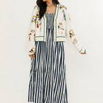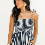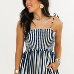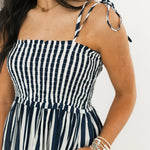 Easy, breezy, and effortlessly polished. This navy midi brings coastal charm with tied straps and a flattering fit—your go-to for boat days, brunch, or anything in between. Sage is wearing a small.