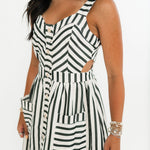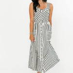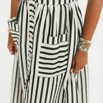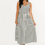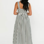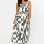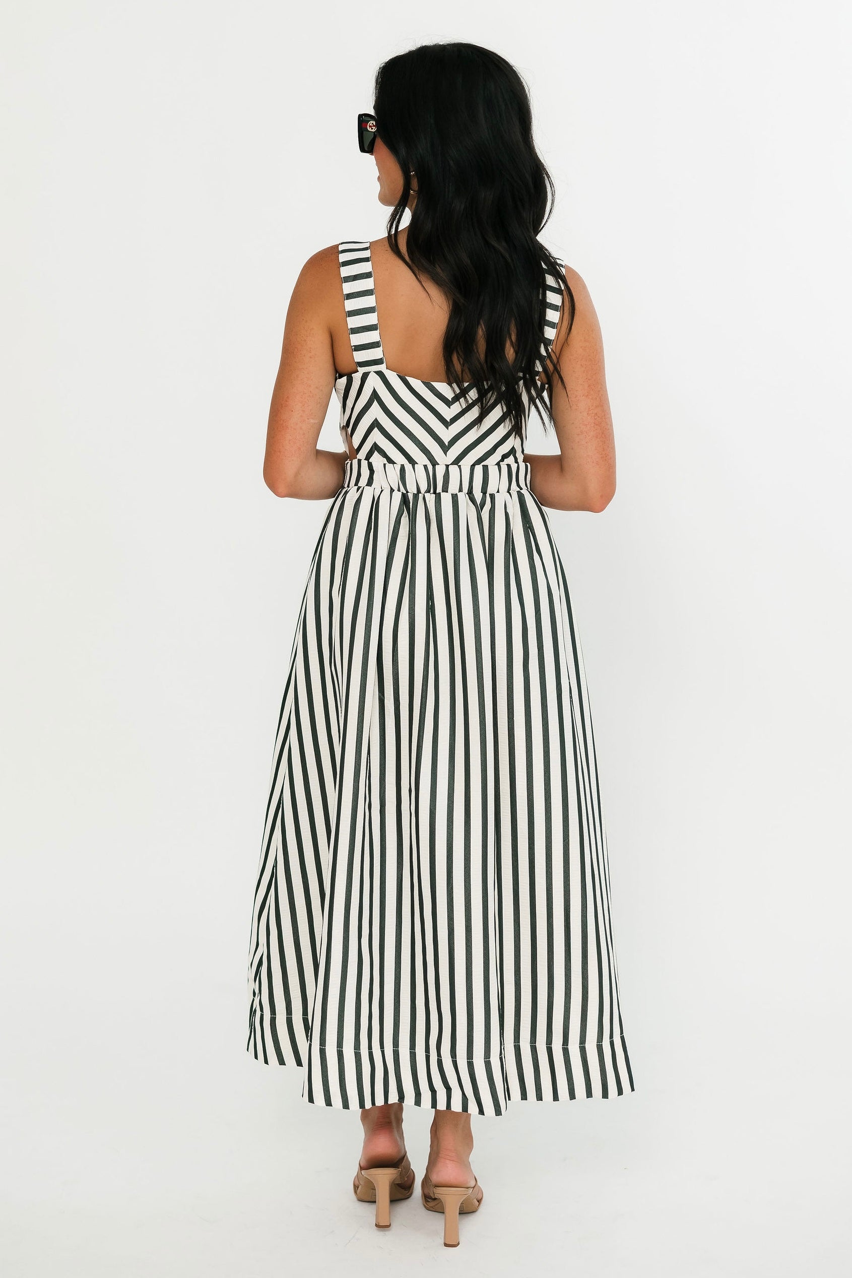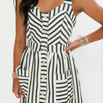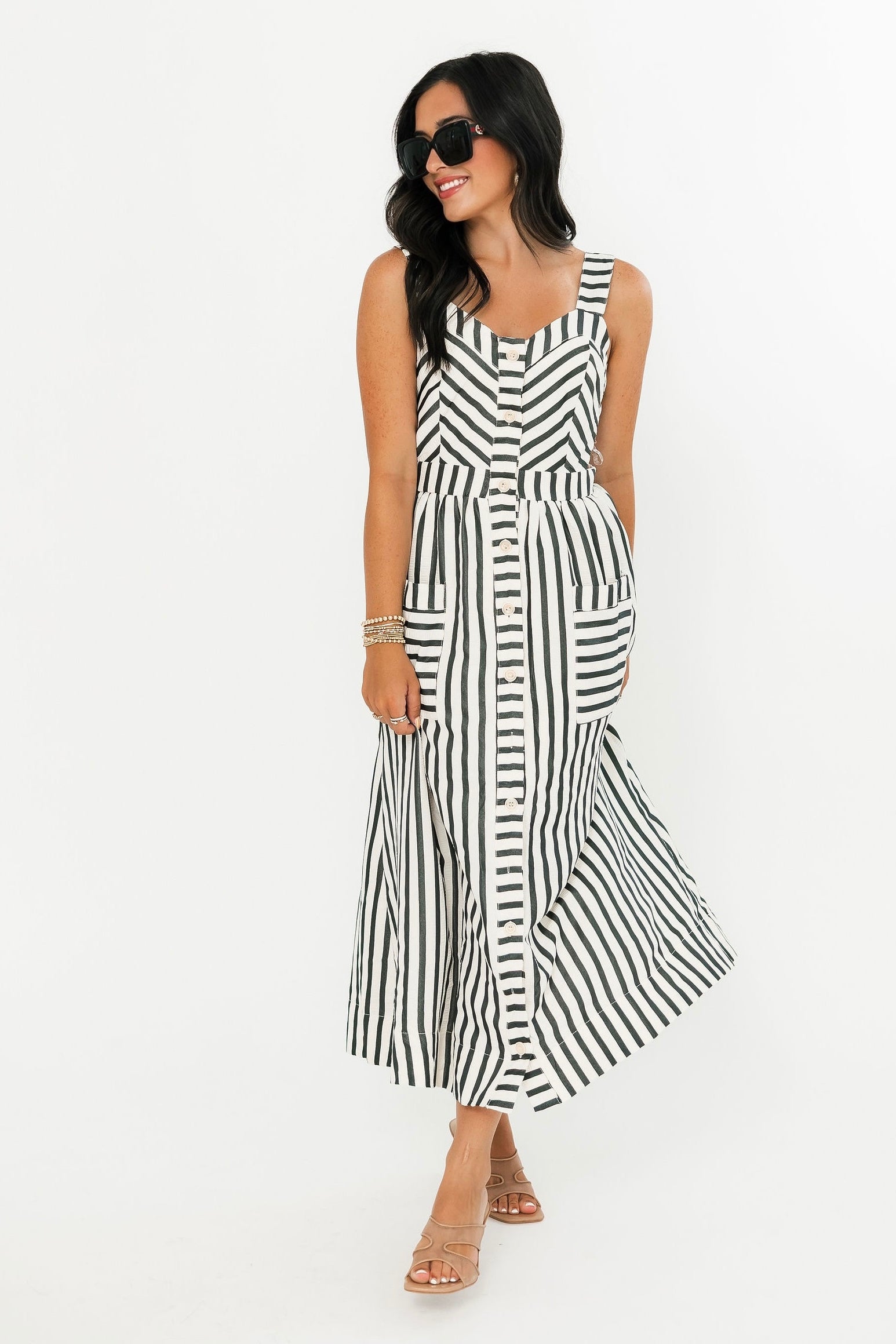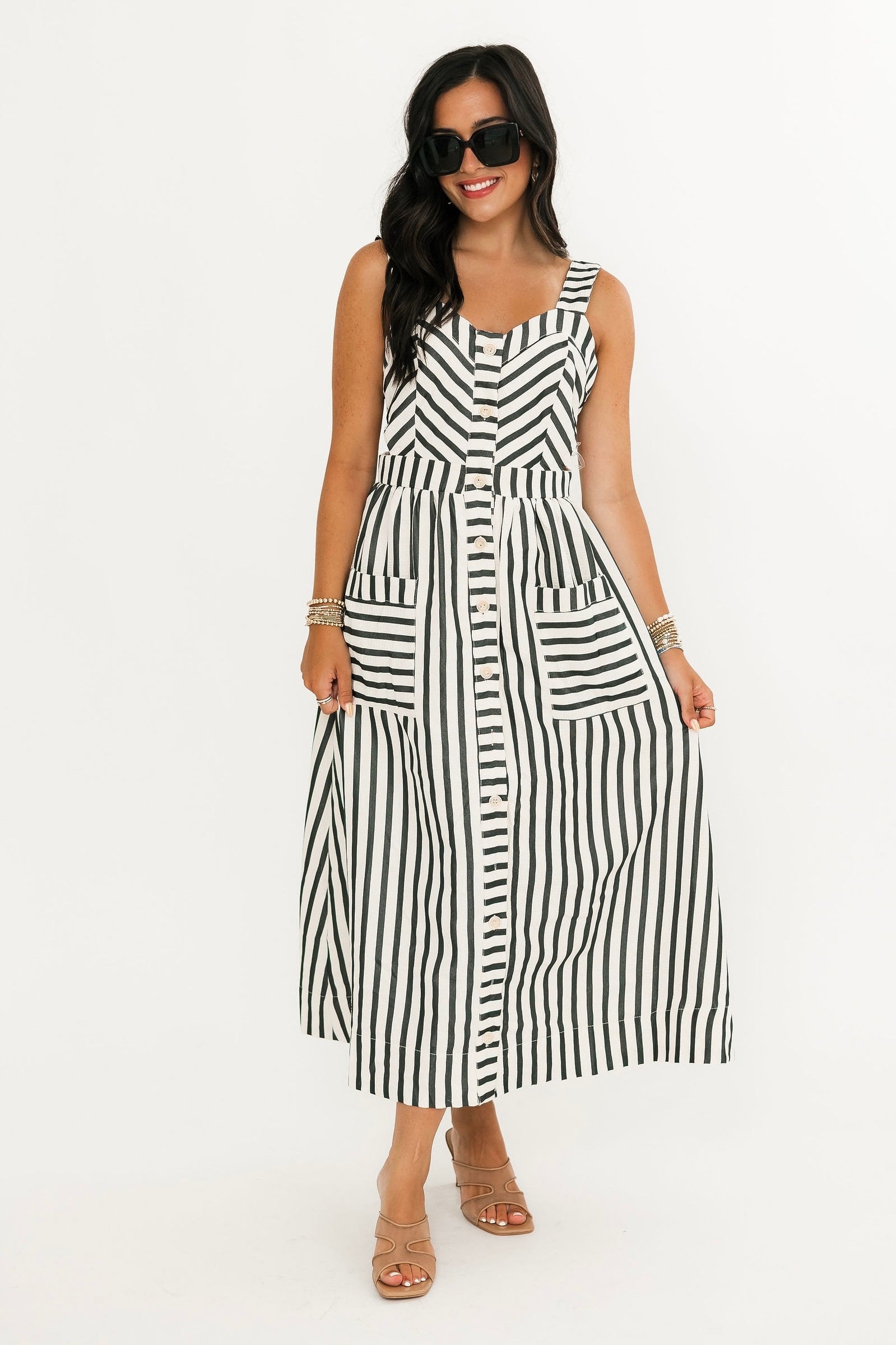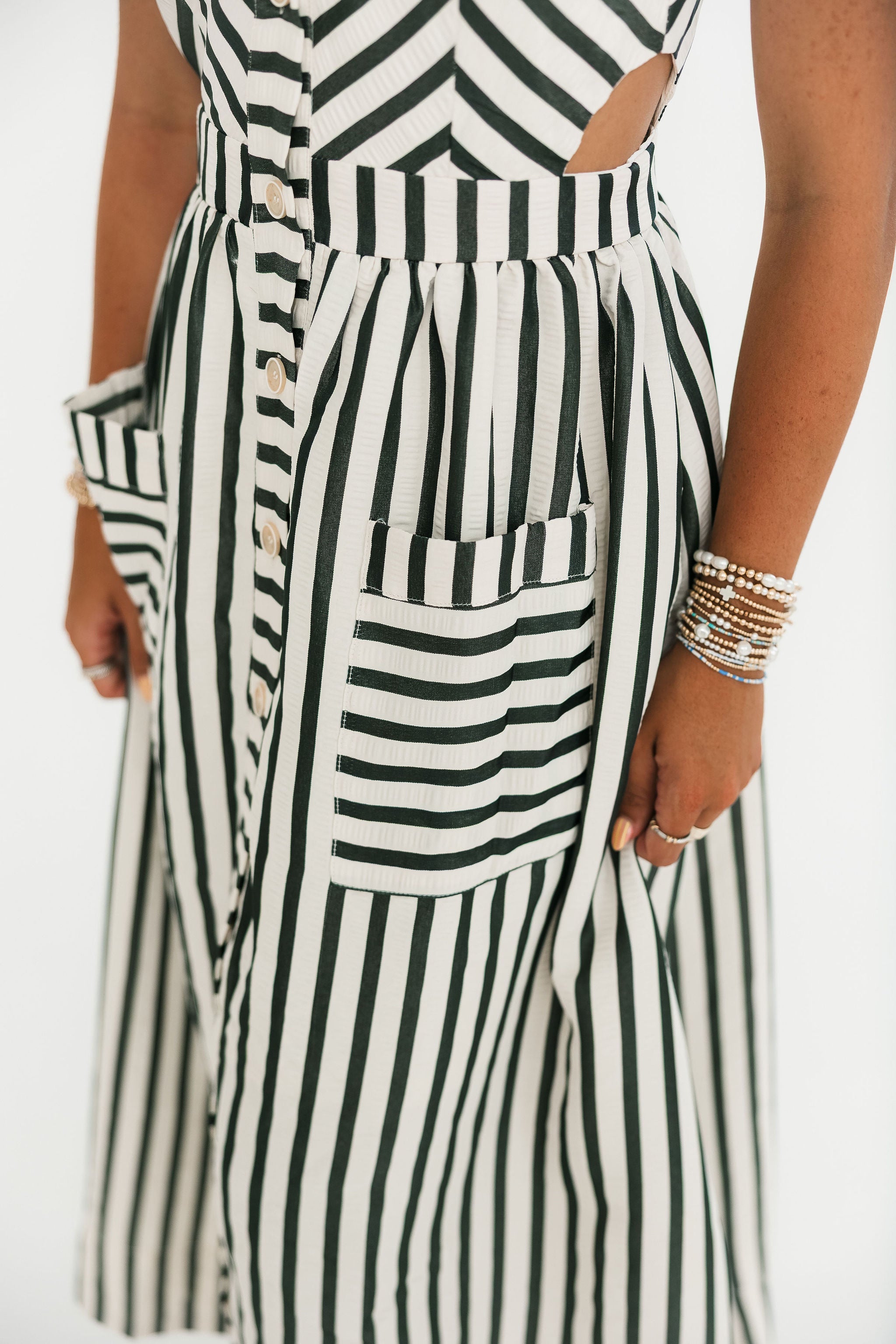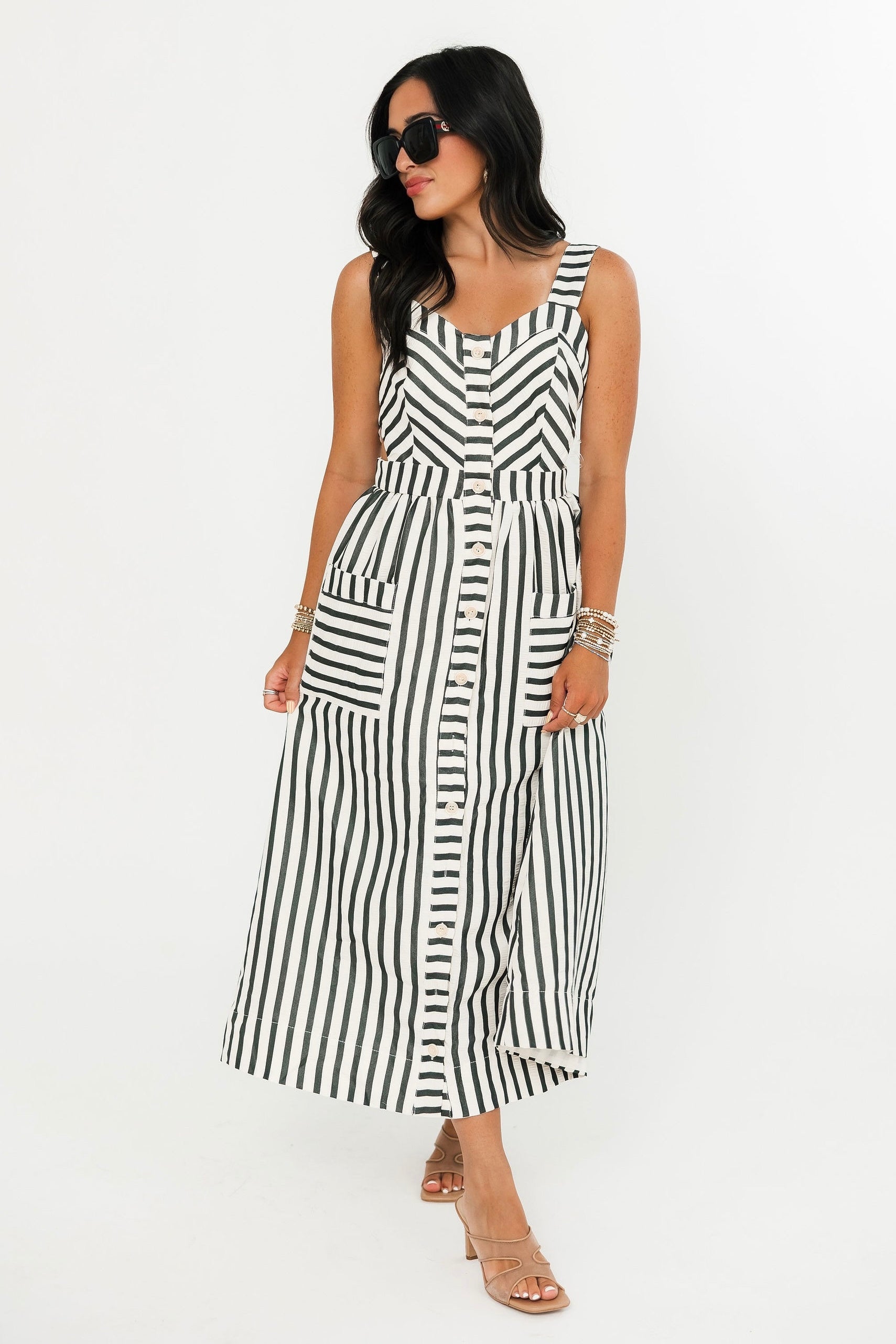A bold twist on a timeless silhouette, the Class Act Stripe Midi Dress features a flattering fitted bodice with chevron paneling and a flowy, pocketed skirt. The thick straps and button-front detail give it a structured, vintage-inspired feel—perfect for sunny strolls or brunch with the girls. Sage is wearing a small.