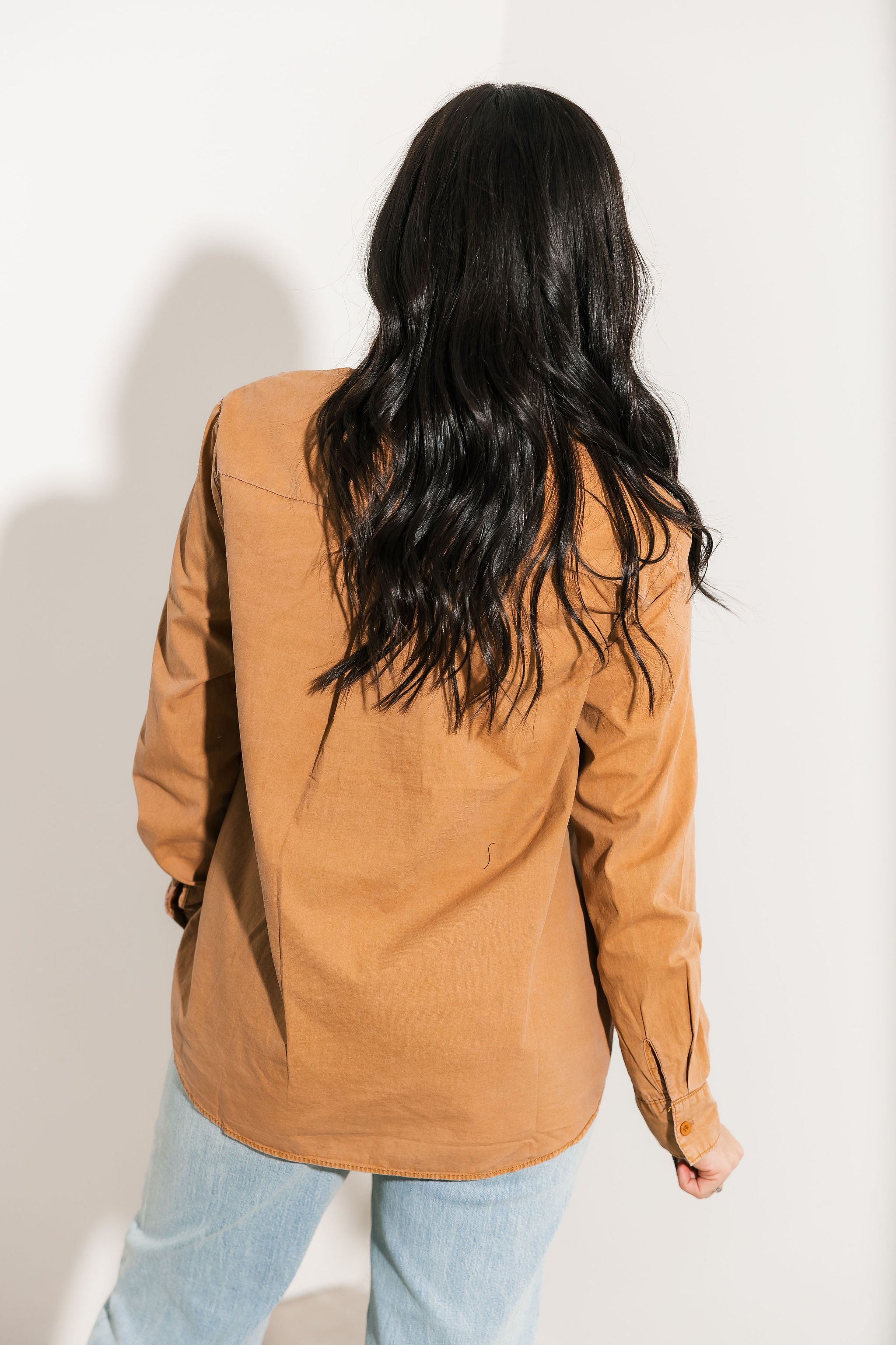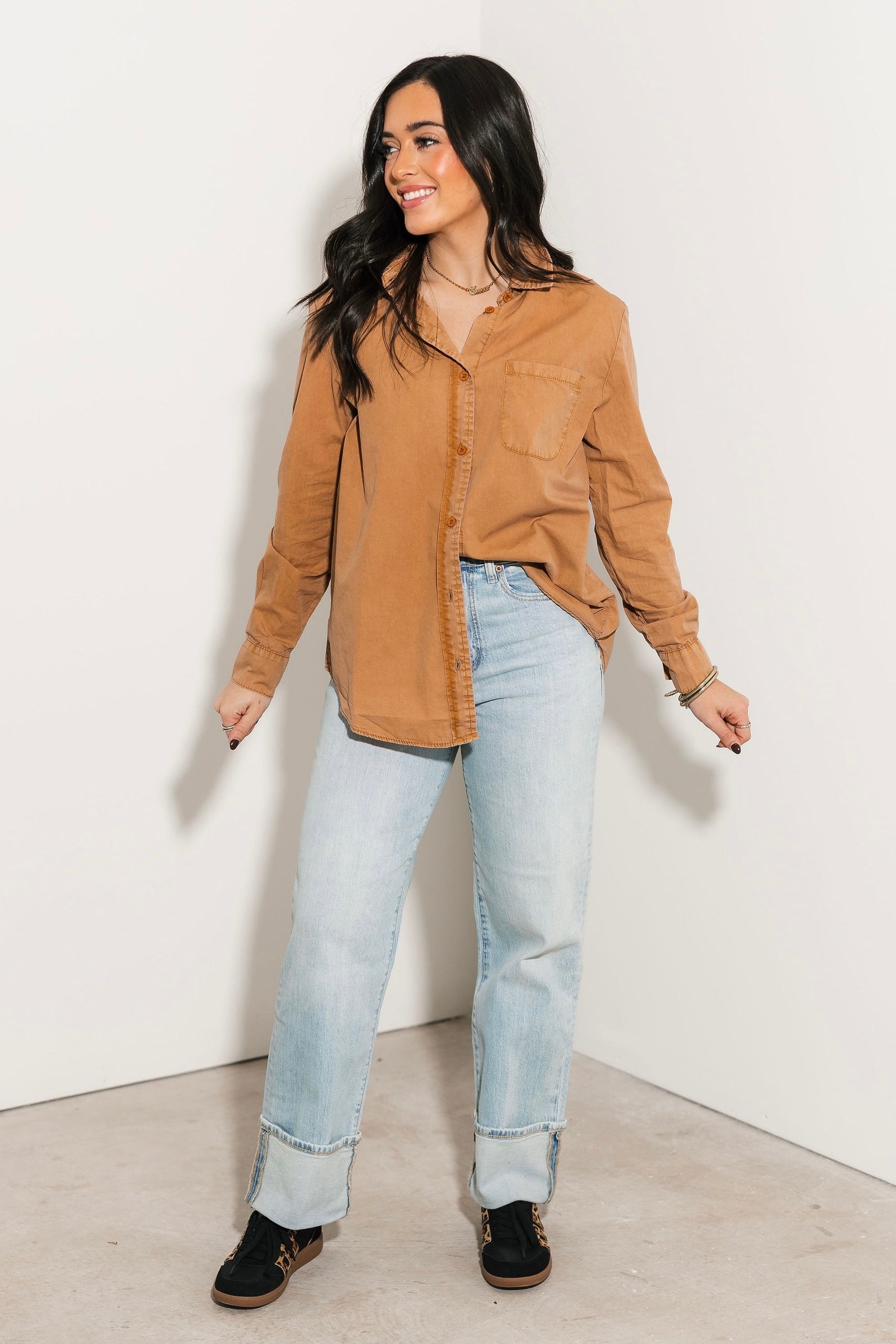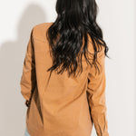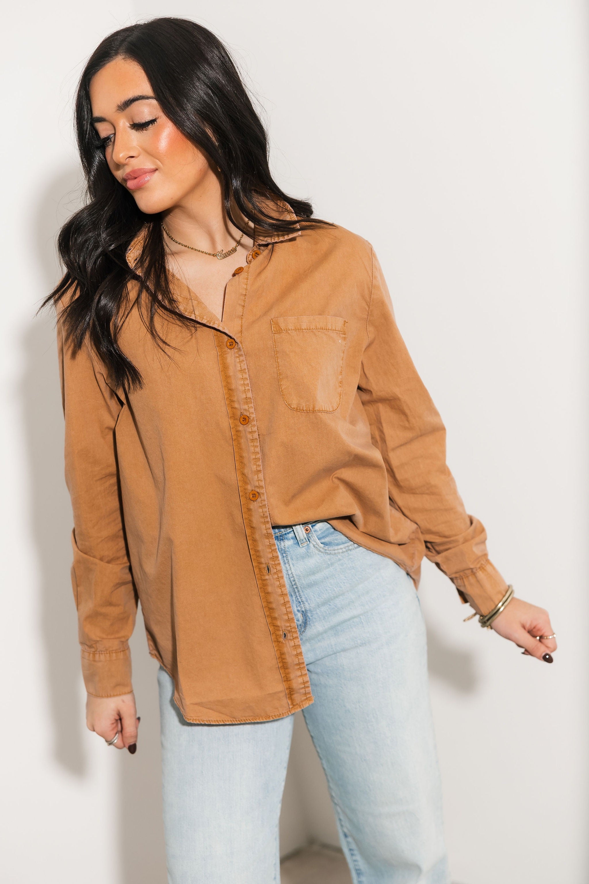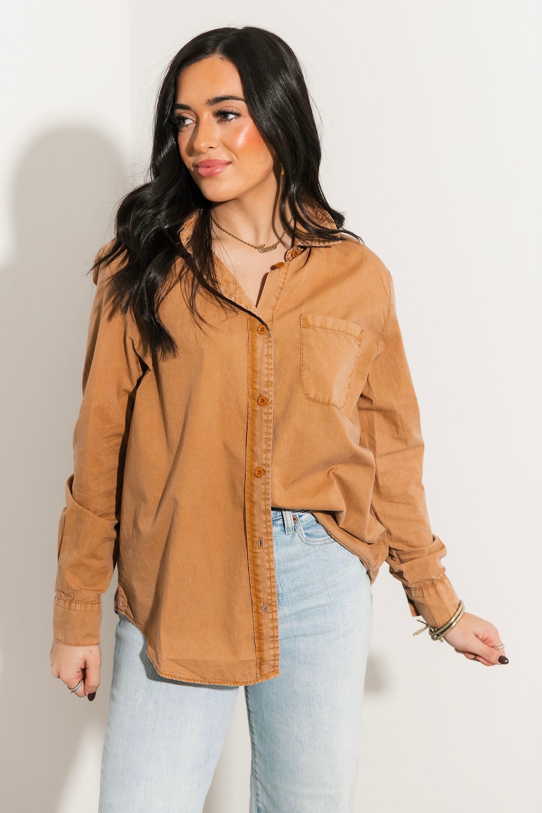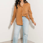 The Classic Button Up in Camel features a collared neckline, long sleeves, and a functional front pocket. With its relaxed silhouette and soft fabric, it’s perfect for layering, everyday wear, or dressing up or down with ease. Sage is wearing a small.