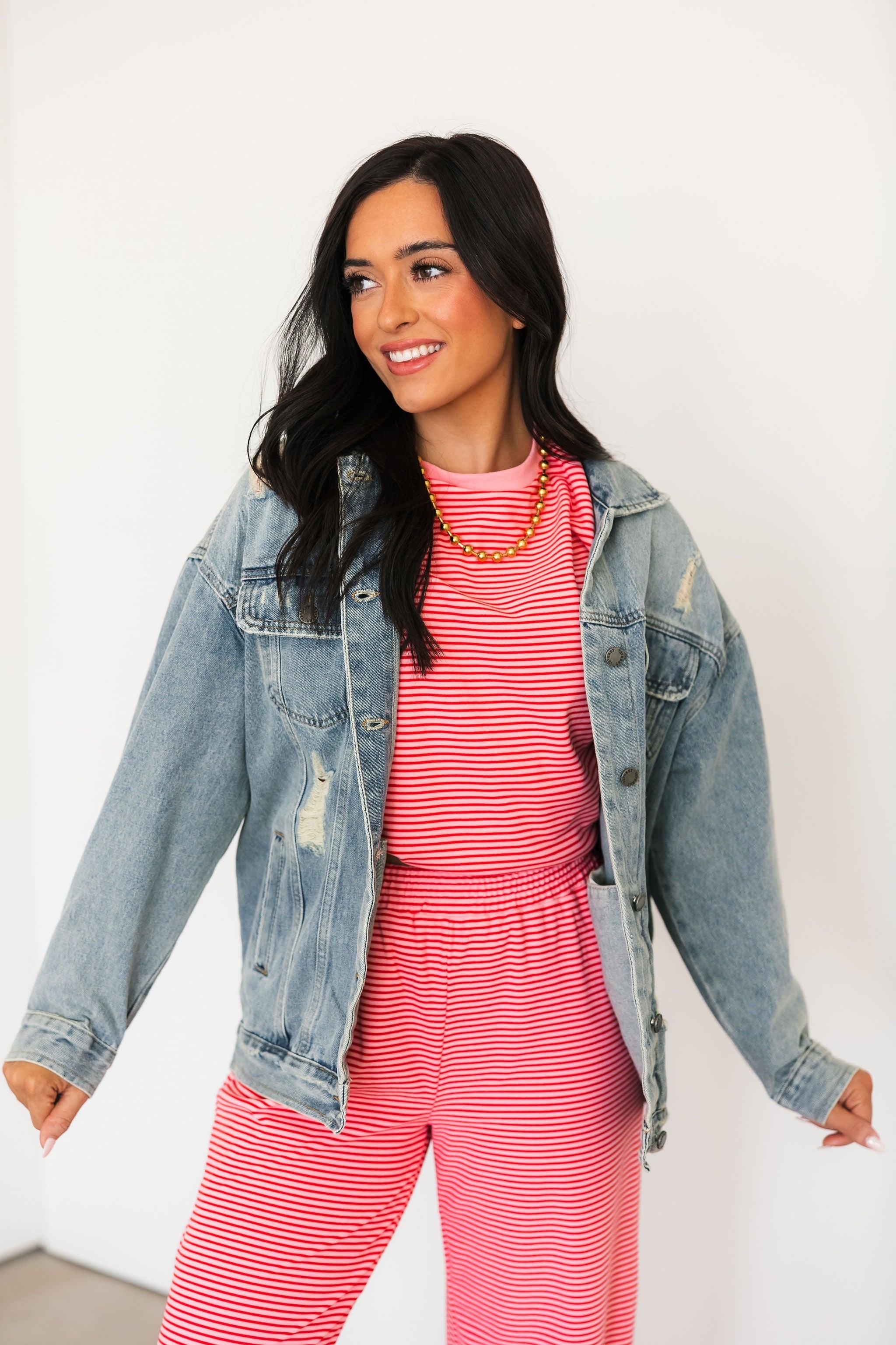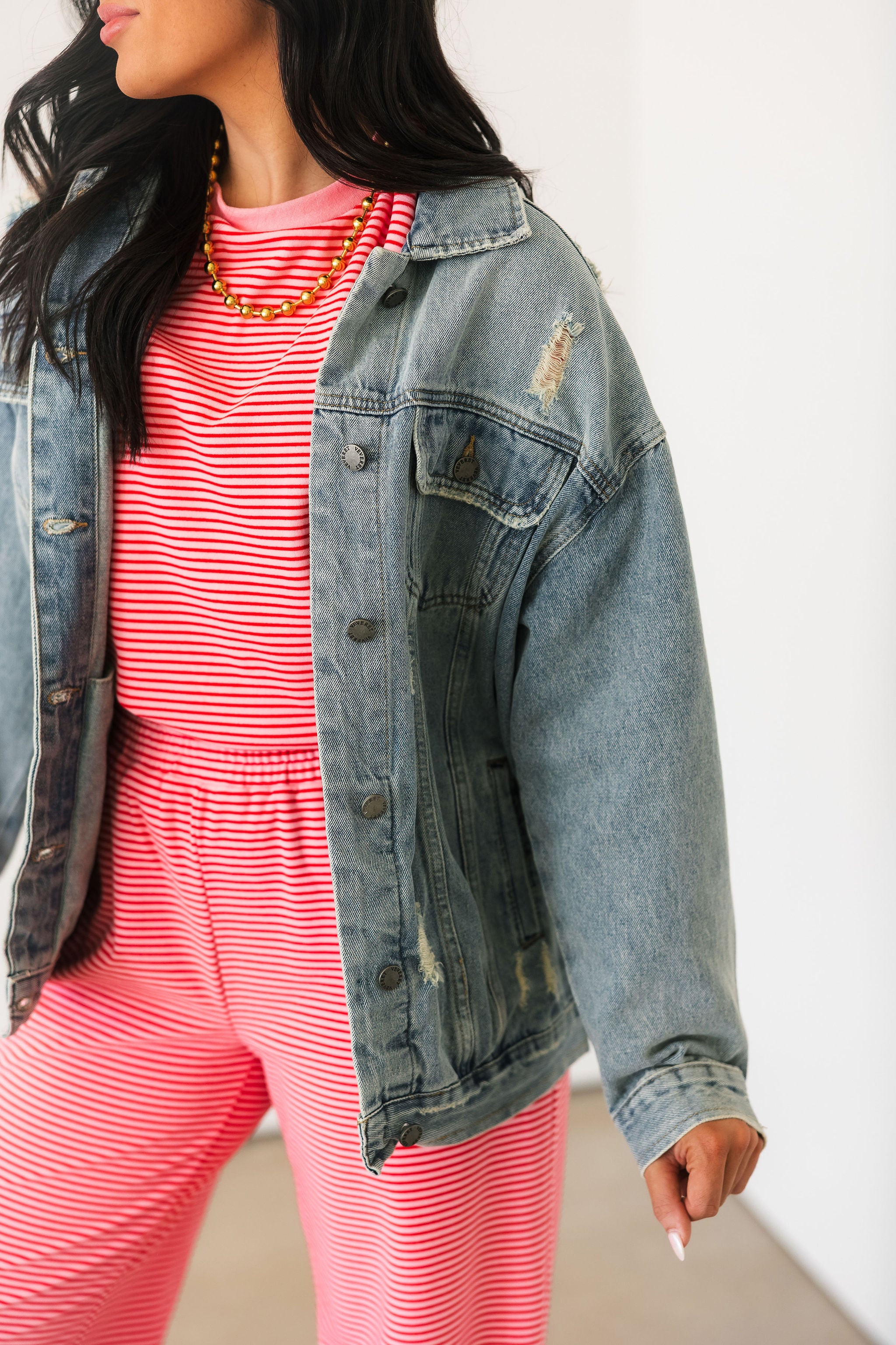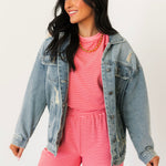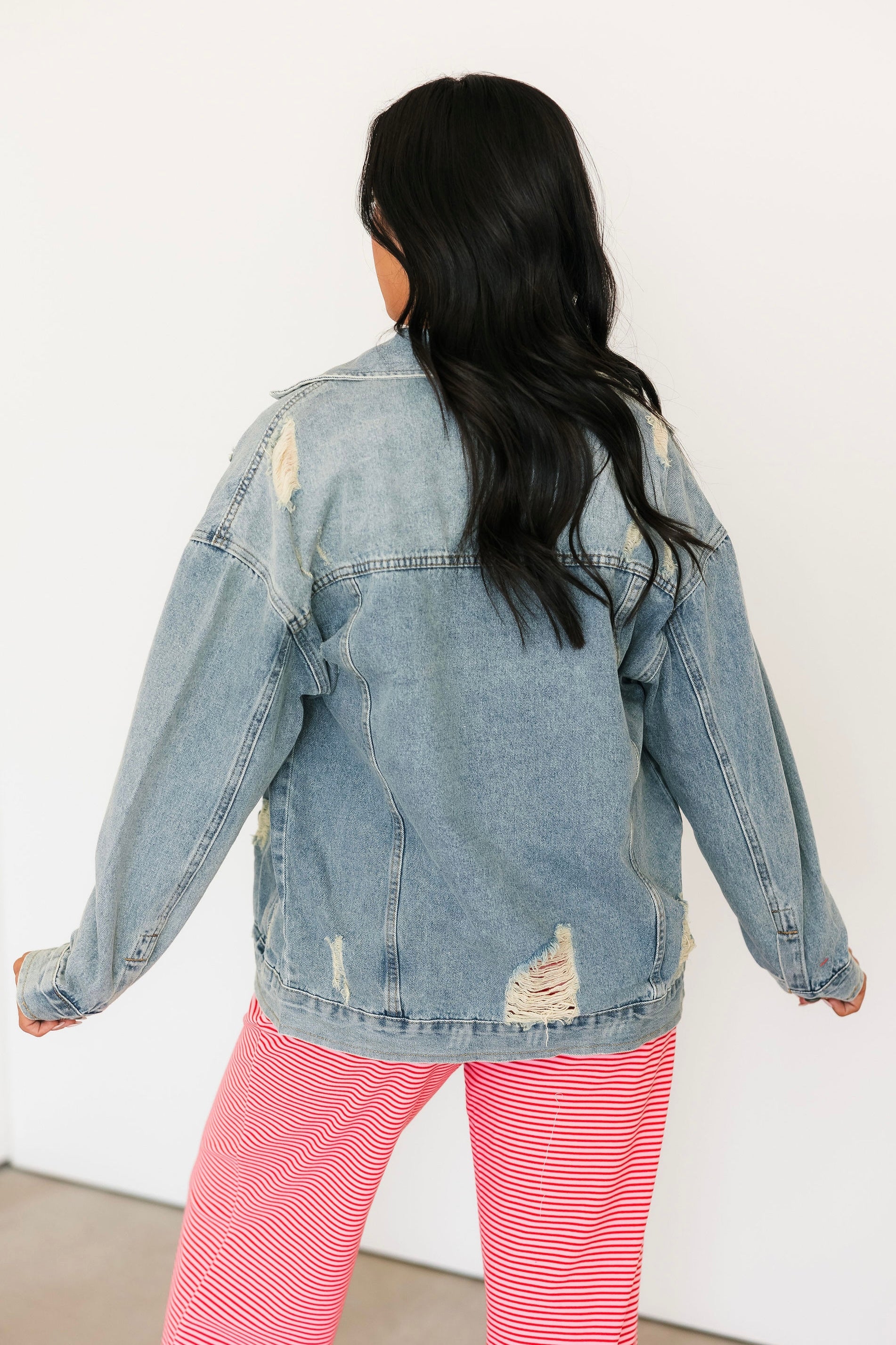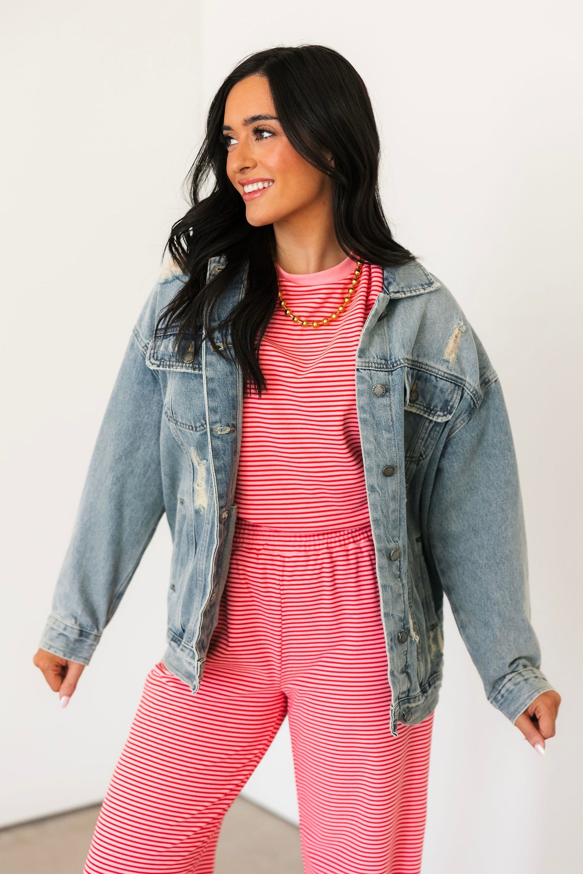 Everyone needs a good denim jacket and we are obsessed with this one. With the light wash and distressed detailing this is a timeless piece that is so easy to style with anything from dresses to a denim on denim moment.